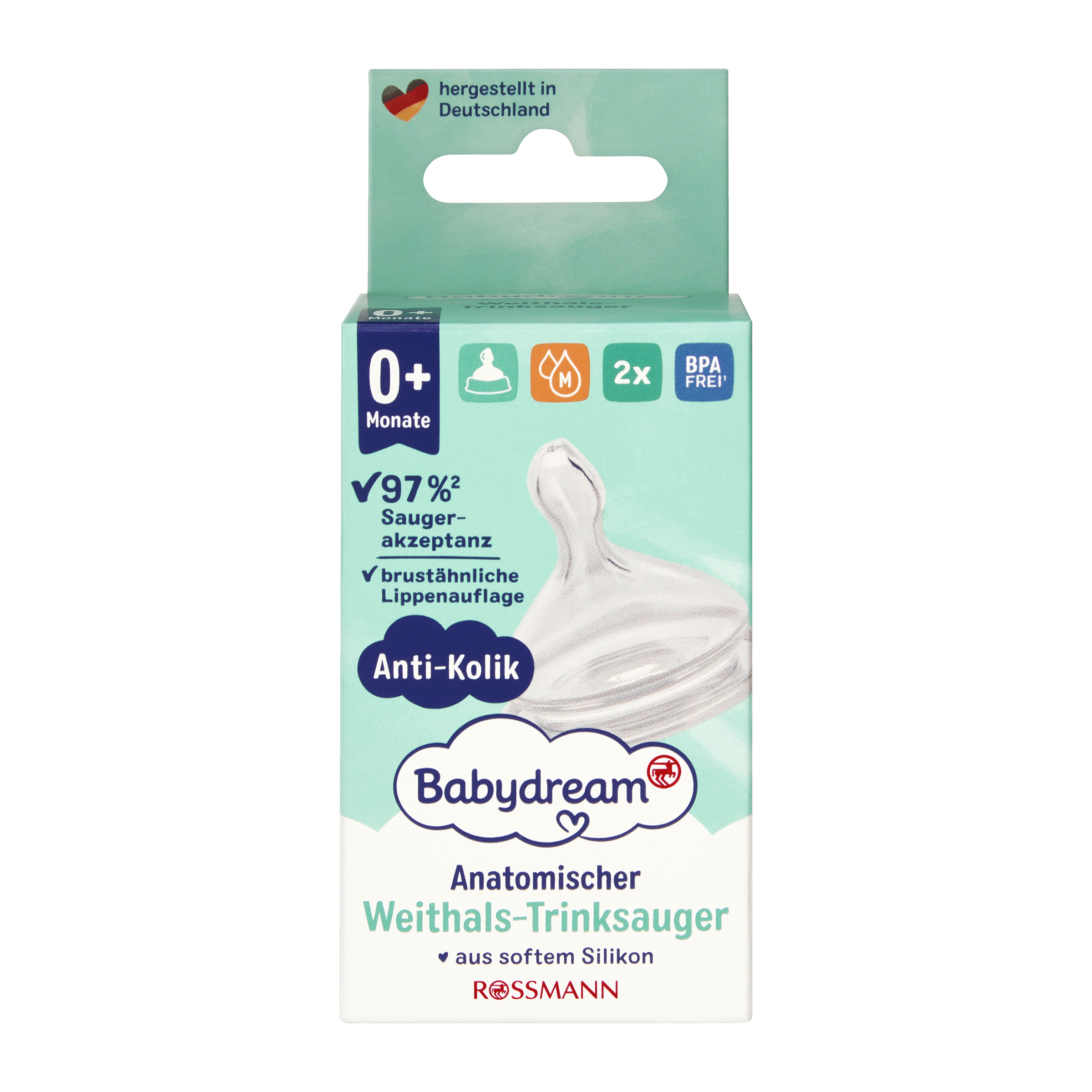 Naše silikonová savička s širokým hrdlem se snadno nasadí na všechny láhve s širokým hrdlem Babydream.