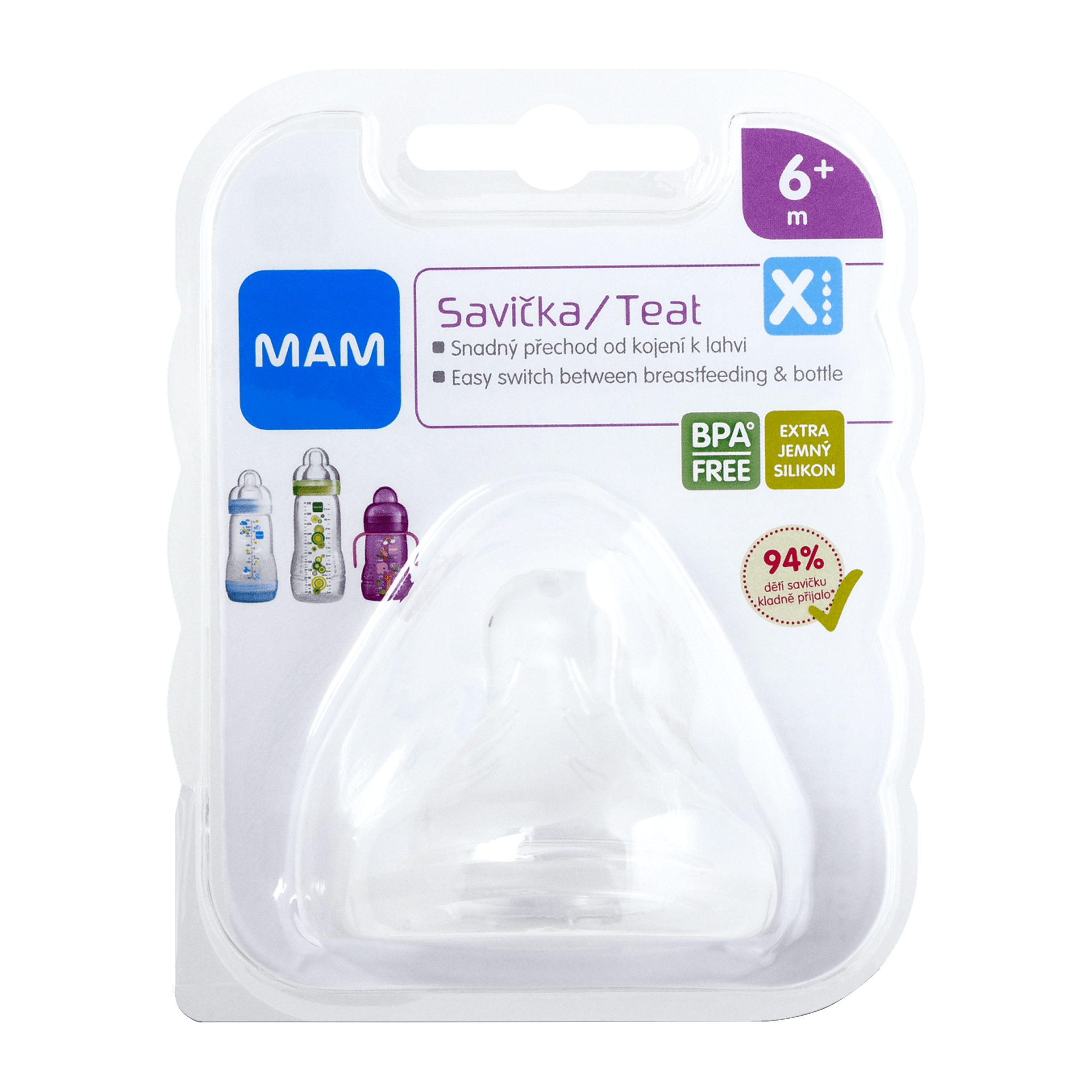 Sametově jemná savička s průtokem na kašovitou stravu, která se doporučuje používat od 6. měsíce. MAM sametová savička usnadňuje přechod od kojení k láhvi. Prokázaný účinek: 94 % dětí přijímá MAM savičku jemnou jako pokožka (průzkum trhu 2008-2010, testováno 995 dětmi). Savička jemná jako pokožka má patentovaný hedvábně měkký povrch, který mají děti instinktivně rády, protože je na dotek tak důvěrně známá. Vždy se dokonale přizpůsobí dětským ústům.