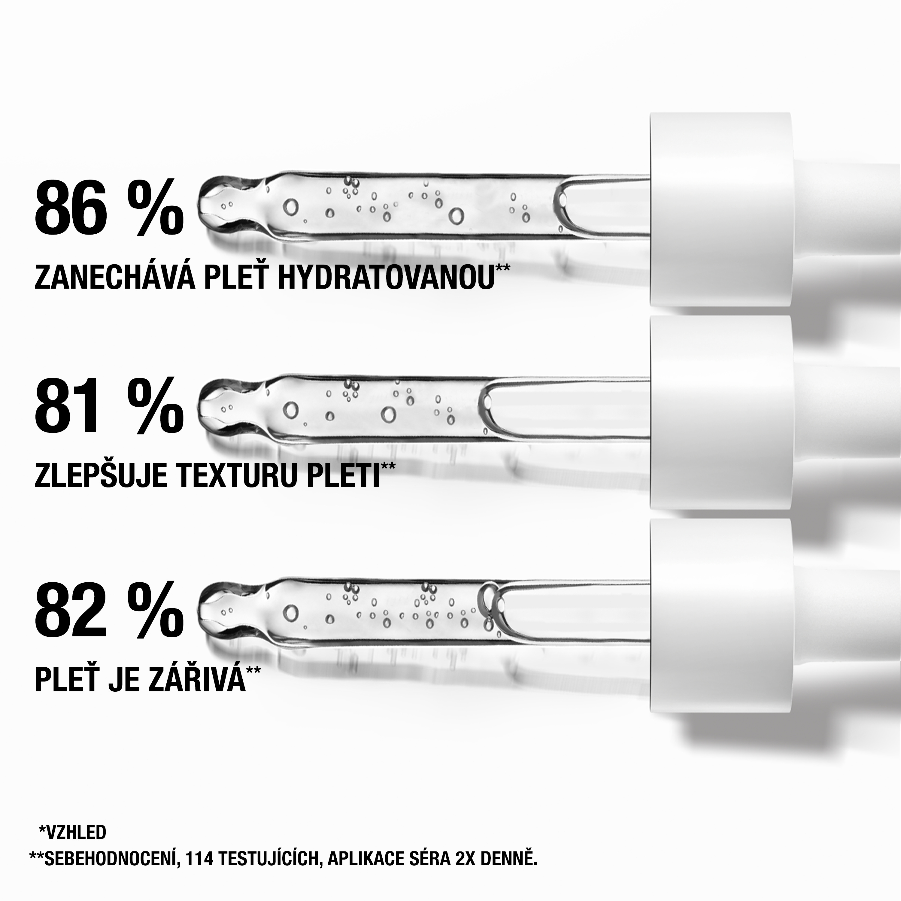 - Po prvním použití: 86 % testujících cítilo, že jejich pleť je hydratovaná 87 % testujících cítilo, že jejich pleť je hladká.