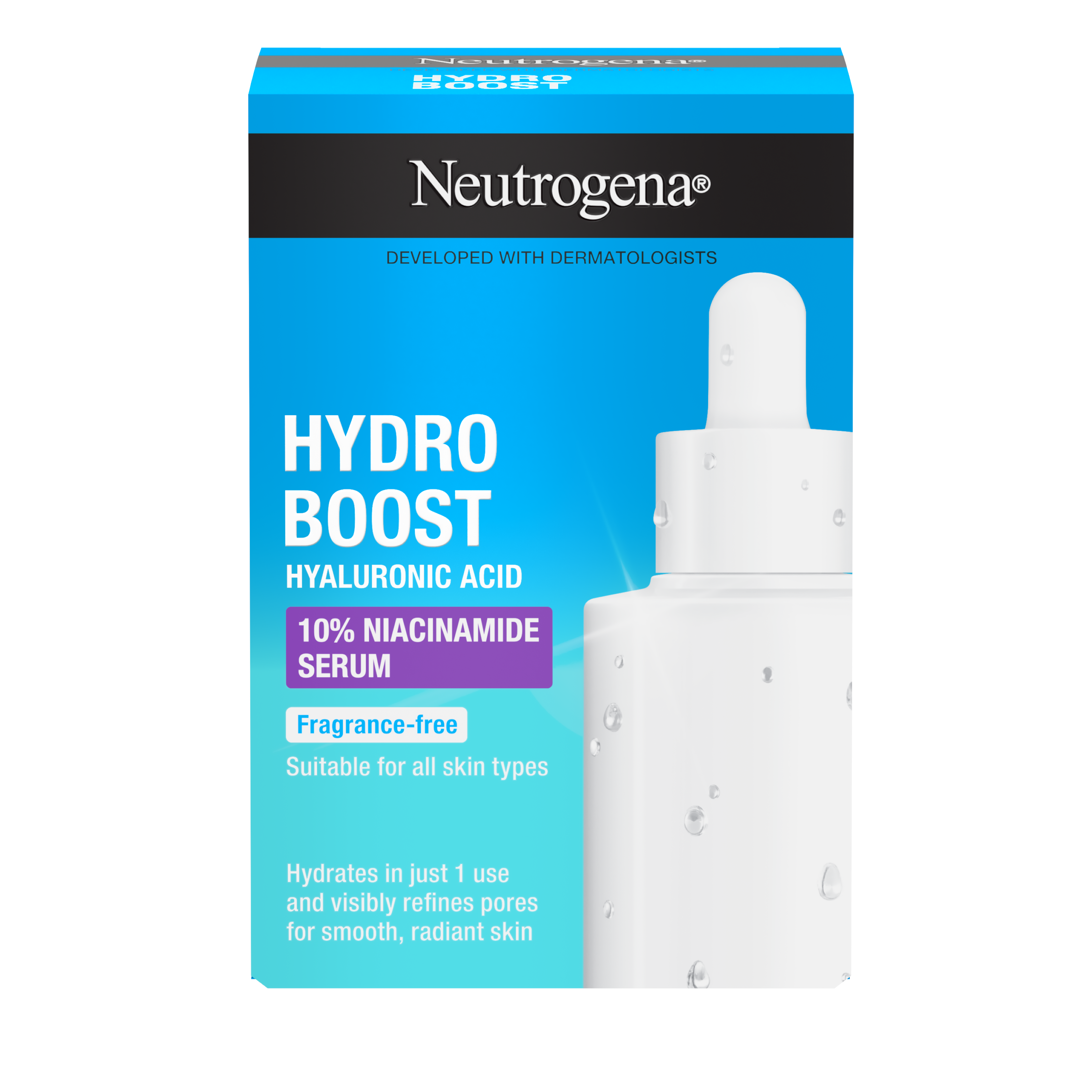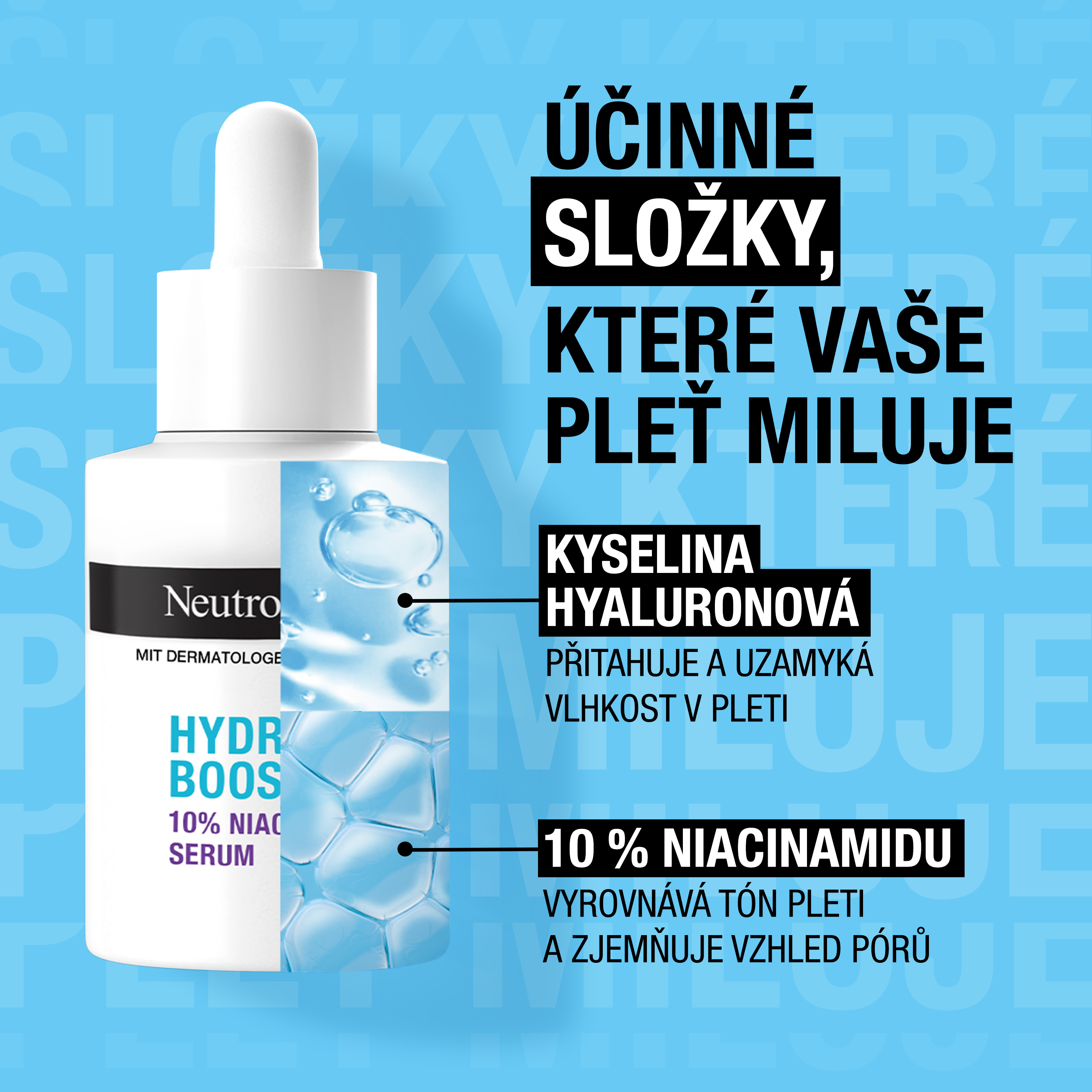 Vhodné pro všechny typy pleti, včetně citlivé pleti. Toto víceúčelové sérum hydratuje a exfoliuje pleť, čímž zjemňuje vzhled pórů a dodává pleti čistší vzhled. Navíc viditelně zlepšuje matnou a nerovnoměrnou strukturu pleti a dodává jí hladkost a zářivost. Naše dermatologicky testované složení obsahuje: Kyselinu hyaluronovou, která pomáhá zadržovat vodu a zvyšuje hydrataci pleti. 10 % čistého niacinamidu, formu vitaminu B3, o kterém je známo, že viditelně zlepšuje nerovnoměrnou strukturu pleti a její vzhled.