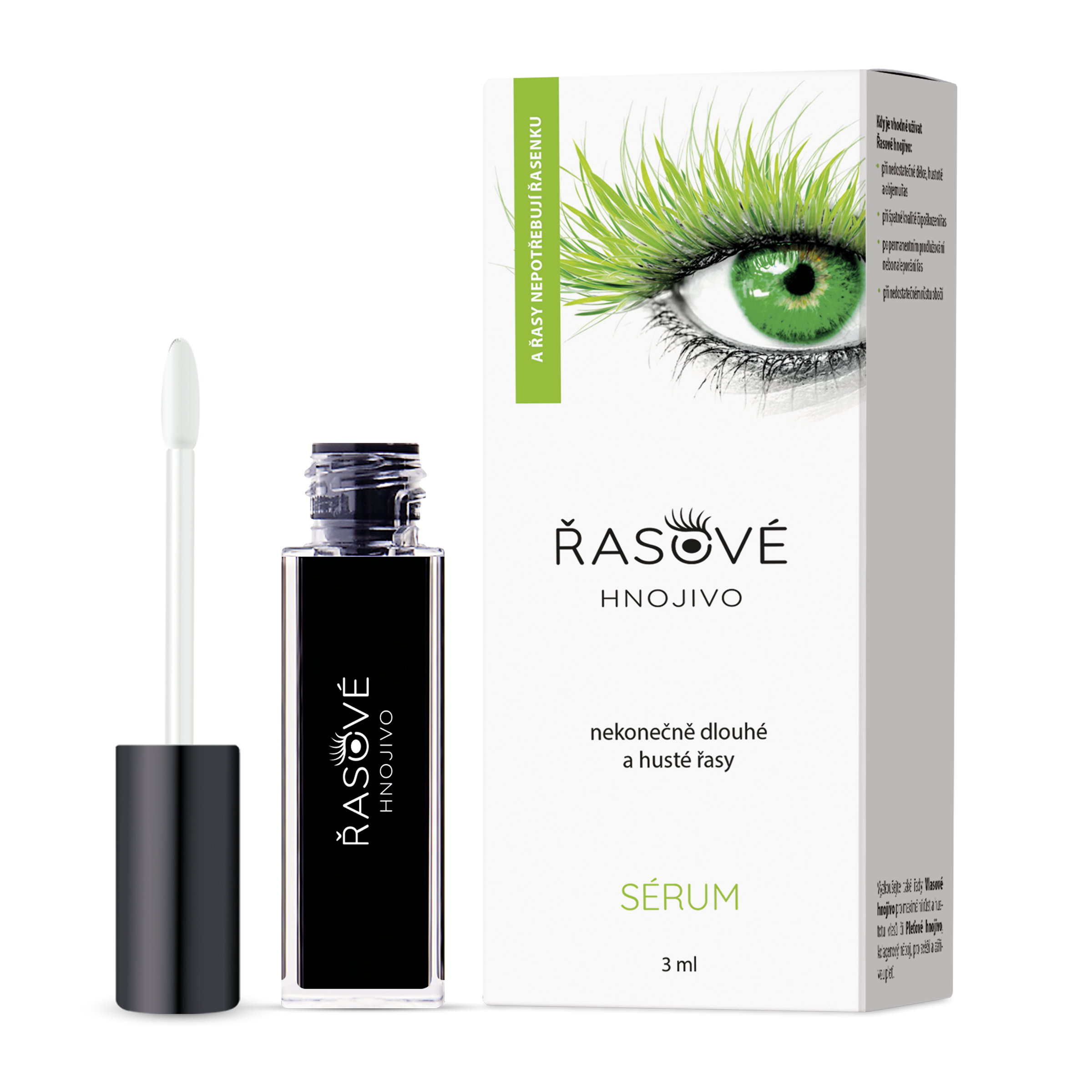 Řasové hnojivo sérum představuje koncentrovanou výživu a péči pro řasy a obočí. Mimořádně účinné složení séra spojuje jedinečnou přírodní složku, isoflavon Genistein, zodpovědnou za podporu růstu řas i obočí, s příznivými účinky kofeinu, kreatinu a biotinu. Složení je navíc doplněno o panthenol, který řasám zajišťuje intenzivní hydrataci a podporuje jejich maximální pevnost a pružnost. Výsledkem pravidelné aplikace Řasového hnojiva jsou nekonečně dlouhé, husté a pružné řasy s fascinujícím objemem. Sérum je vhodné také pro podporu růstu či zvýraznění chloupků obočí, například při jeho nedostatečném růstu či nešetrném protrhání.