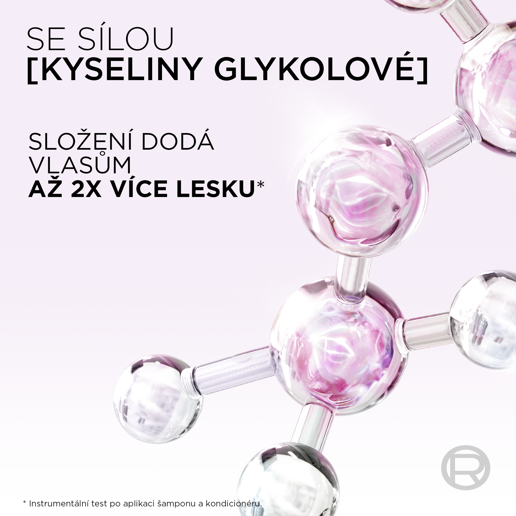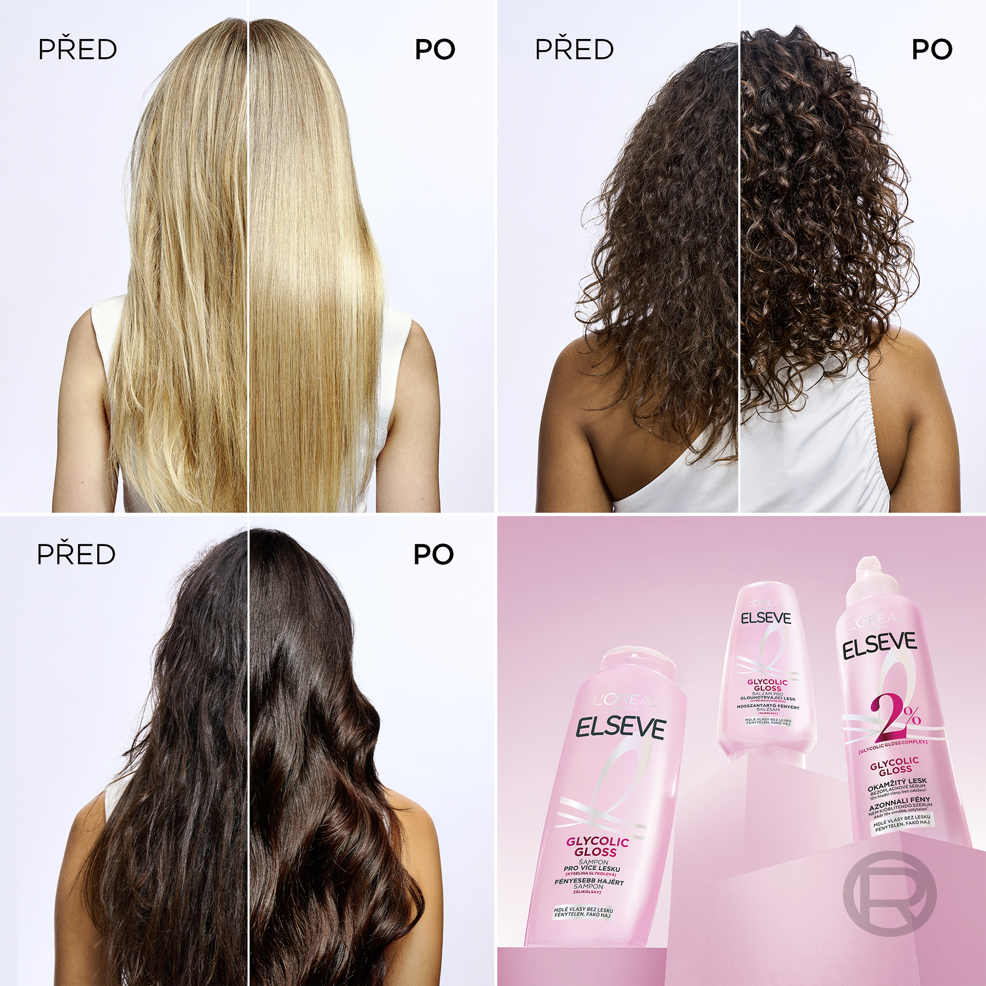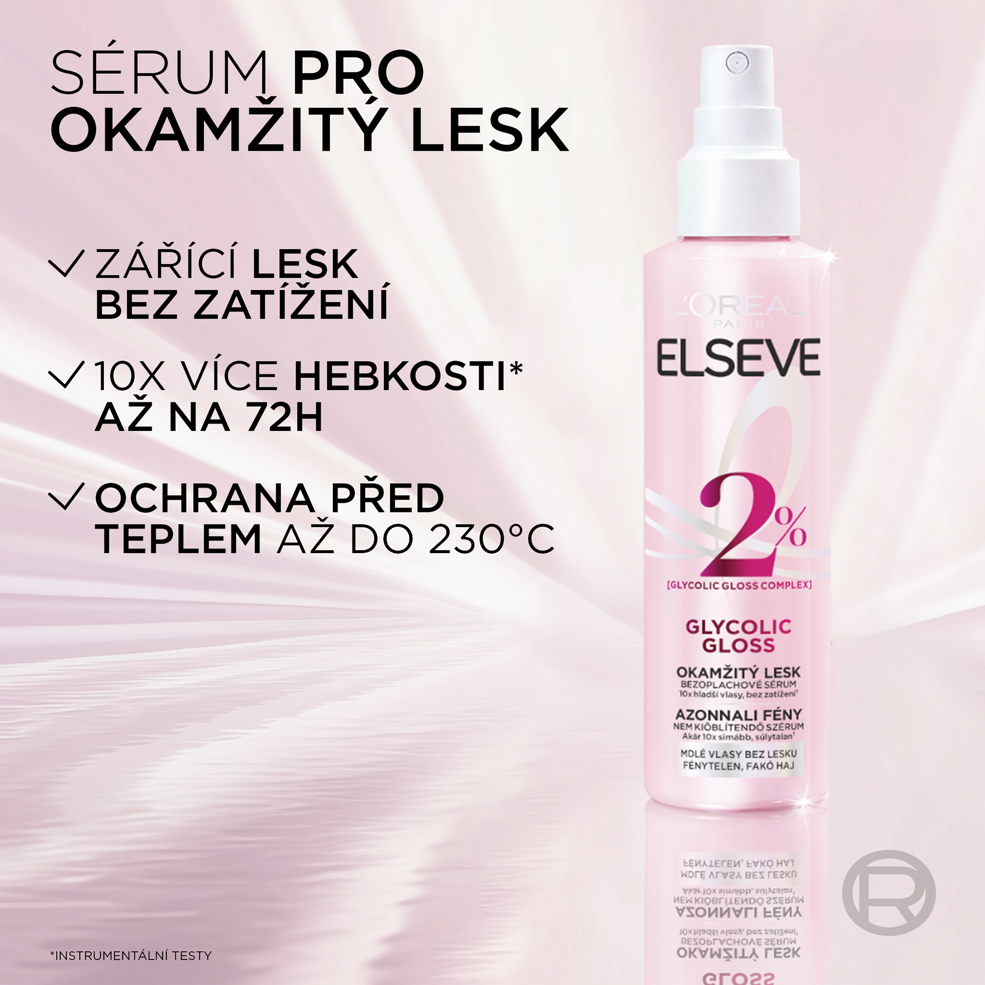 Glycolic gloss sérum ve spreji dodá vlasům okamžitý lesk, až 10x více hebkosti až na 72 hodin bez zatížení1. Chrání před teplem až do 230°C. 1 Instrumentální testy.
