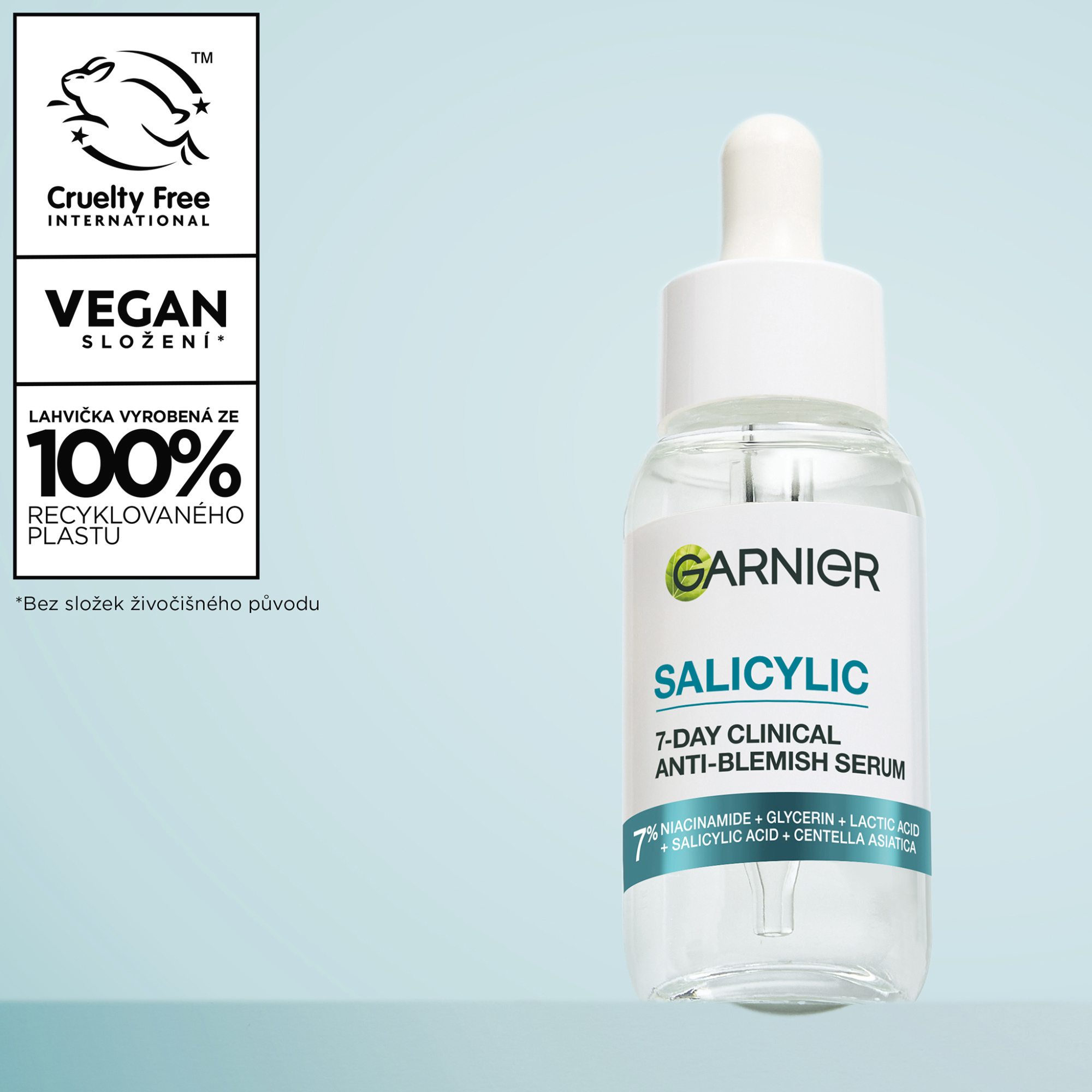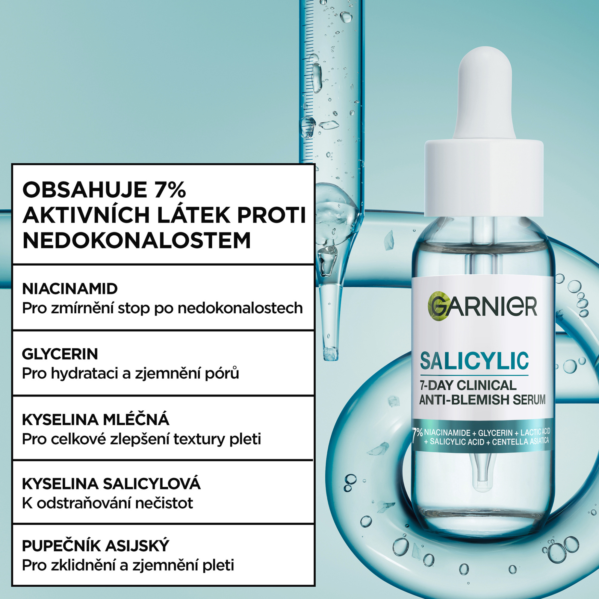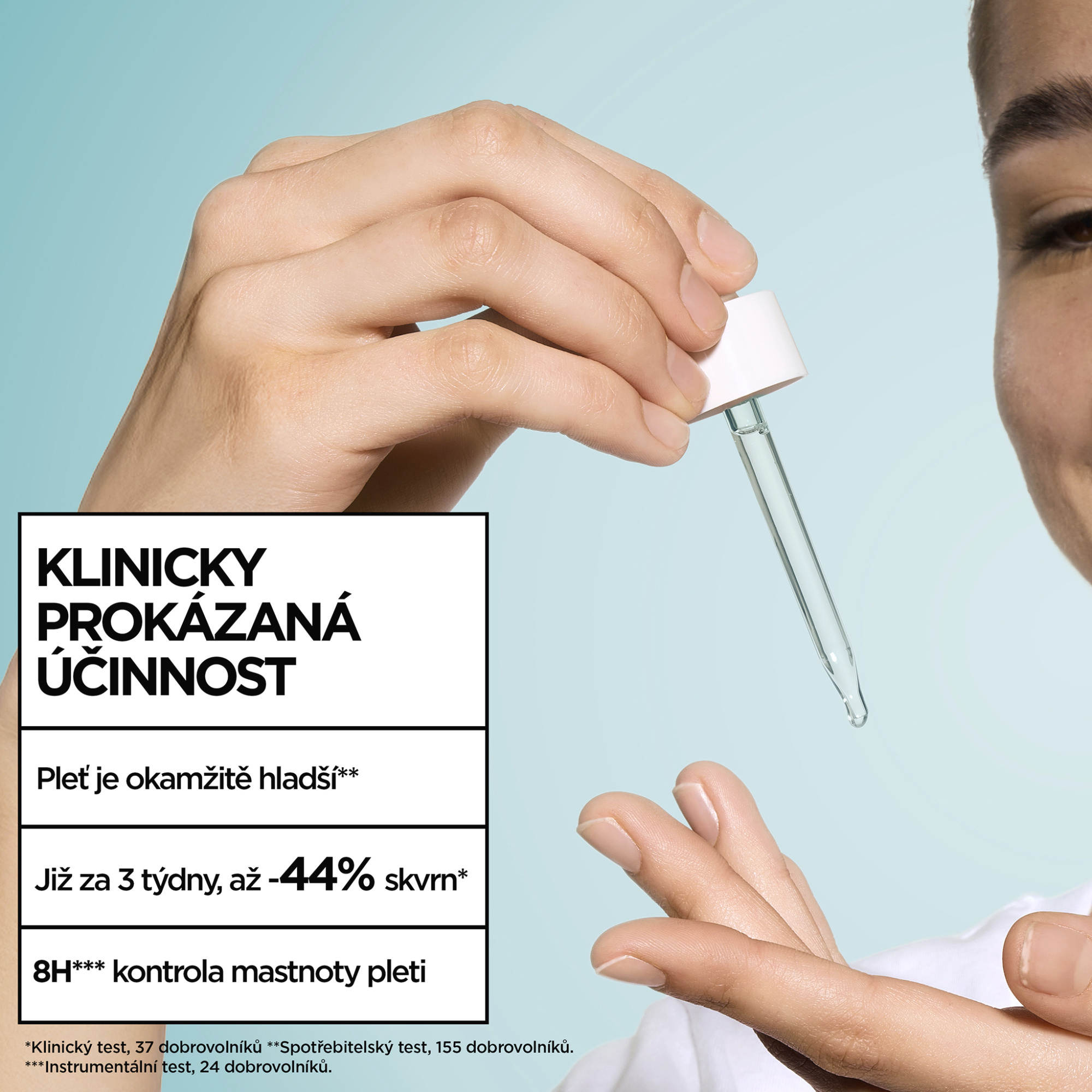 Naše první sérum proti skvrnám, obsahuje 7% [NIACINAMID + GLYCERIN + KYSELINA MLÉČNÁ + KYSELINA SALICYLOVÁ + PUPEČNÍK ASIJSKÝ]. Klinicky prokázaná účinnost jemně působí na zesvětlení skvrn již za 7 dní*. Rychle se vstřebávající lehké složení. Navrženo pro citlivou pleť a optimální toleranci s maximální účinností. Přestaňte se spoléhat na tradiční drsná séra proti nedokonalostem a vyberte si péči, která respektuje zdraví vaší pleti. Viditelně cílí na všech 6 typů nedokonalostí – pupínky, zarudnutí, mastnotu, stopy po akné, zvětšené póry a nerovnoměrnou texturu pleti. Již za 7 dní až o -18 % nedokonalostí*. Za 2 týdny až -27 % skvrn*. Za 3 týdny až -44 % nedokonalostí*. Pleť je okamžitě hladší**. Až 8hodinová kontrola mastnoty***. ***Instrumentální test, 24 dobrovolníků. Vhodné pro citlivou pleť. Testováno pod dermatologickou kontrolou. *Klinický test, 37 dobrovolníků. **Spotřebitelský test, 155 dobrovolníků. ***Instrumentální test, 24 dobrovolníků.