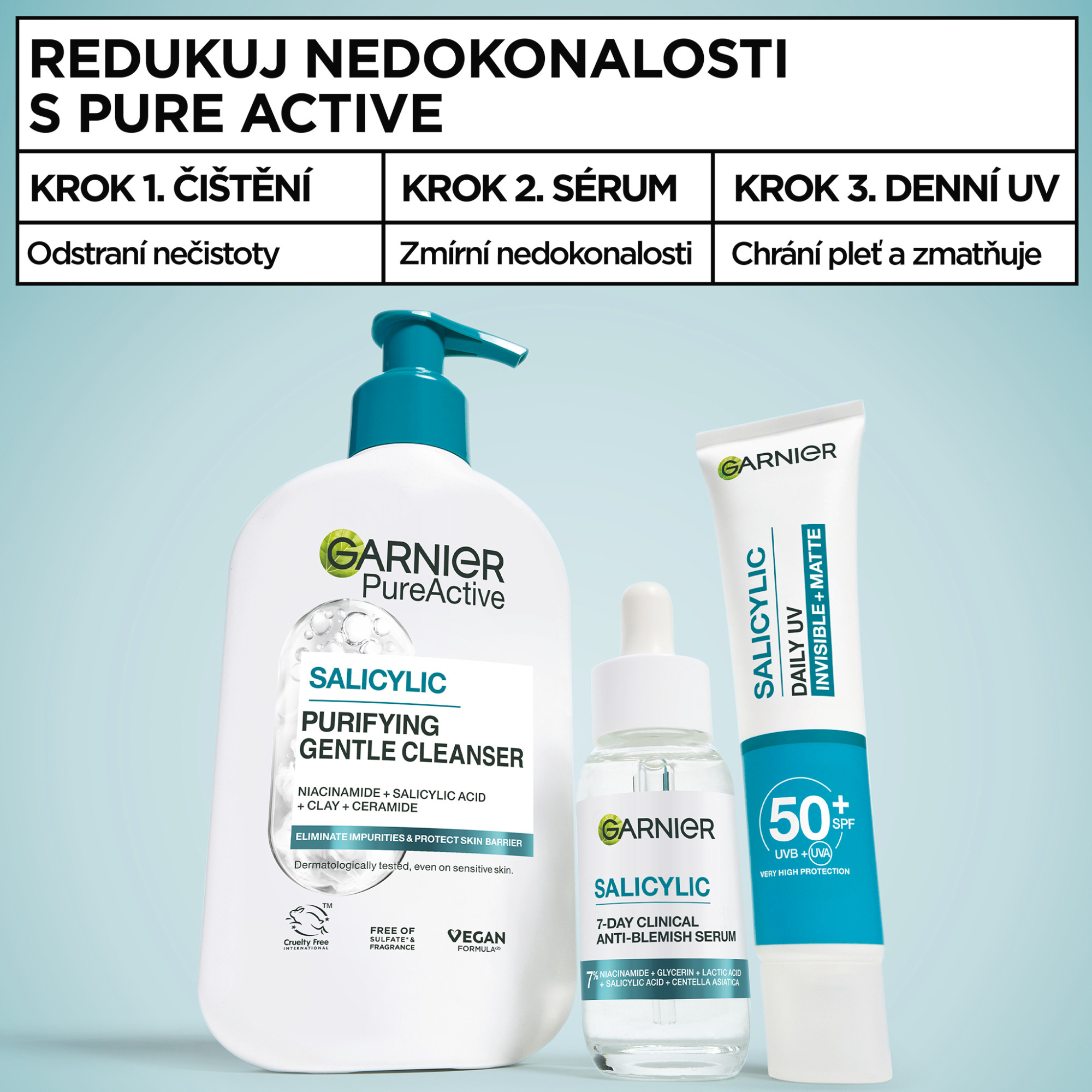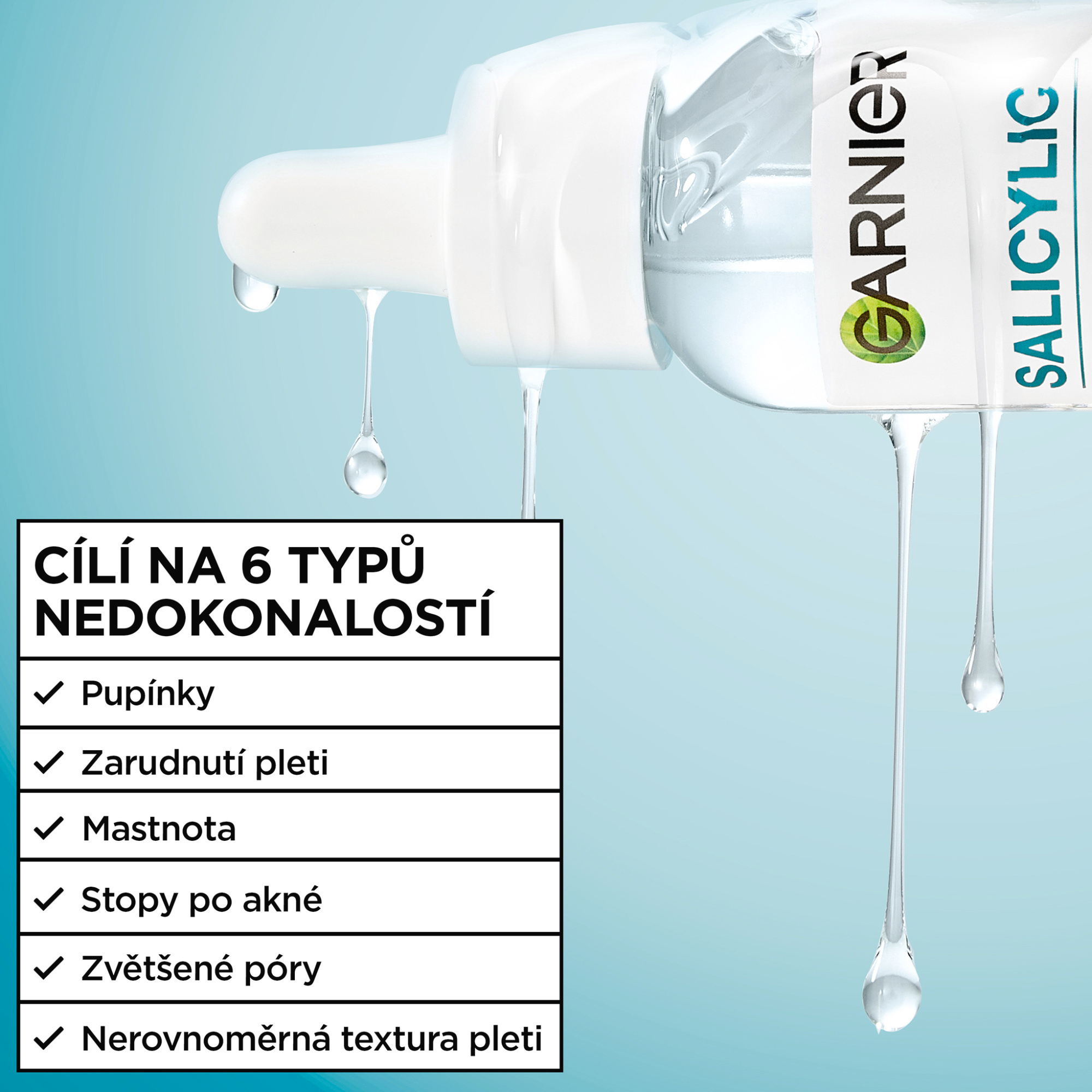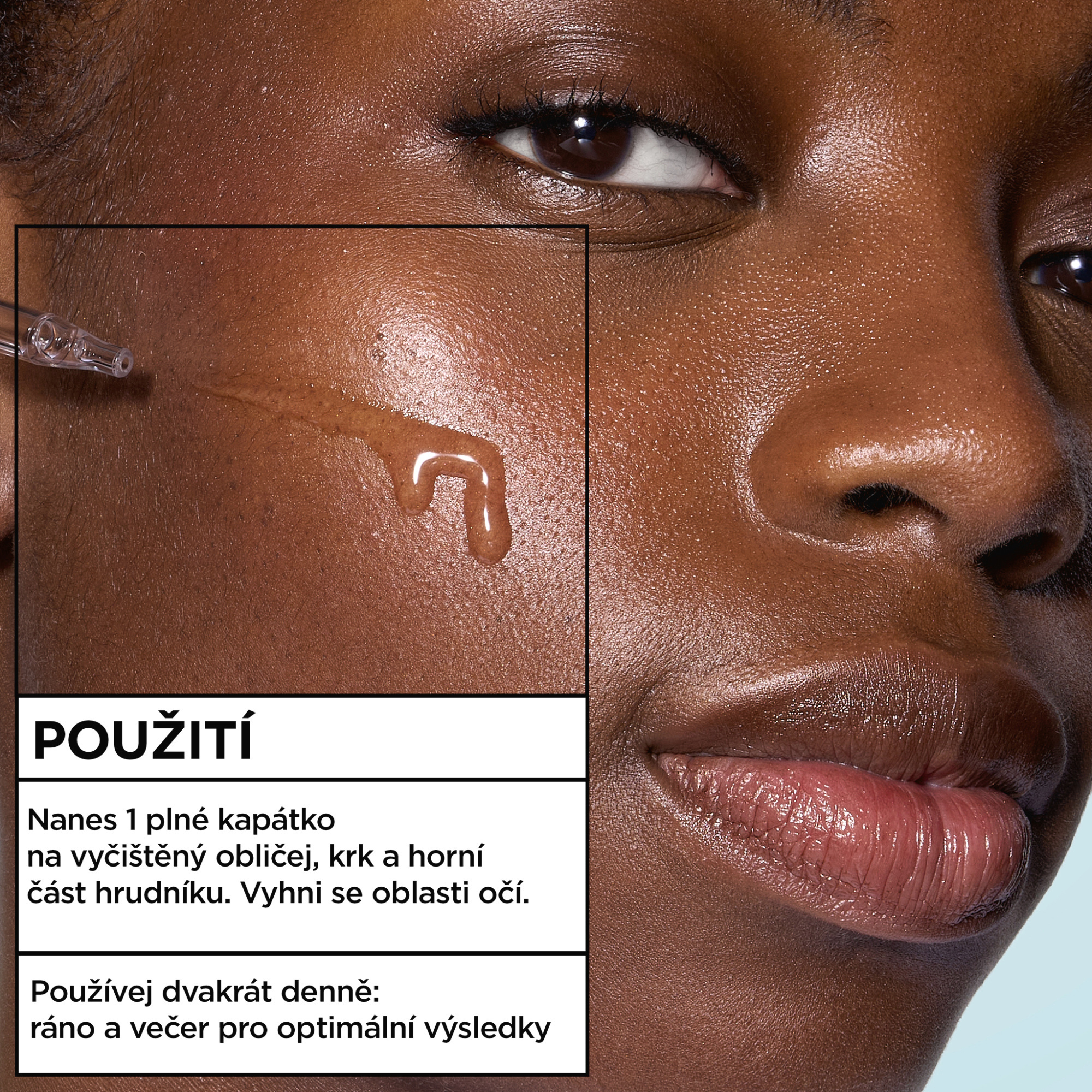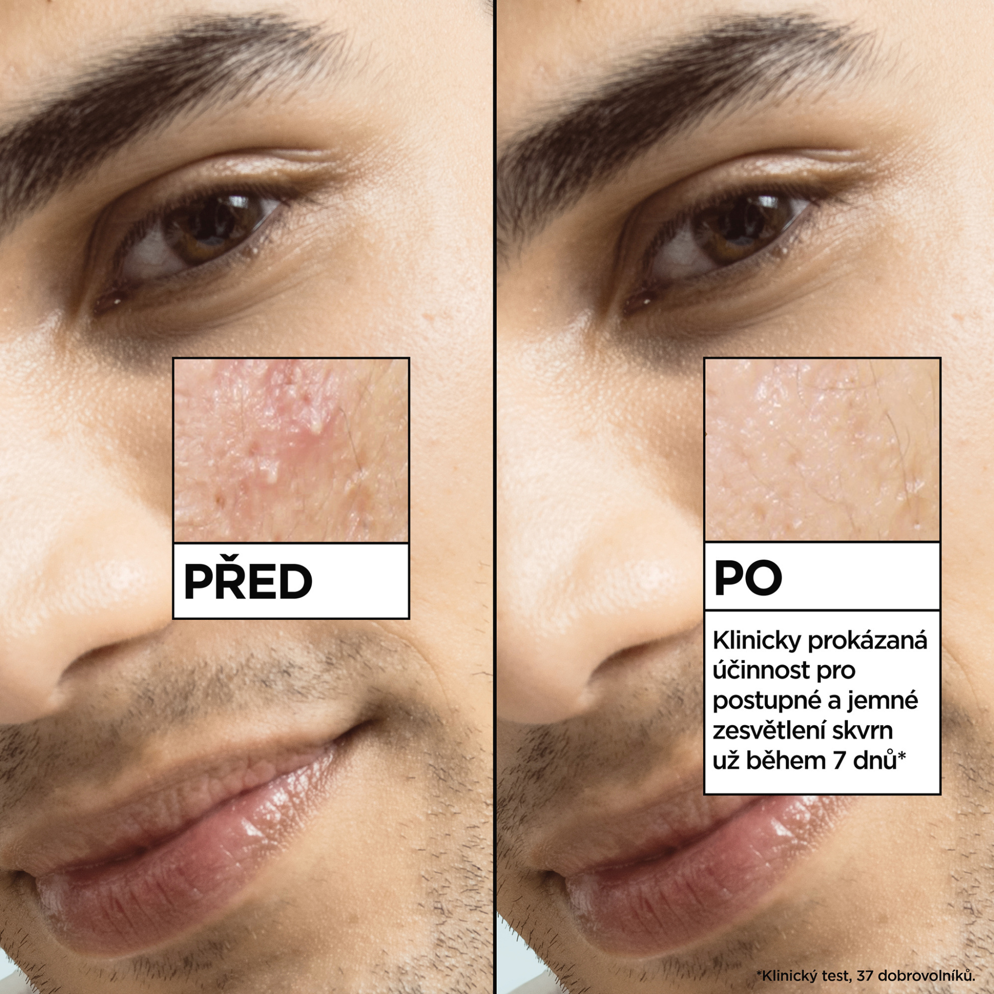 Naše první sérum proti skvrnám, obsahuje 7% [NIACINAMID + GLYCERIN + KYSELINA MLÉČNÁ + KYSELINA SALICYLOVÁ + PUPEČNÍK ASIJSKÝ]. Klinicky prokázaná účinnost jemně působí na zesvětlení skvrn již za 7 dní*. Rychle se vstřebávající lehké složení. Navrženo pro citlivou pleť a optimální toleranci s maximální účinností. Přestaňte se spoléhat na tradiční drsná séra proti nedokonalostem a vyberte si péči, která respektuje zdraví vaší pleti. Viditelně cílí na všech 6 typů nedokonalostí – pupínky, zarudnutí, mastnotu, stopy po akné, zvětšené póry a nerovnoměrnou texturu pleti. Již za 7 dní až o -18 % nedokonalostí*. Za 2 týdny až -27 % skvrn*. Za 3 týdny až -44 % nedokonalostí*. Pleť je okamžitě hladší**. Až 8hodinová kontrola mastnoty***. ***Instrumentální test, 24 dobrovolníků. Vhodné pro citlivou pleť. Testováno pod dermatologickou kontrolou. *Klinický test, 37 dobrovolníků. **Spotřebitelský test, 155 dobrovolníků. ***Instrumentální test, 24 dobrovolníků.