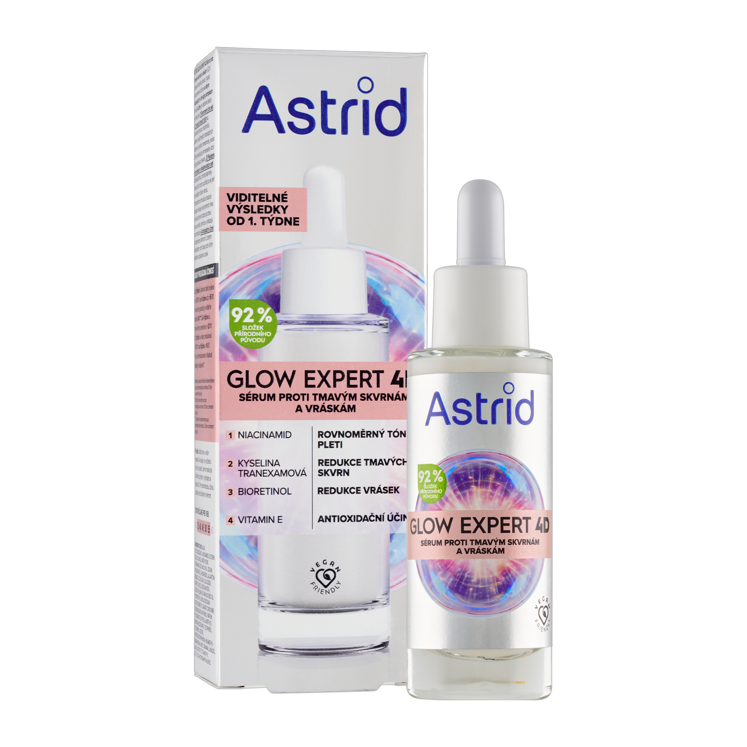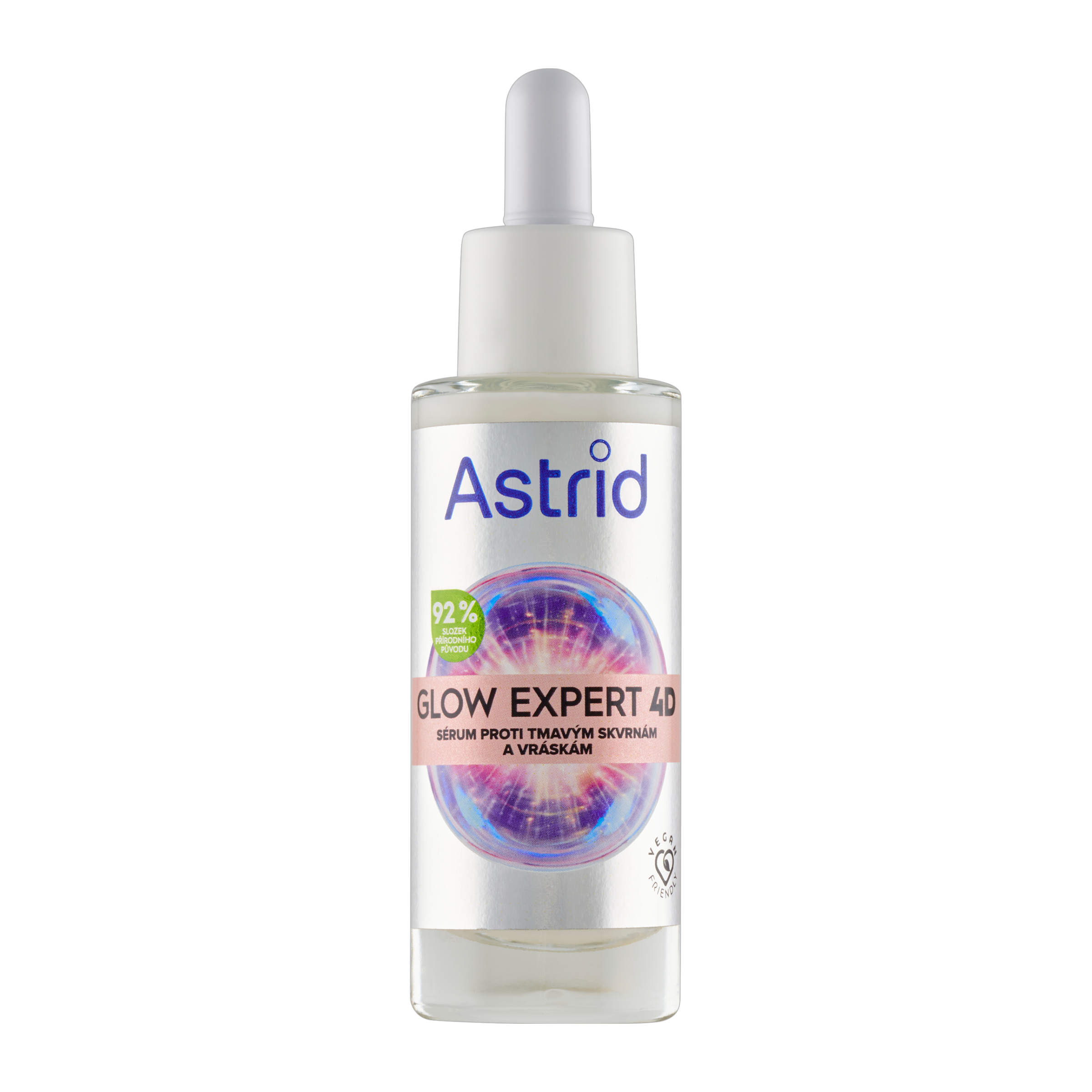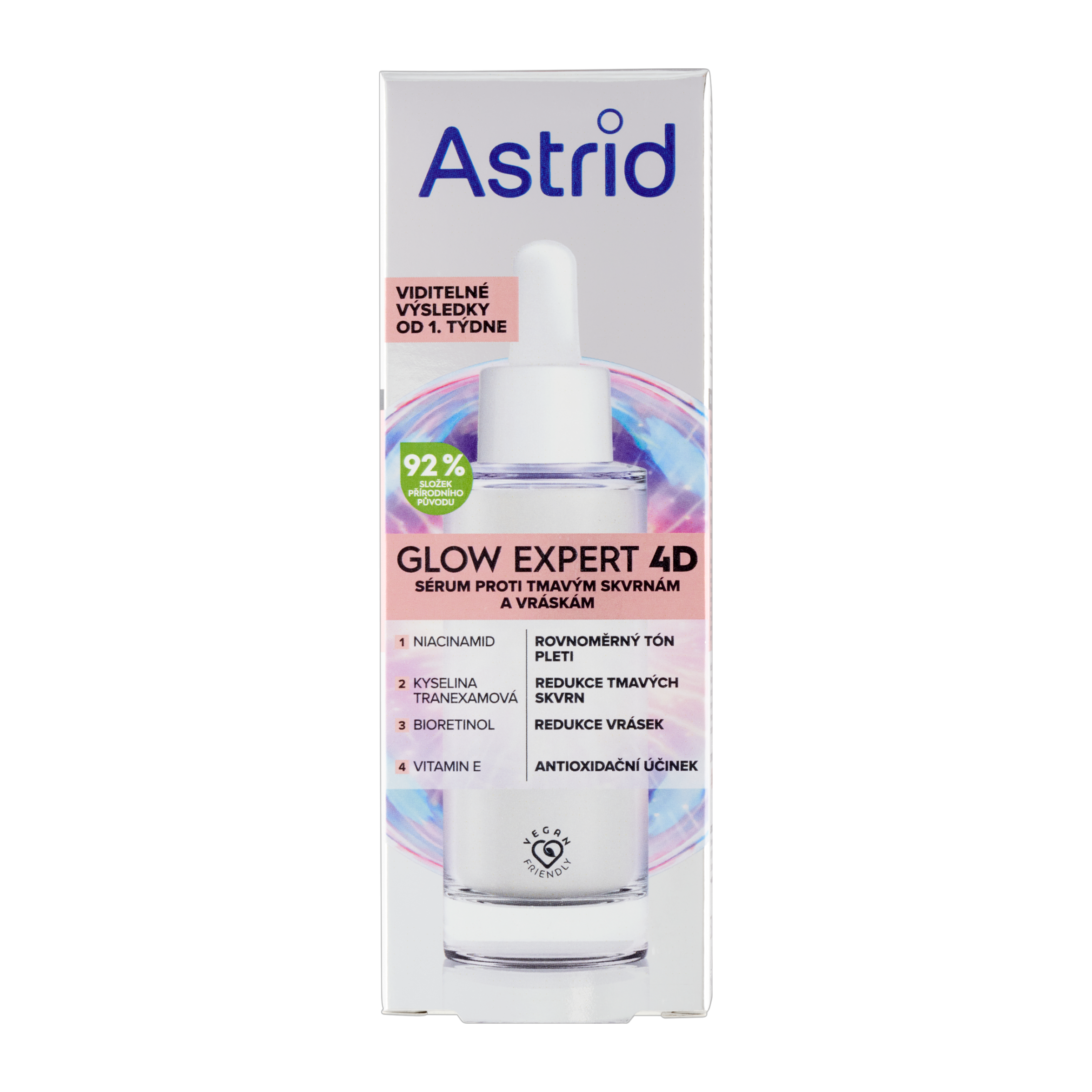 Astrid Glow Expert 4D sérum proti tmavým skvrnám a vráskám s 92 % složek přírodního původu. Vysoce koncentrované složení se silným rozjasňujícím a anti-aging komplexem nabízí 4 účinky pro zlepšení textury a vzhledu pleti.