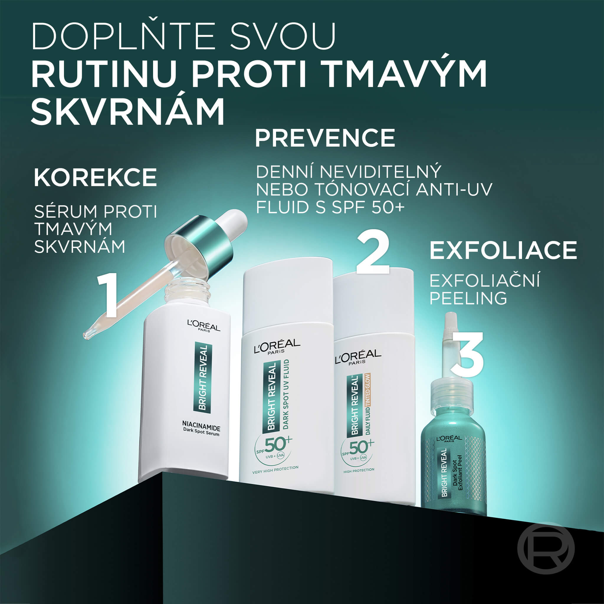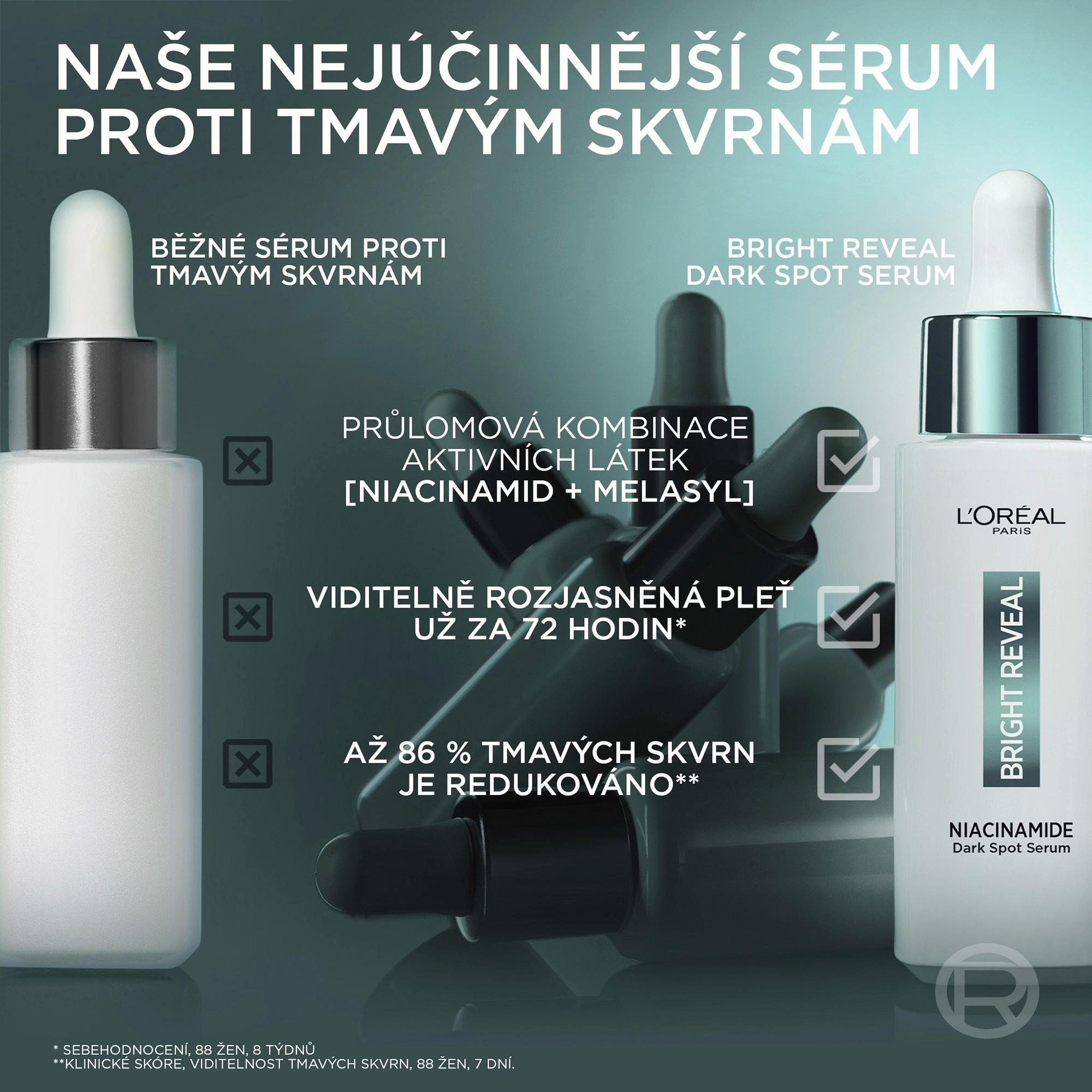 Bright Reveal Sérum proti tmavým skvrnám, obohacené o niacinamid a kyselinu aminosulfonovou, pomáhá bojovat proti tmavým skvrnám. Niacinamid, rozjasňující složka, pomáhá redukovat výskyt tmavých skvrn způsobených věkem, slunečním zářením ale také jako následek akné. Kyselina amino-sulfonová, jemný exfoliant, odstraňuje odumřelé buňky a sjednocuje pleť.