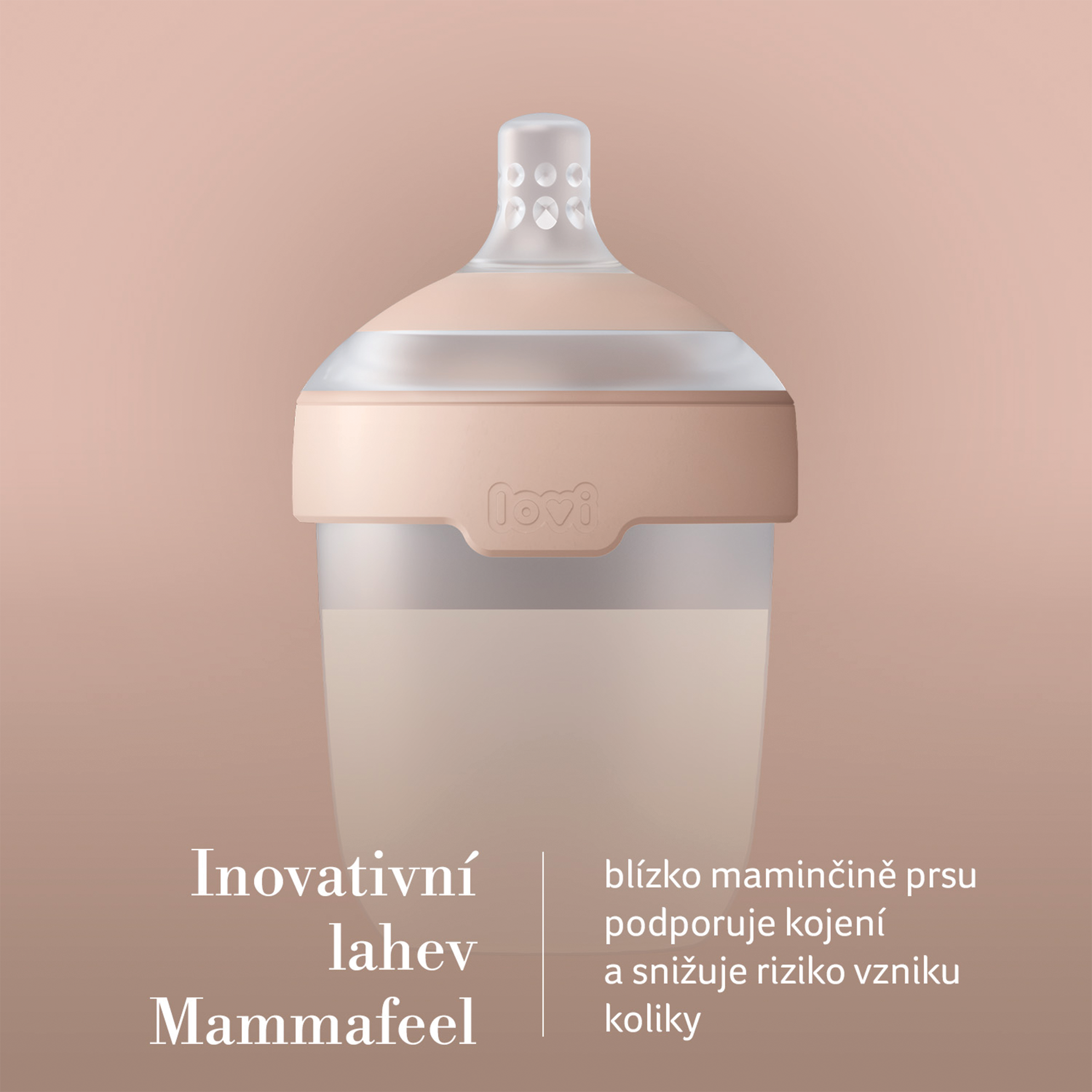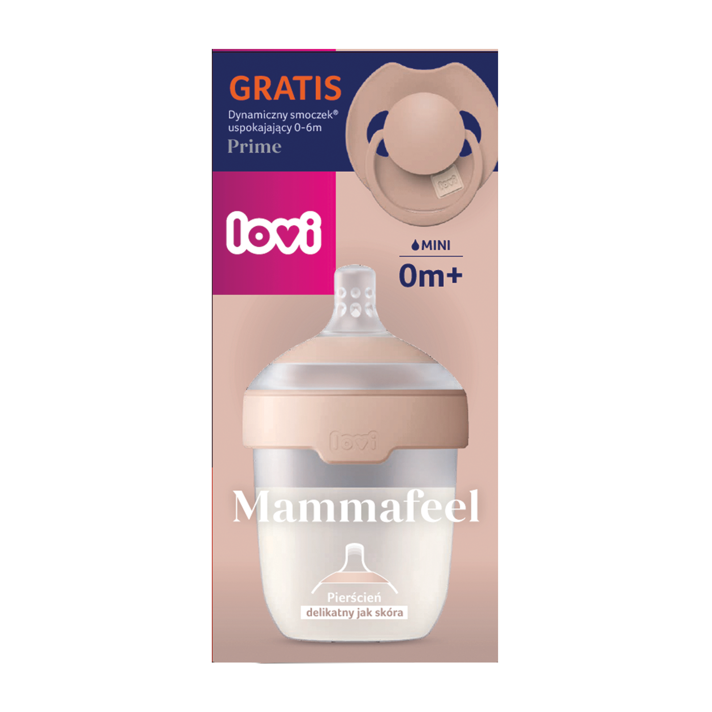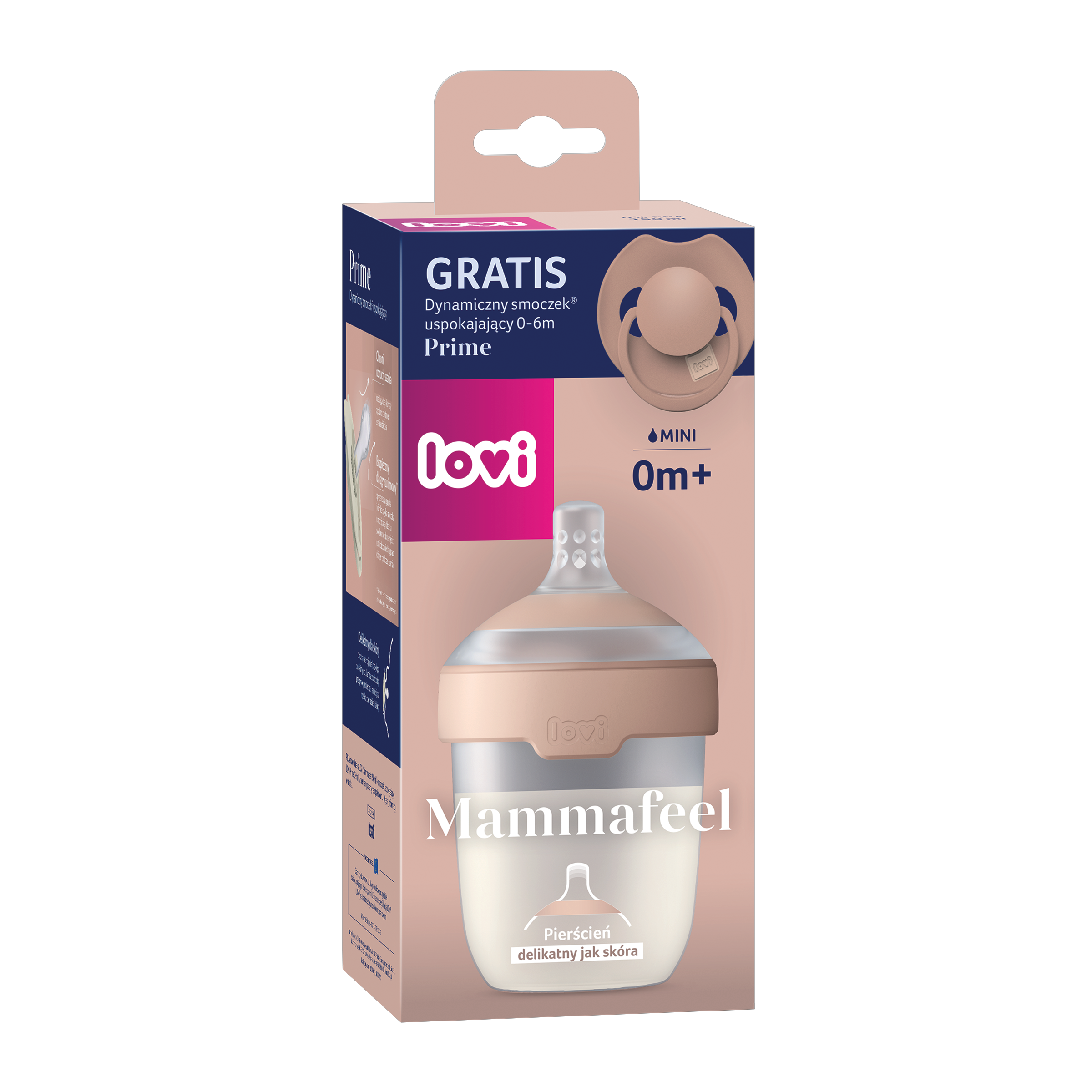 Set láhve Lovi Mammafeel a dudlíku Prime 0m+ je navržen tak, aby co nejvíce připomínal přirozené kojení a poskytl miminku pocit tepla, blízkosti a bezpečí jako u maminky. Láhev Mammafeel imituje tvar, barvu, jemnost a pružnost prsou, což usnadňuje kombinaci kojení a krmení z láhve. Dynamická savička se přizpůsobuje rytmu sání dítěte, nenarušuje sací reflex a snižuje riziko koliky díky antikolikovému ventilu. Dudlík Prime je lehký, elegantní a šetrný k vývoji řeči i skusu, jeho tvar vychází z podoby bradavky naplněné mlékem.