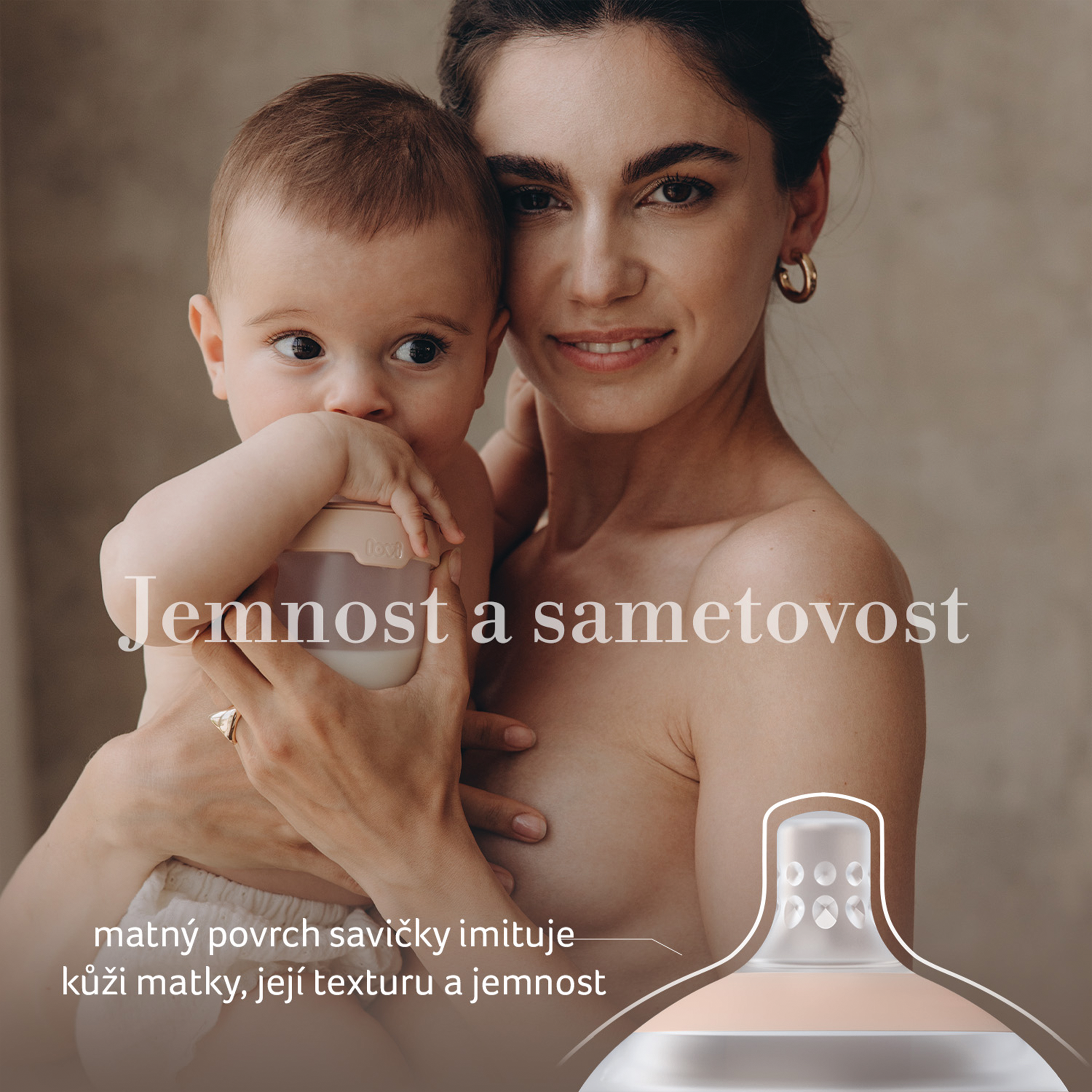- Jemnost a sametový pocit – matný, jemný povrch savičky napodobuje maminčinu pokožku, její texturu a jemnost