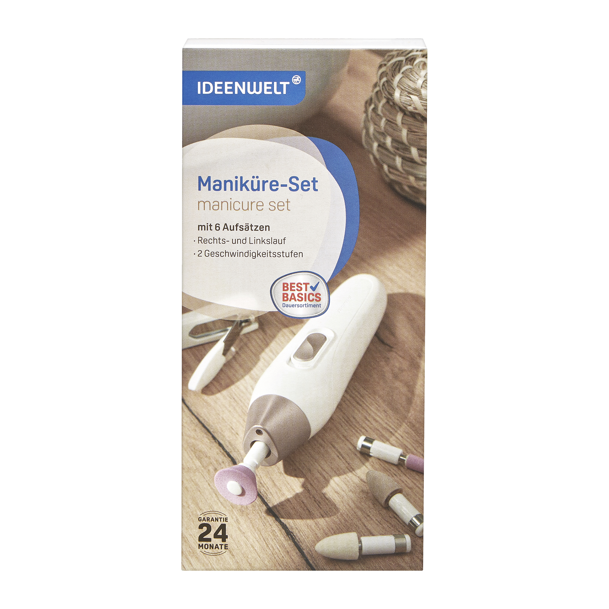 Set s elektrickým nástrojem pro péči o nehty s mnoha praktickými nástavci pro úpravu rukou i nohou. Na baterie.