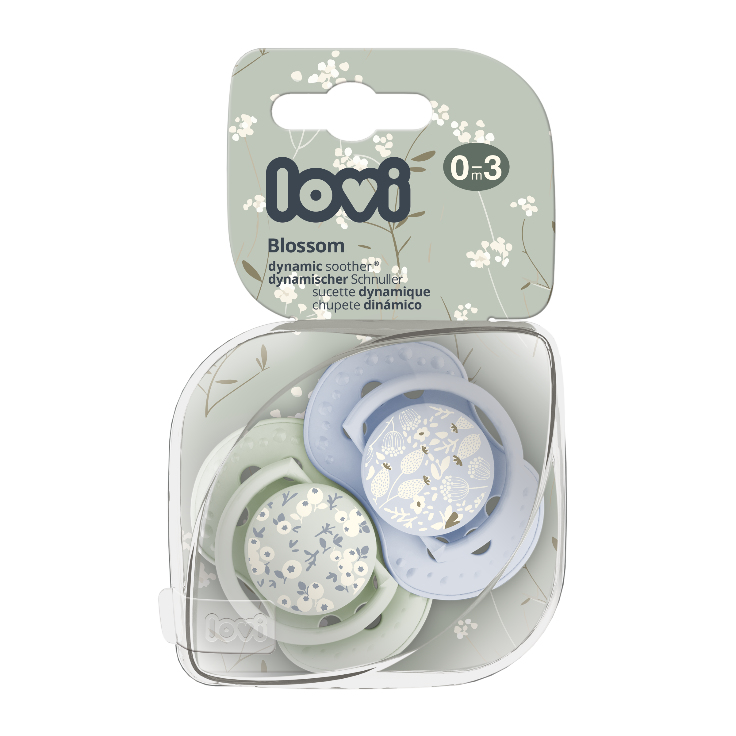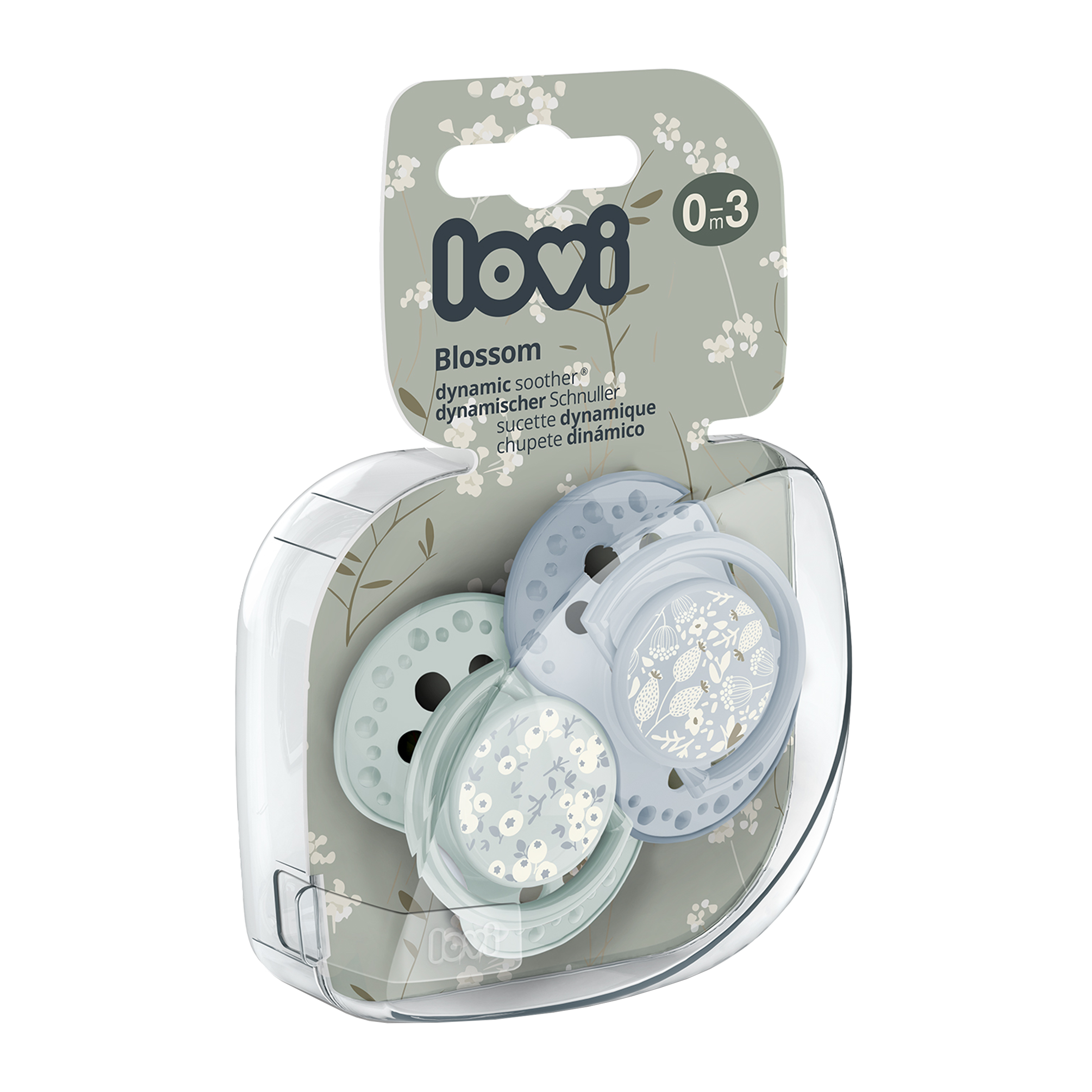 Dynamický silikonový dudlík LOVI BLOSSOM nenarušuje sací reflex miminka, je velmi lehký a dítě se při sání nenamáhá. Vhodné pro děti od 0-3m. Dynamický dudlík LOVI nenarušuje sací reflex miminka, vývoj řeči a skusu při dodržení dalších ortondotických a nerologopedických doporučení. Dudlík je velmi lehký, dítě se při sání nenamáhá. Tvar silikonové špičky je přizpůsoben přirozenému sacímu reflexu, silikonová část je úzká na začátku u štítku a rozšířená na konci tak, aby se špička natahovala a stahovala podle rytmu sání dítěte. Díky tomu je chráněn sací reflex miminek a sání dudlíku nemá nepříznivý vliv na kojení. Symetrický tvar špičky vychází z tvaru maminčiny bradavky naplněné mlékem, která poskytuje miminku důvěrně známý pocit podobný pocitu sání z prsu. Špička je zploštělá a konec dudlíku je tak tenký, že umožňuje dítěti volně zavírat ústa a správně pracovat dásněmi při sání a zároveň poskytuje dostatek prostoru v ústech pro práci jazyka, což snižuje riziko vzniku malookluze a vad řeči*.