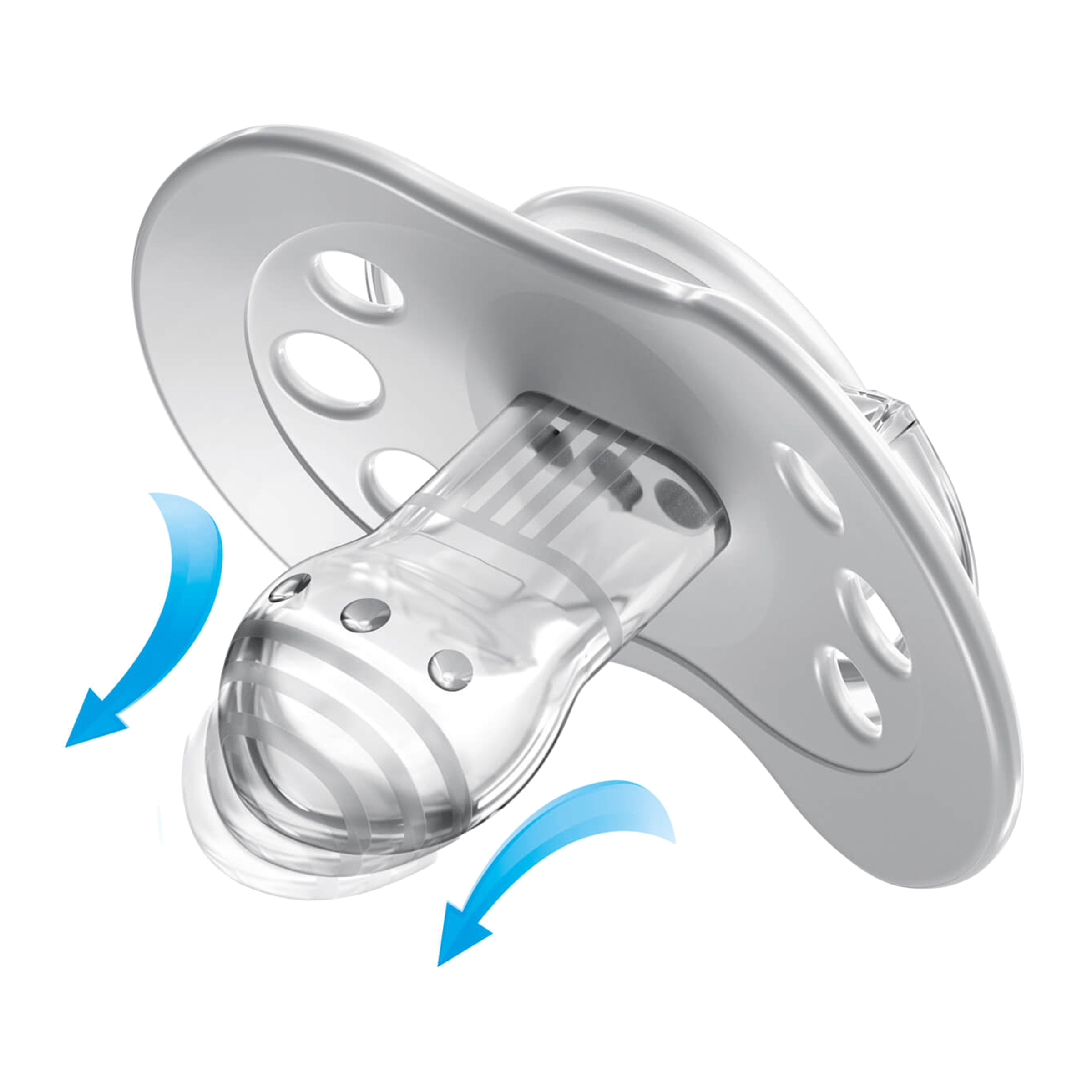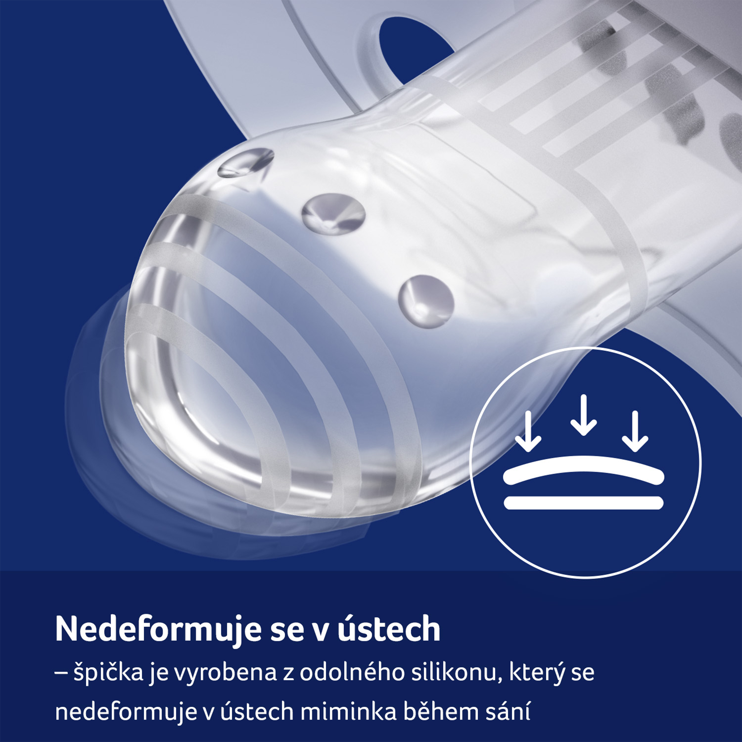 - Dynamická špička je vyrobena z nestejnorodých vrstev silikonu, takže se prodlužuje a smršťuje v závislosti na rytmu sání dítěte.