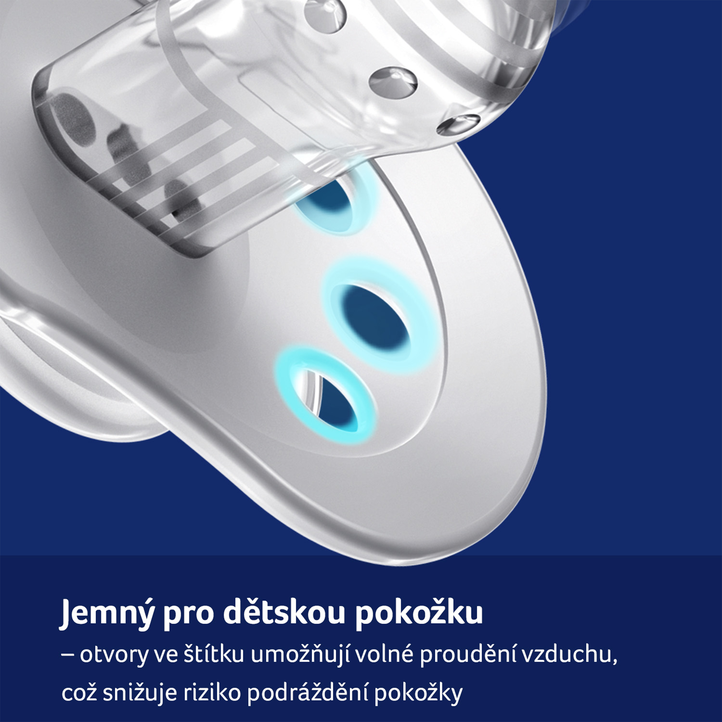 - Tvarovaný vykrojený tvar štítku umožňuje dítěti volně dýchat nosem.