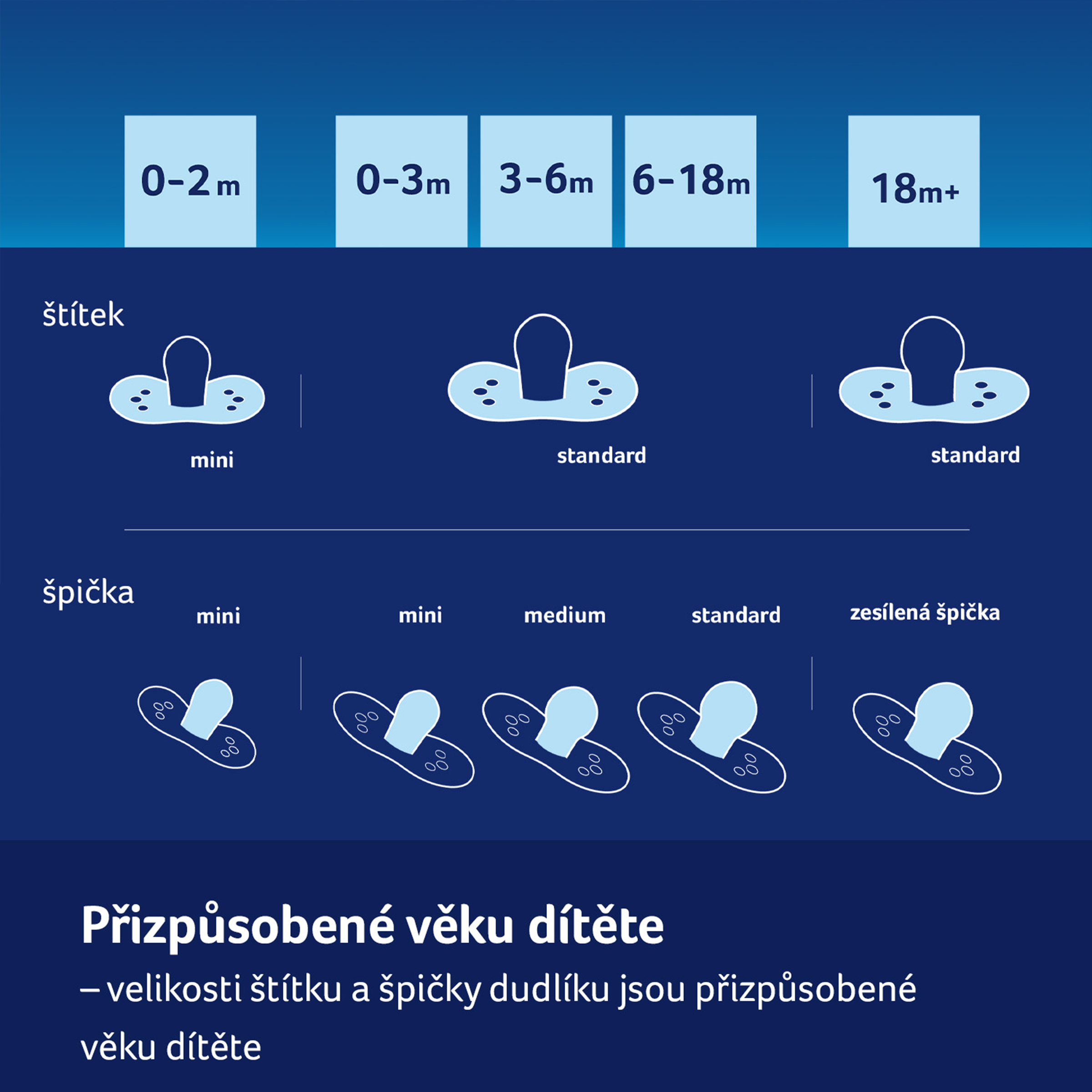 - Unikátní symetrická dynamická špička se velmi dobře odvzdušňuje a nedeformuje zubní patro dítěte.