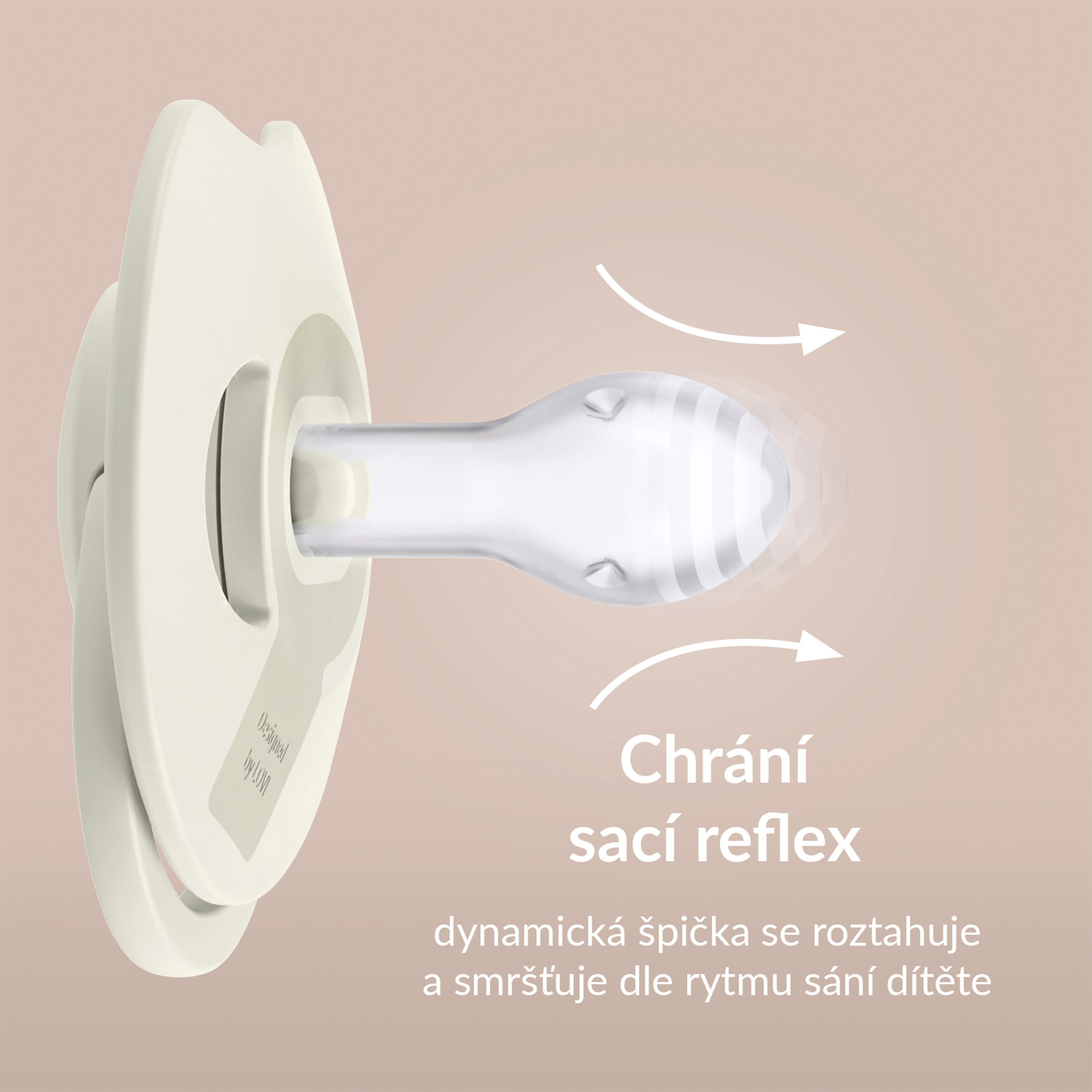 Dynamický dudlík LOVI z kolekce PRIME je bezpečný pro sací reflex a nenarušuje vývoj řeči a skusu.