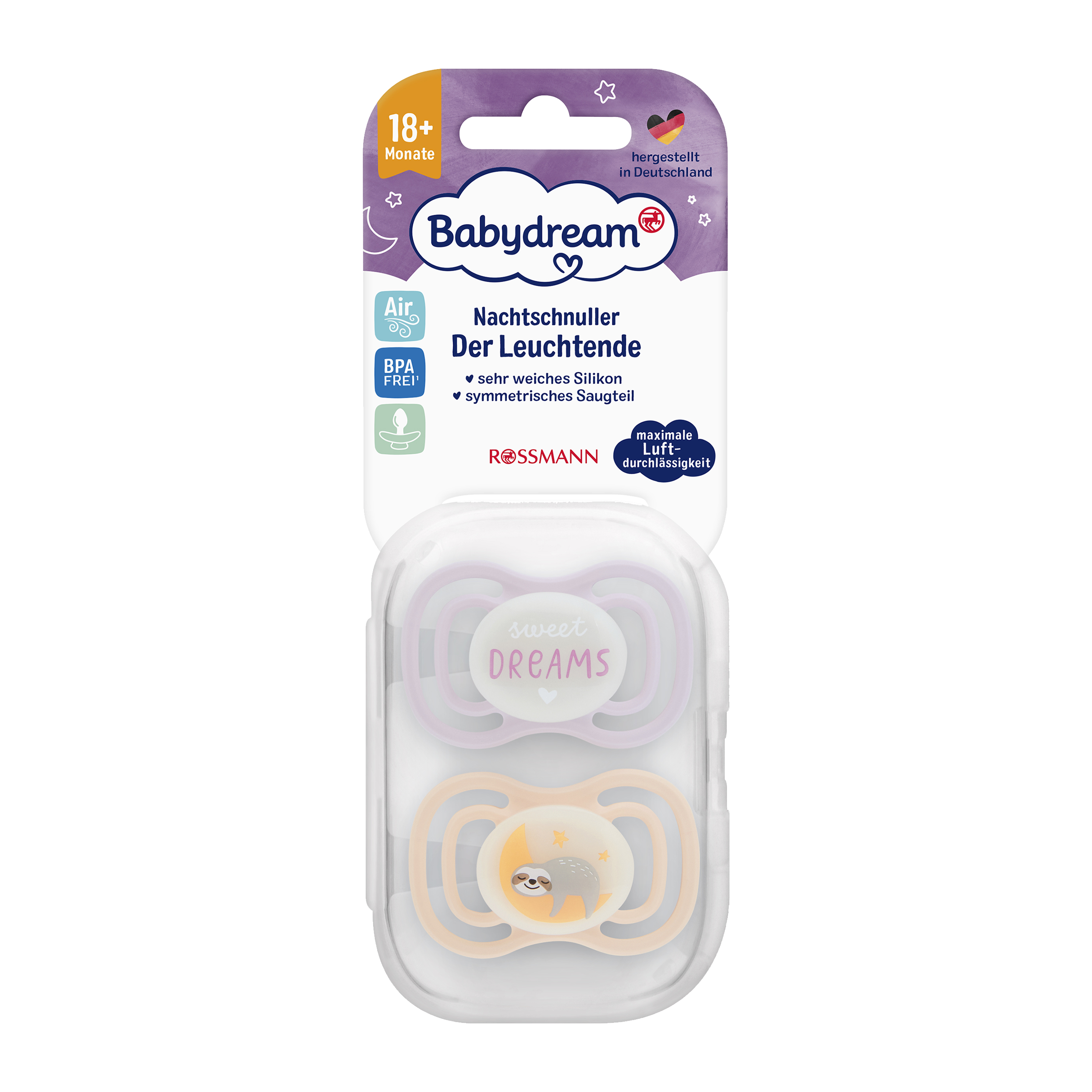 Silikonový symetrický dudlík s velkými otvory podporuje zdravý vývoj ústní dutiny a správné dýchání. Díky možnosti otočení o 180° a intenzivnímu svícení je ideálním společníkem pro vaše miminko. Praktický sterilizační box z polypropylenu umožňuje snadné a hygienické čištění.
