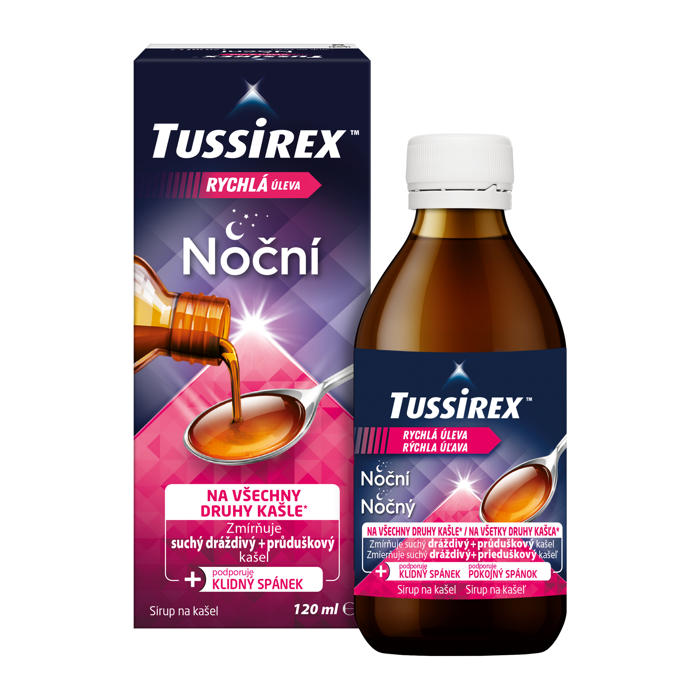 15 ml sirupu Tussirex noční obsahuje: 483,33 mg suchého výtažku z pukléřky islandské, 25,80 mg hyaluronátu sodného, 60,00 mg xanthanu.