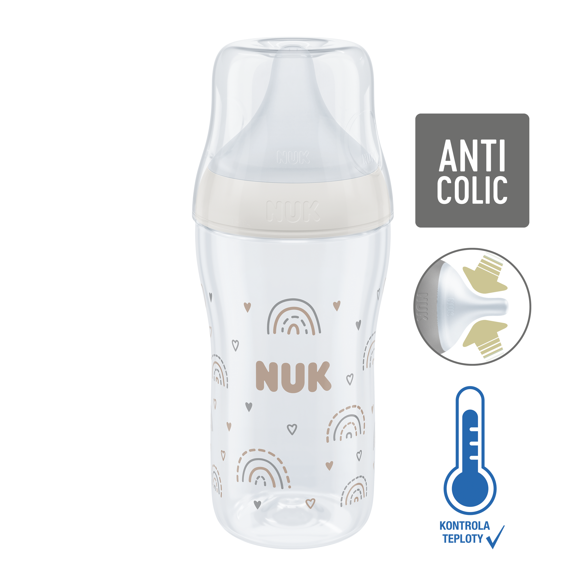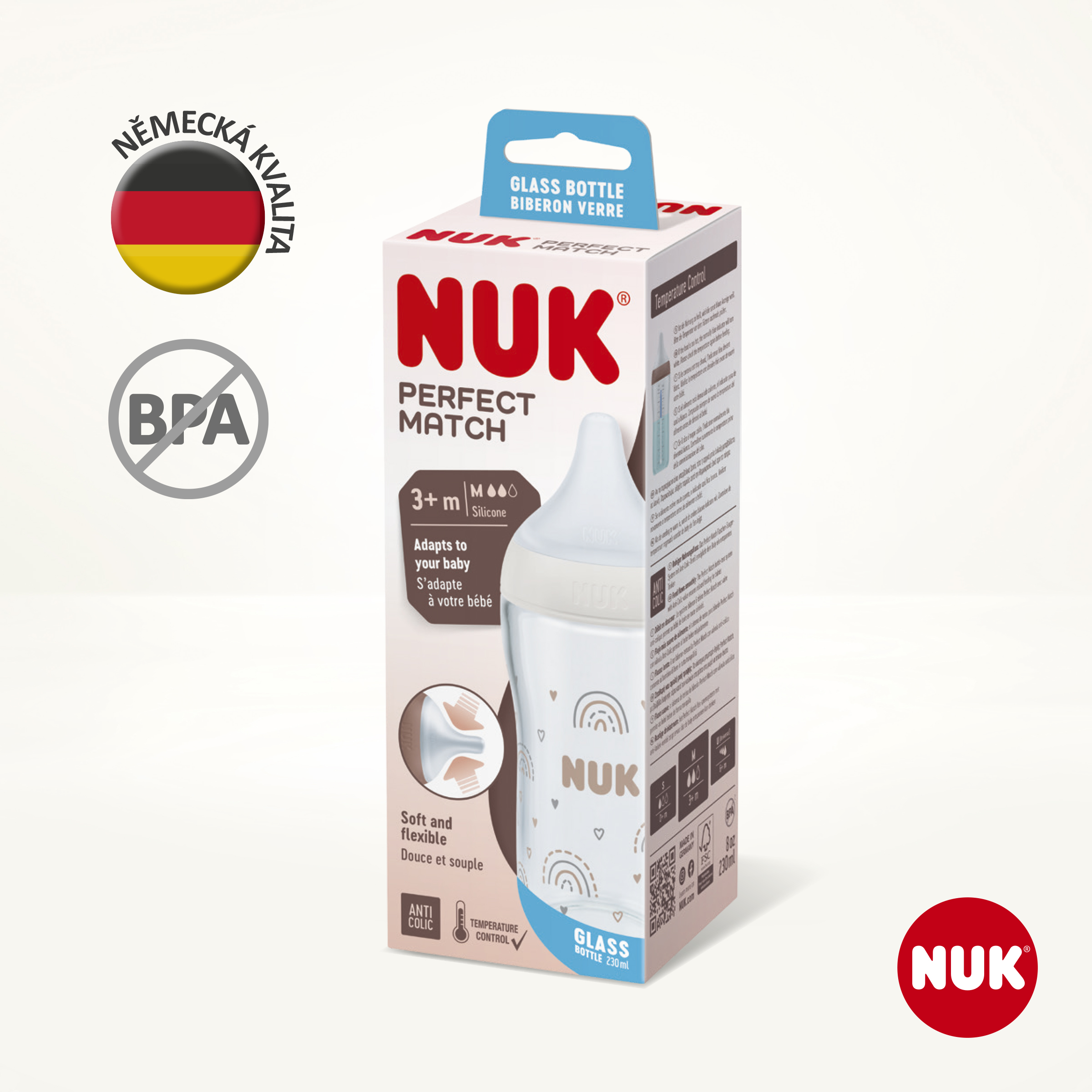 Skleněná kojenecká láhev NUK Perfect Match, s měkkou silikonovou savičkou, 230 ml, od 3 měsíců, neobsahuje BPA, antikolikový systém, s kontrolou teploty.