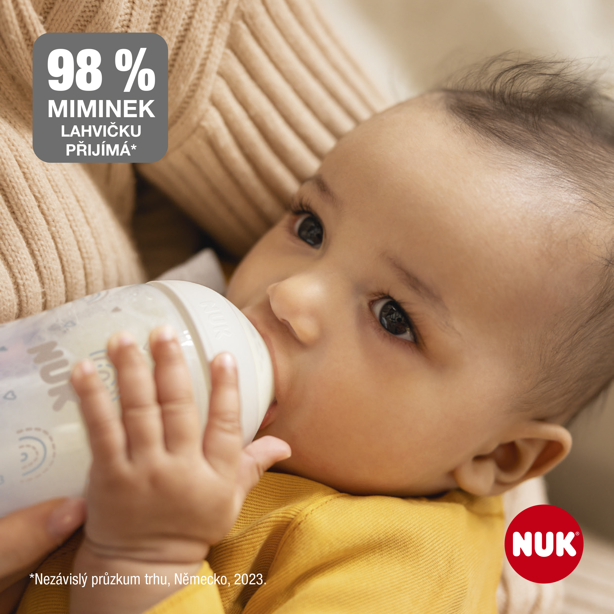 Důležité upozornění: Kojení je to nejlepší pro kojence. Příprava: Při přípravě jídla nebo čaje vždy dbejte na teplotní doporučení jejich výrobce. Aby byly zachovány vitamíny a živiny, teplota by neměla přesáhnout 60 °C. Láhve naplněné jídlem nebo vodou nedávejte do mikrovlnky (riziko exploze/poškození materiálu). Nerovnoměrné ohřátí může způsobit popálení! Nikdy neohřívejte uzavřené láhve, mohly by explodovat! Nezchlazujte uzavřené PP láhve, které byly právě naplněny horkou tekutinou (> 80° C), láhev by se mohla zdeformovat. Před prvním použitím dejte na 5 minut do vařící vody, použijte dostatečné množství vody, abyste předešli poškození výrobku. Pro zajištění hygieny, před každým použitím umyjte jemným mycím prostředkem a sterilizujte. Před sterilizací varem i párou (teplota nad 80 °C) vždy láhev rozmontujte a nechte otevřenou, jinak by se mohla deformovat. Savičky a láhve nepatří do myčky na nádobí - mycí prostředky do myčky mohou poškodit materiál. Pozor: NUK láhev s kontrolou teploty je určena pro dodatečnou kontrolu. Před krmením je teplotu nutné zkontrolovat i ručně. Chcete-li zkontrolovat teplotu, doporučujeme nakapat několik kapek obsahu láhve na vnitřní zápěstí.