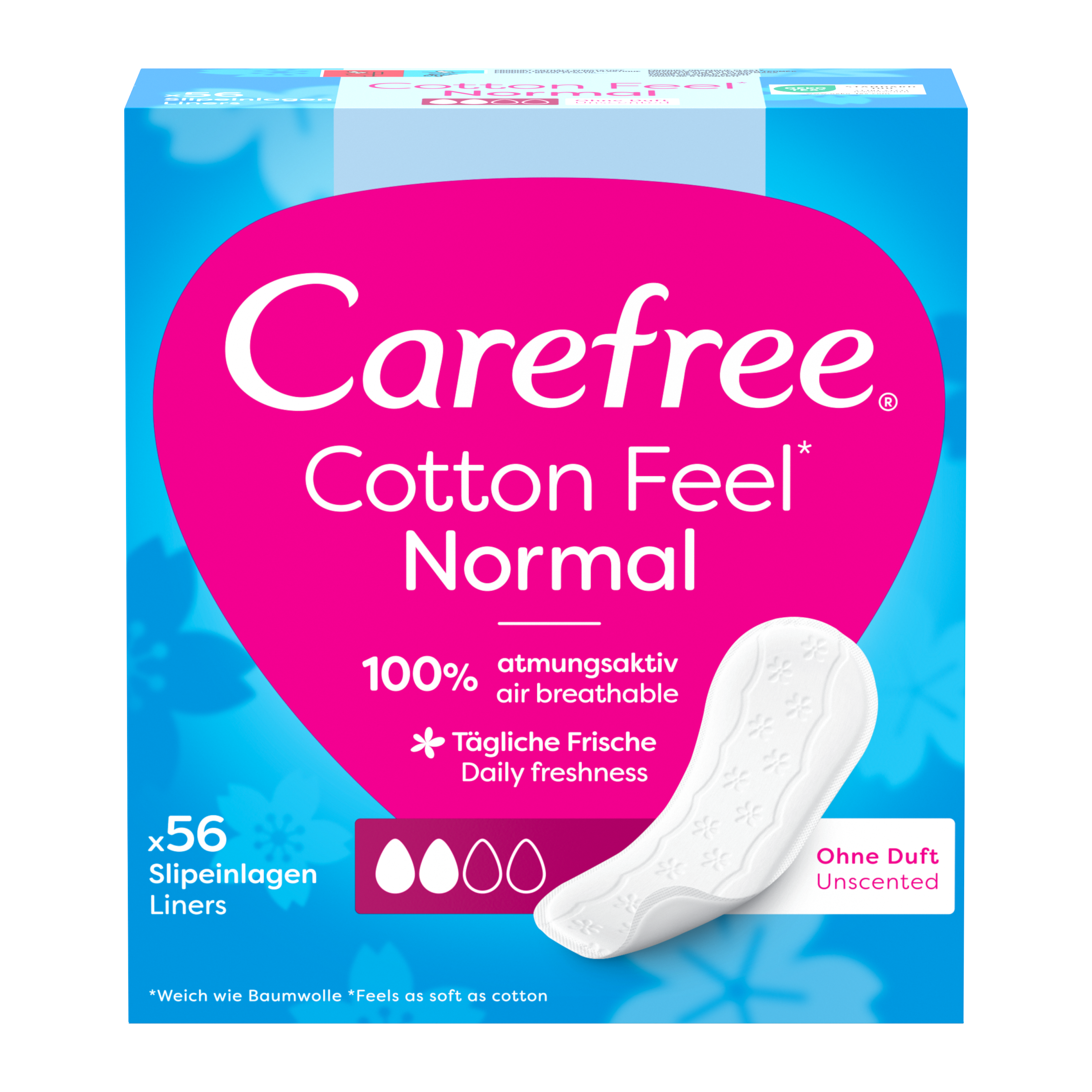 Slipové vložky Carefree Cotton Feel Normal, neparfemované, na dotyk hebké jako bavlna. Poskytují každodenní svěžest a extra ochranu. Jsou 100% prodyšné s unikátní kombinací 4 prodyšných vrstev. Tyto slipové vložky mají Soft Touch povrch, který je jemný na dotyk a dermatologicky testovaný. Díky Perfect Fit Designu se přizpůsobí pohybům Vašeho těla. Bezpečně zůstávají na svém místě. Obsahují: 0% barviv, jsou nebělené elementárním chlorem.