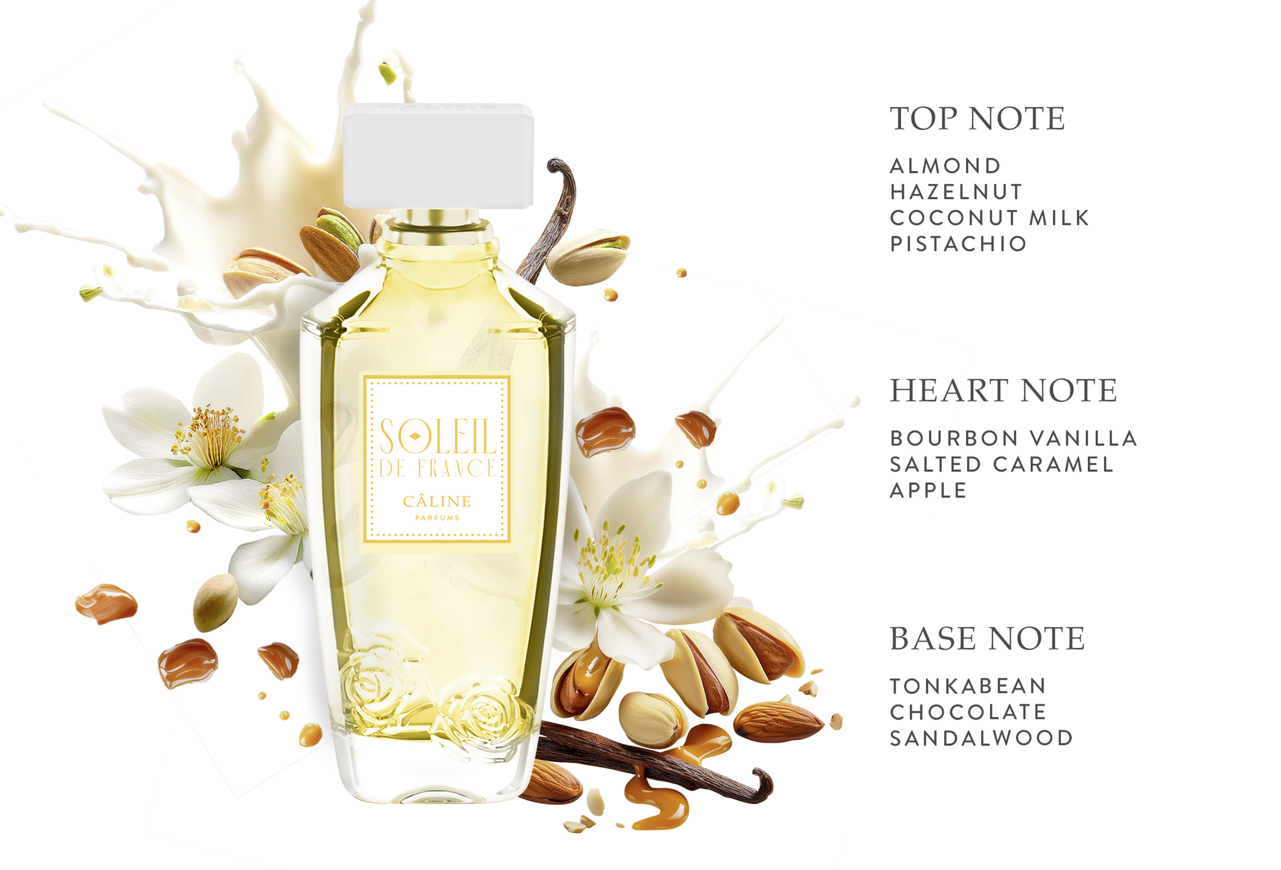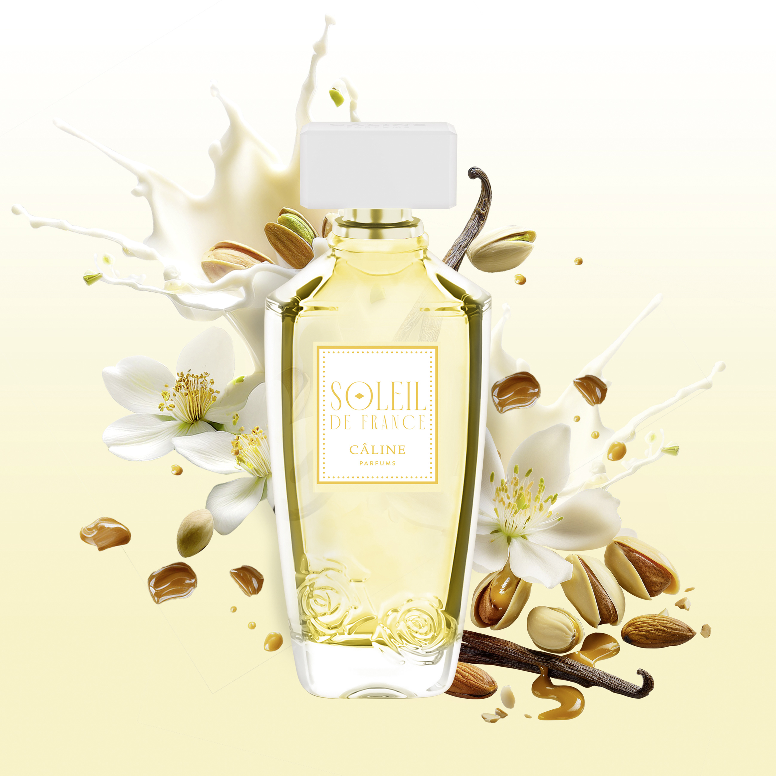 Léto, slunce a sluneční svit sjednocené v jedinečné vůni od CÂLINE Parfums. CÂLINE Soleil de France vyzařuje svými teplými žlutými tóny a přináší letní lehkost a teplo Francouzské riviéry do vaší vlastní kolekce vůní. Dokonalá vůně na léto kombinuje lahodné gurmánské tóny pistácií, mandlí a slaného karamelu, doplněné ušlechtilými tonkovými boby a krémovým santalovým dřevem.