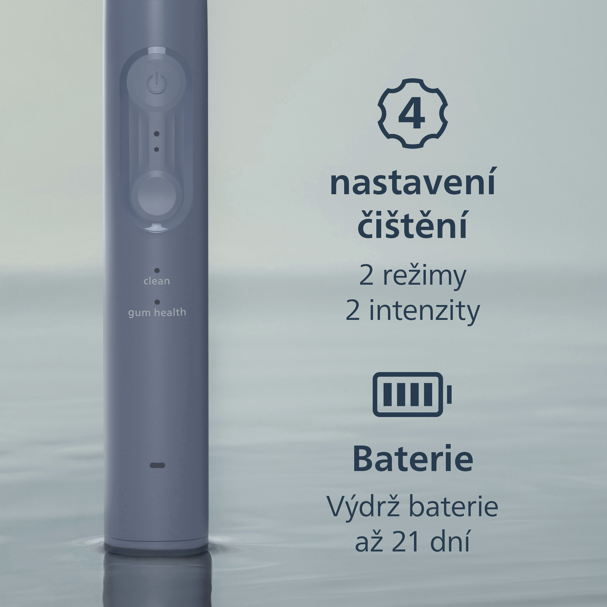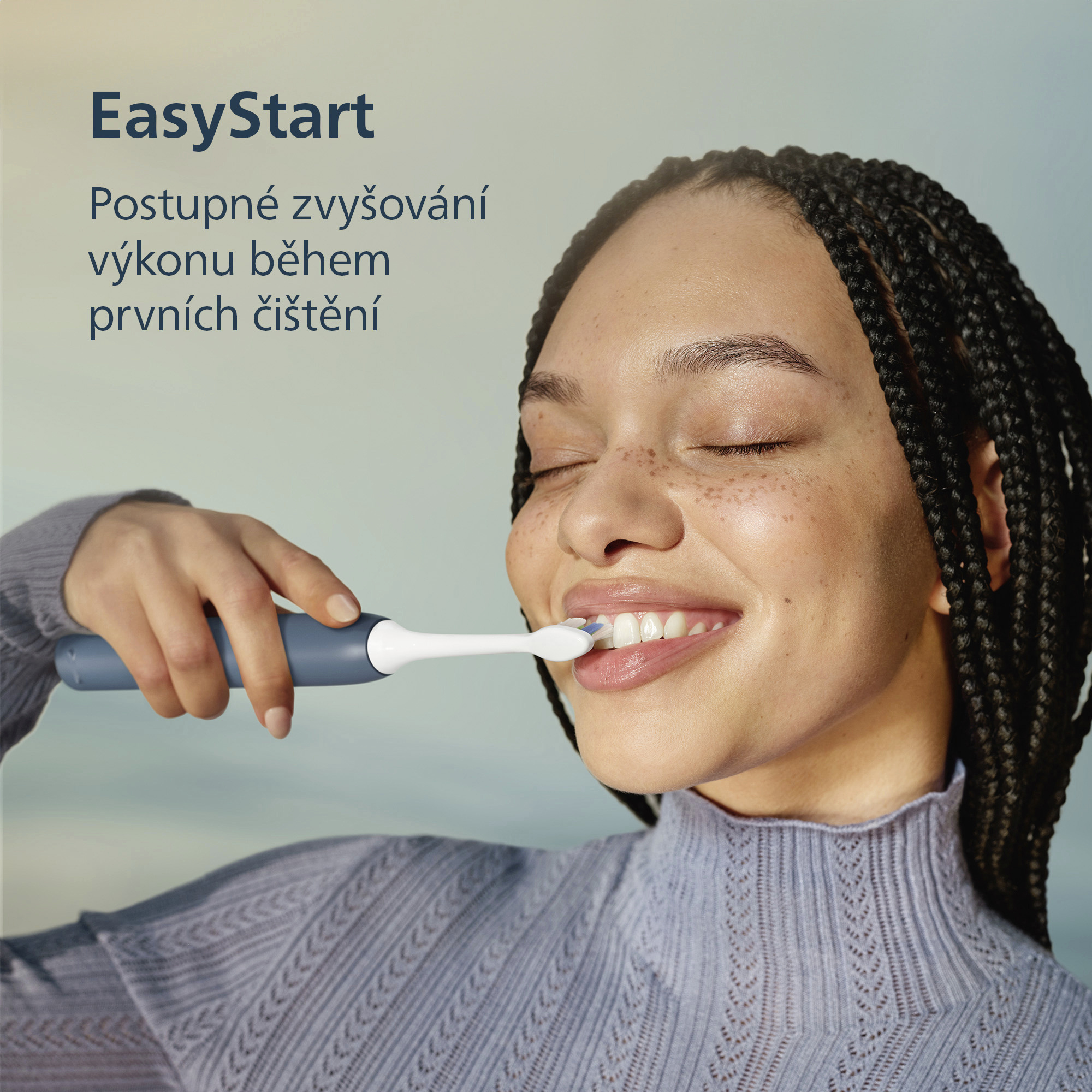 Kartáček je vybaven 2minutovým časovačem Smartimer a funkcí QuadPacer pro rovnoměrné vyčištění všech částí chrupu. Nabízí 2 režimy čištění a 2 úrovně intenzity pro individuální nastavení. Tlakový senzor upozorní na příliš silný tlak při čištění a funkce EasyStart usnadňuje přechod na sonickou technologii. Výdrž baterie až 21 dní zajistí pohodlné používání i na cestách.