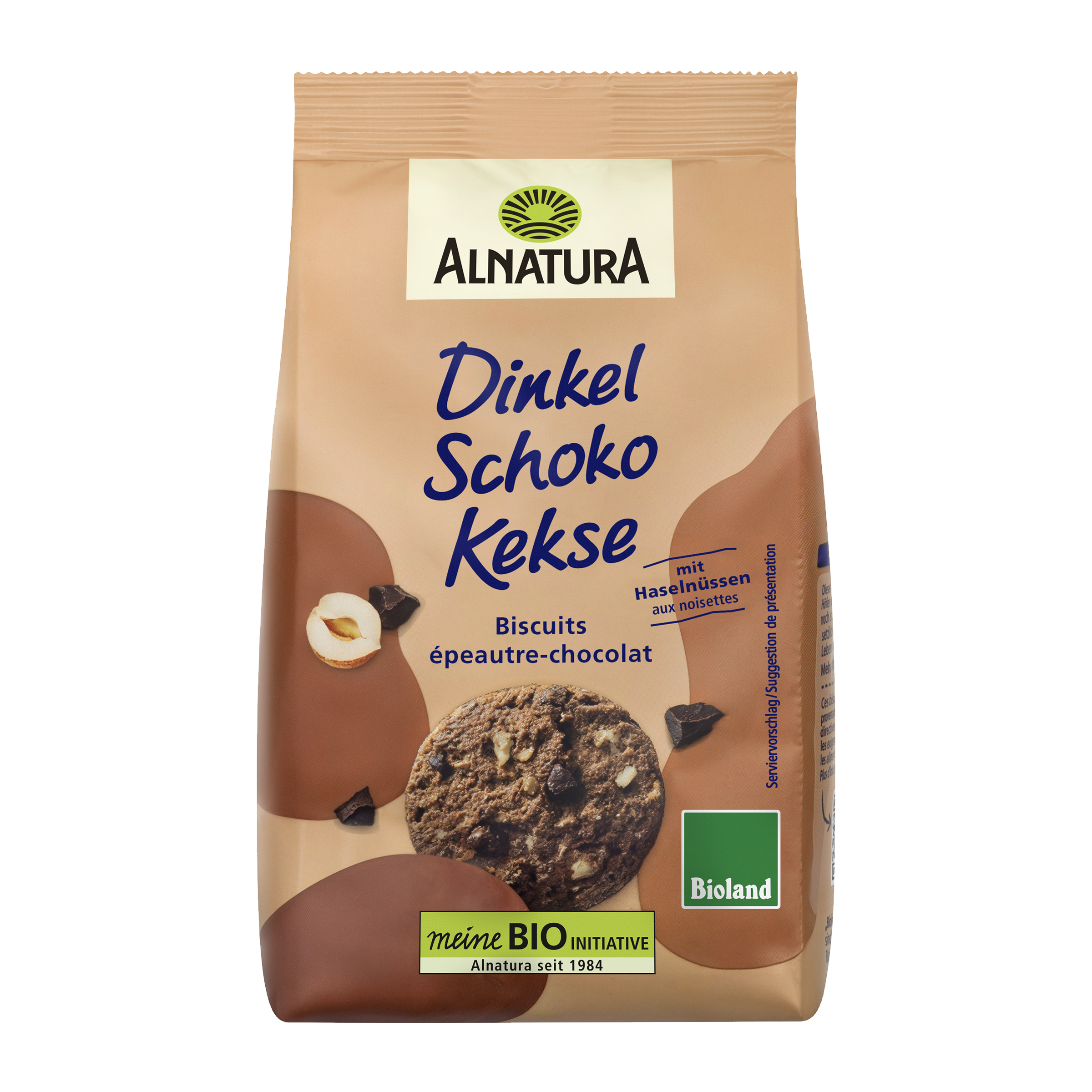 Křupavé a čokoládové bio sušenky z celozrnné špaldové mouky s kousky hořké čokolády a lískovými oříšky. V bio kvalitě Bioland a veganské.