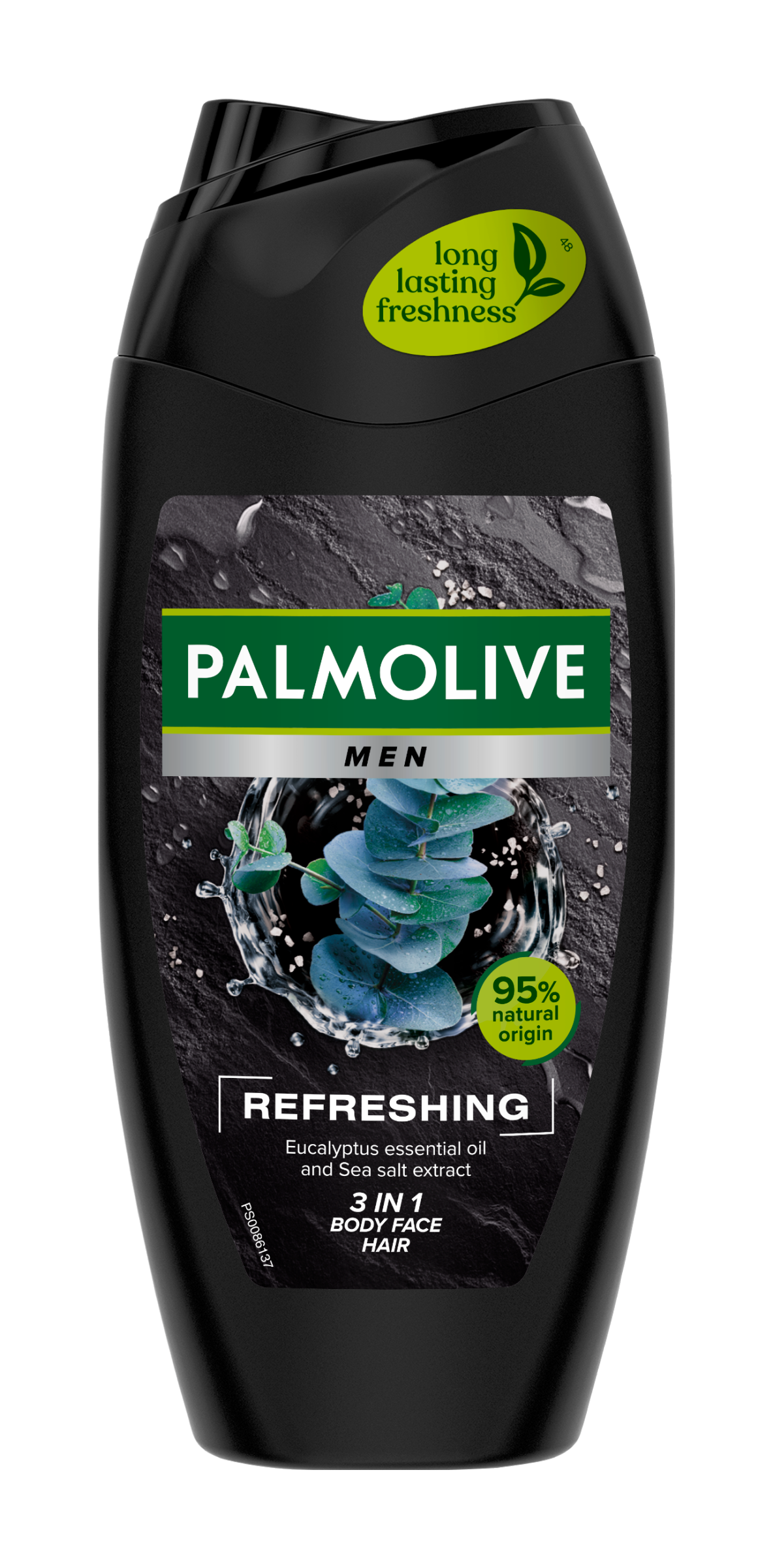 Při mytí osvěžujícím sprchovým gelem Palmolive Men 3 v 1 se budete cítit plní energie a spojeni s přírodou. Náš sprchový gel pro muže na tělo, obličej a vlasy má osvěžující vůni a 95 % biologicky odbouratelné složení s eukalyptovým olejem a extraktem z mořské soli.