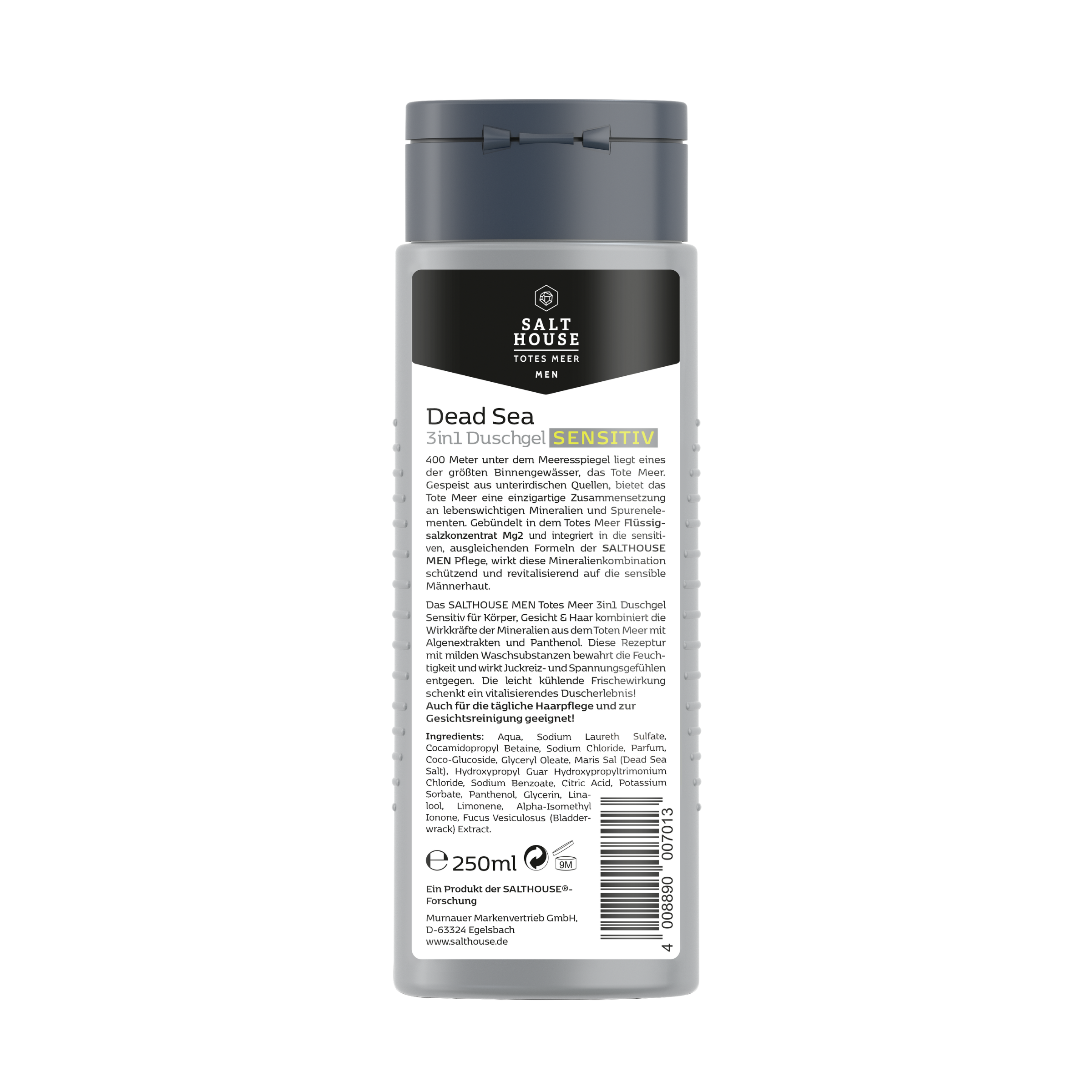 S výtažky z řas a panthenolem SALTHOUSE® JUST FOR MEN Sprchový gel z Mrtvého moře SENSITIVE na tělo, obličej a vlasy kombinuje aktivní sílu minerálů z Mrtvého moře s výtažky z řas a panthenolem. Toto složení s jemnými mycími látkami zachovává vlhkost a působí proti pocitům svědění a napětí.