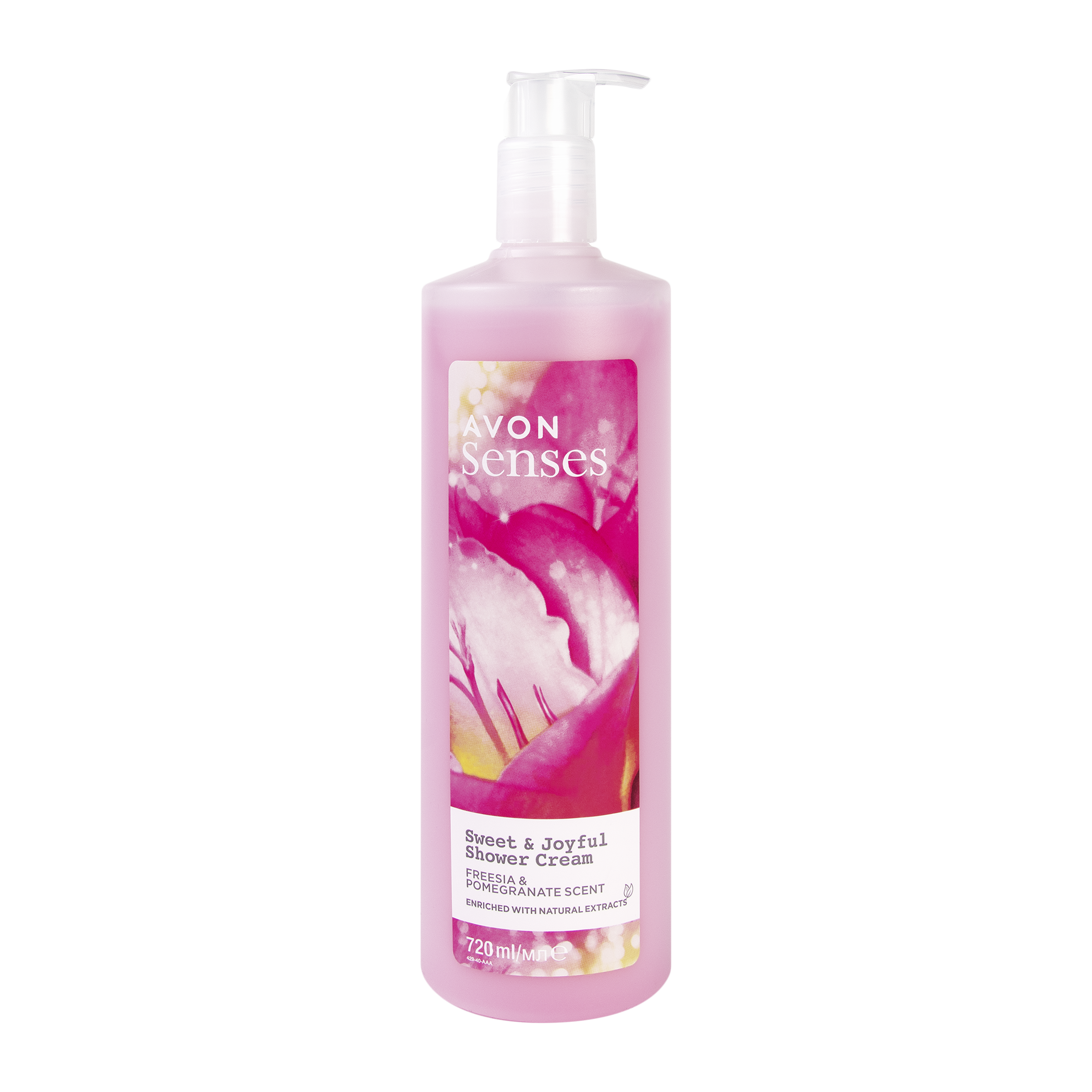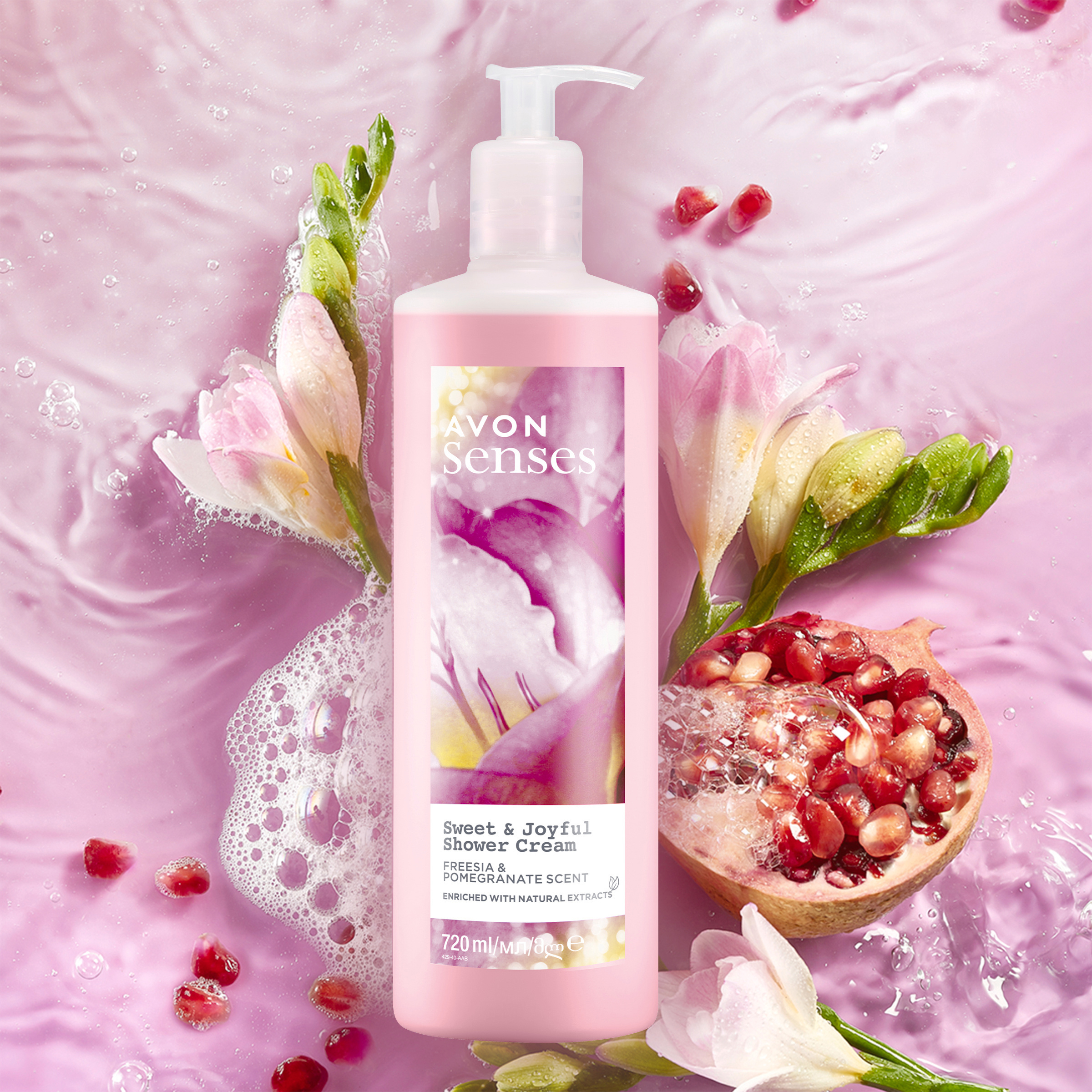 Sprchový gel Avon Senses Sweet & Joyful s nádhernou kombinací tónů granátového jablka a sladké frézie potěší vaše smysly.
