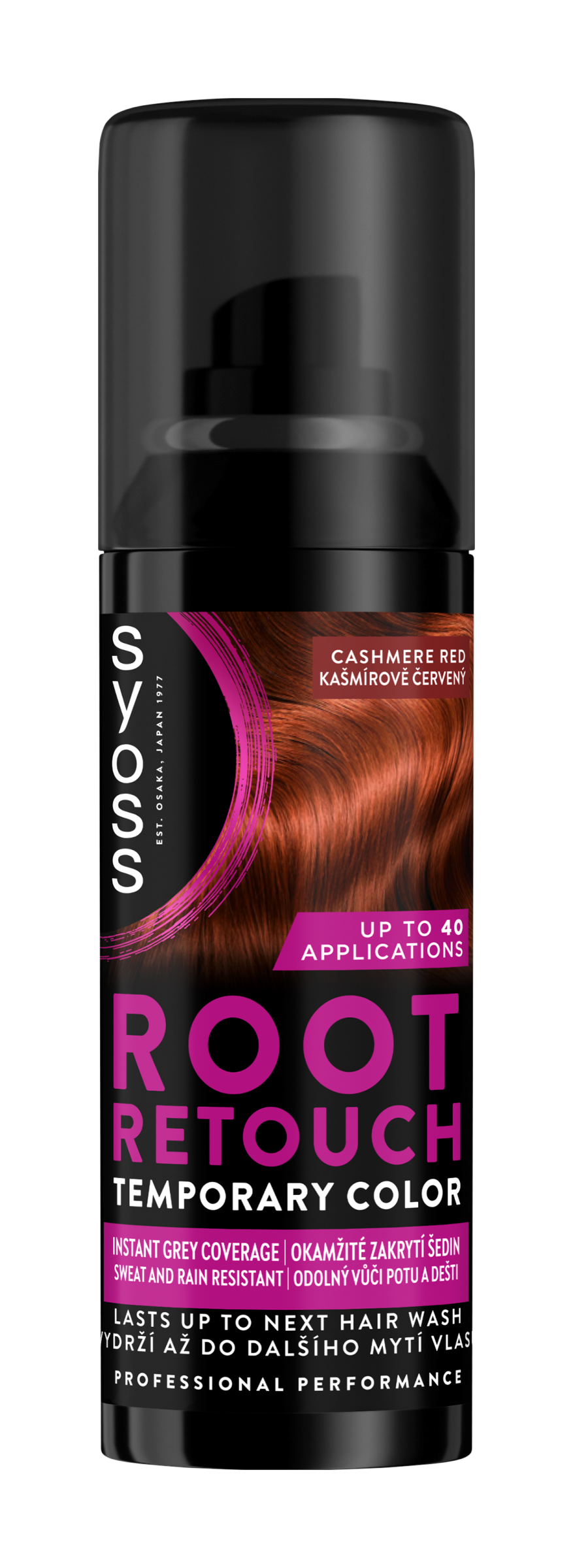 Syoss Root Retouch kašmírově červený až na 40 použití! Okamžitě zakryjte odrosty během několika sekund se sprejem Syoss Root Retouch! Tento sprej na úpravu odrostů je rychlý a snadný na použití díky okamžitému schnutí, které zajistí rovnoměrný barevný výsledek, jenž dokonale splyne s délkami vlasů. Kašmírově červený sprej na odrosty Syoss má přesný aplikátor, který vám pomůže zakrýt odrosty přesně tam, kde je to potřeba. Okamžité zakrytí odrostů během pár sekund.