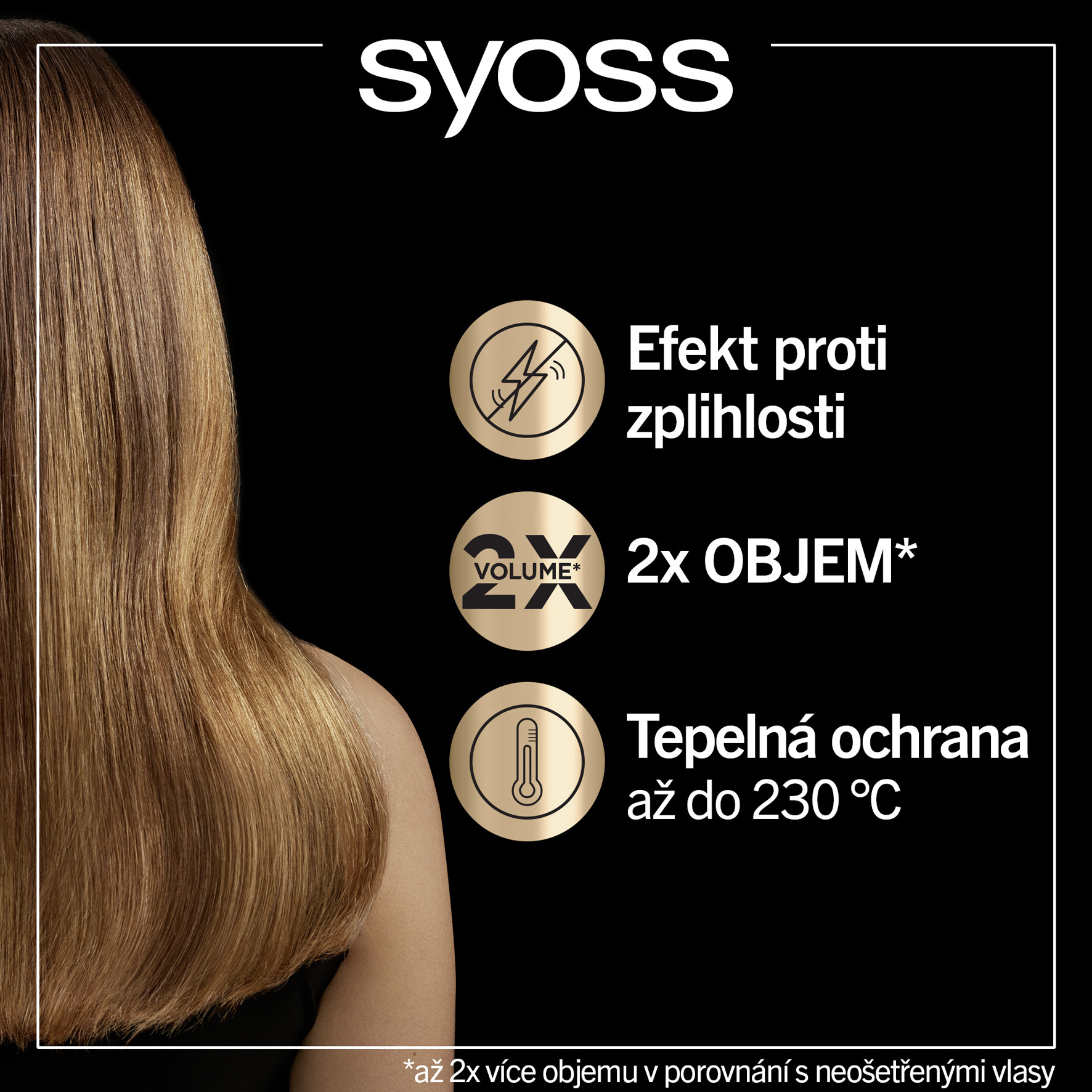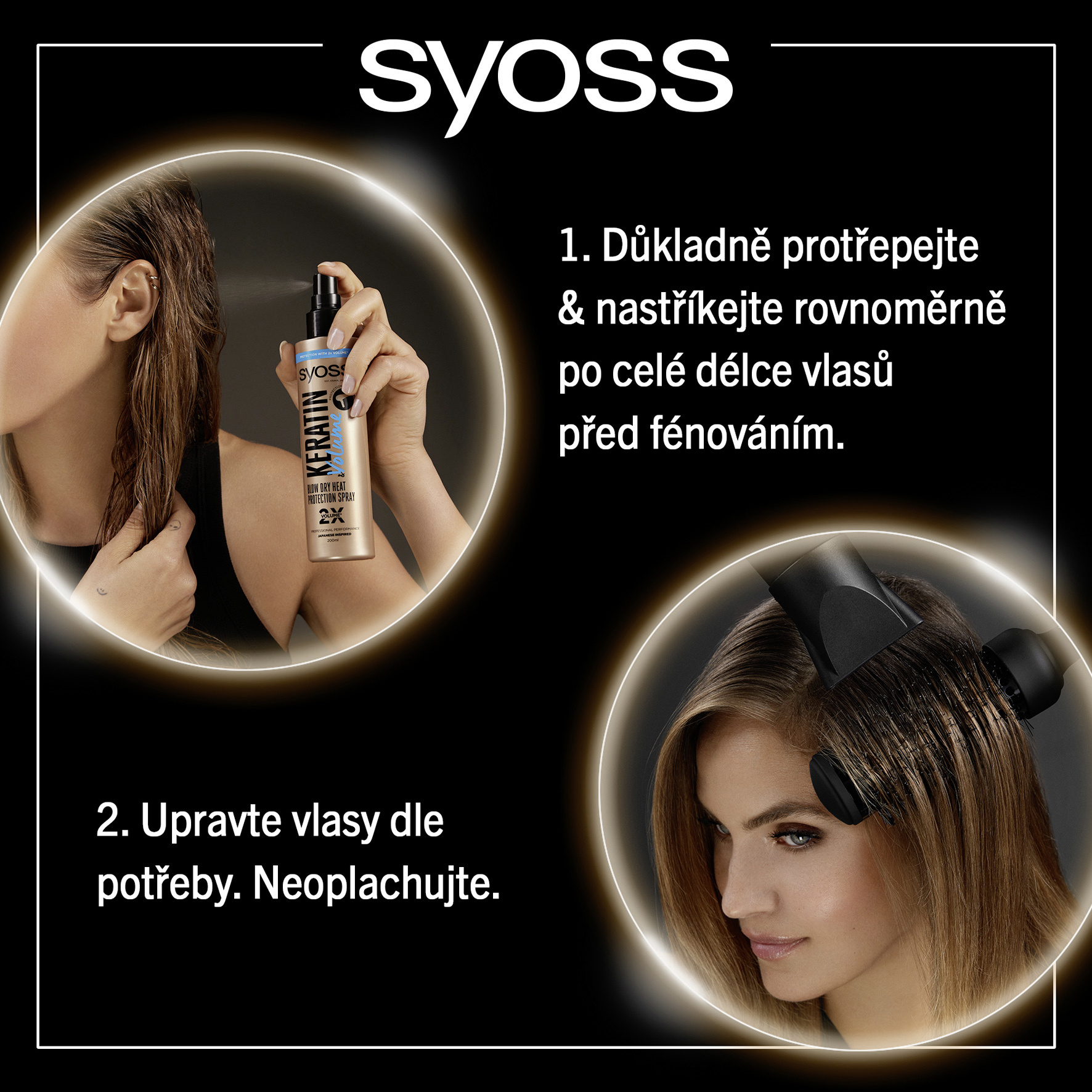 Syoss Keratin & Volume blow dry sprej pro tepelnou ochranu až do 230°C. Až 2x větší objem ve srovnání s neošetřenými vlasy. Efekt proti splihnutí účesu, pro sílu a strukturu vlasů přímo od kořínků.