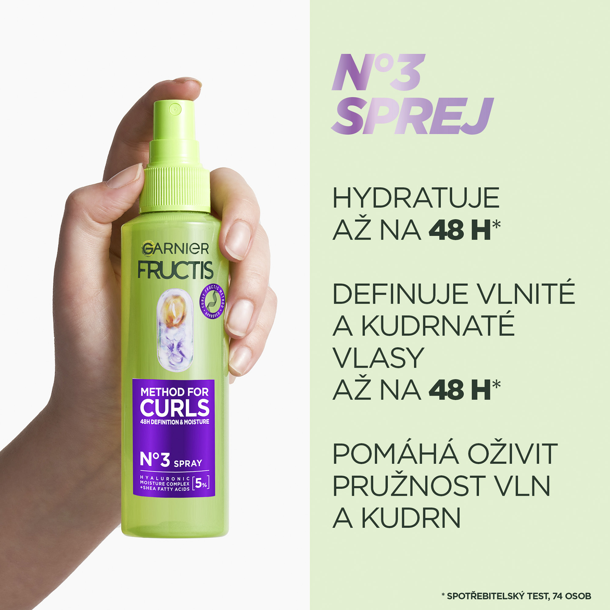 Hydratační sprej na vlasy Fructis Curly Hair pro suché vlnité a kudrnaté vlasy, hydratuje vlasové vlákno a napomáhá oživit pružnost vln a kudrn (1). Složení je obohaceno o hydratační hyaluronový komplex a mastné kyseliny z bambuckého másla. Vyvinuto, testováno a schváleno pro všechny typy vlnitých a kudrnatých vlasů (2).