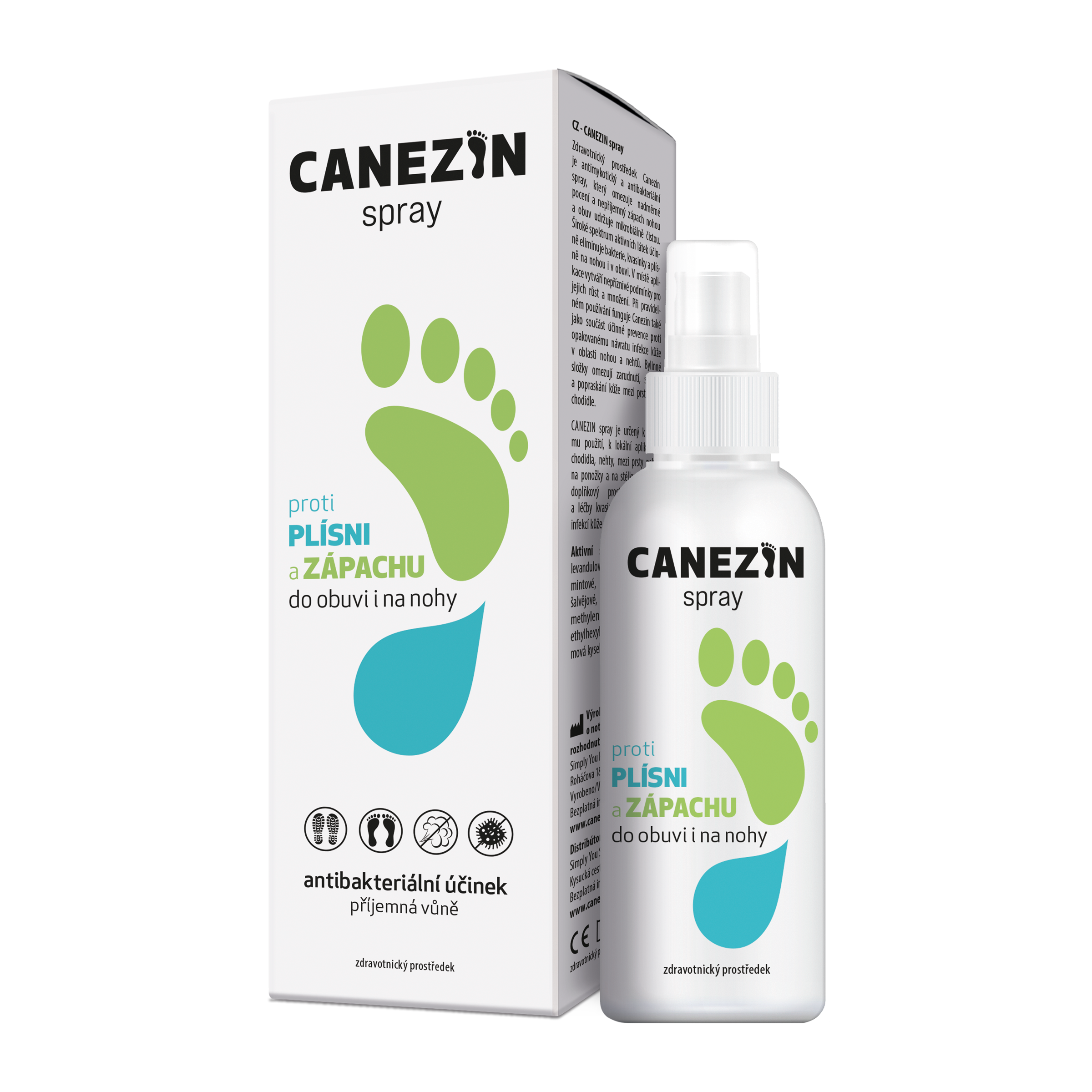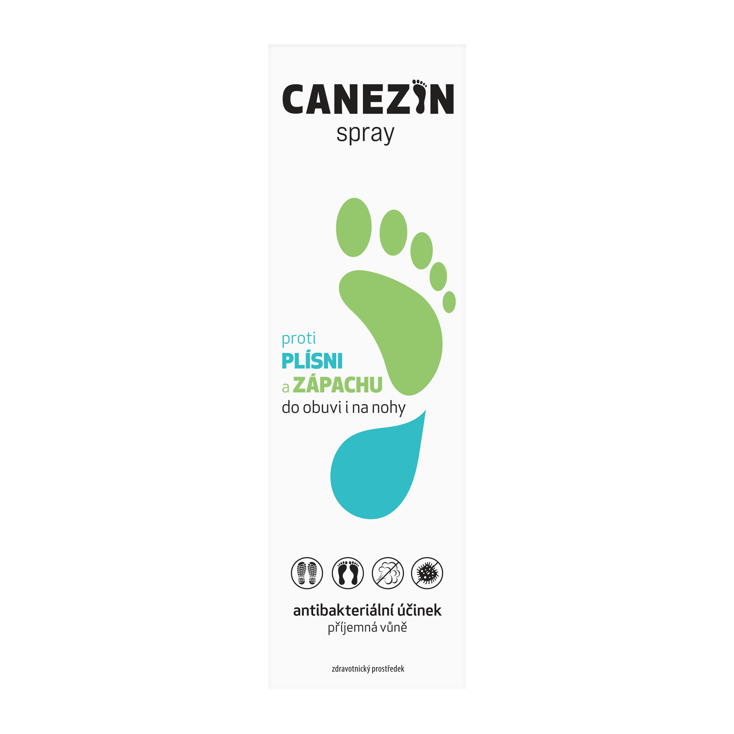 CANEZIN sprej je zdravotnický prostředek s antimykotickým a antibakteriálním účinkem do obuvi i na nohy. Omezuje nadměrné pocení a nepříjemný zápach nohou a obuv udržuje mikrobiálně čistou. Široké spektrum aktivních látek účinně eliminuje bakterie, kvasinky a plísně na nohou i v obuvi. V místě aplikace vytváří nepříznivé podmínky pro jejich růst a množení. Při pravidelném používání funguje Canezin také jako součást účinné prevence proti opakovanému návratu infekce kůže v oblasti nohou a nehtů. Bylinné složky omezují zarudnutí, svědění a popraskání kůže mezi prsty a na chodidle. Canezin spray je určený k zevnímu použití, k lokální aplikaci na chodidla, nehty, mezi prsty nohou, na ponožky a na stélku obuvi jako doplňkový prostředek prevence a léčby kvasinkových a plísňových infekcí kůže nohou a nehtů.