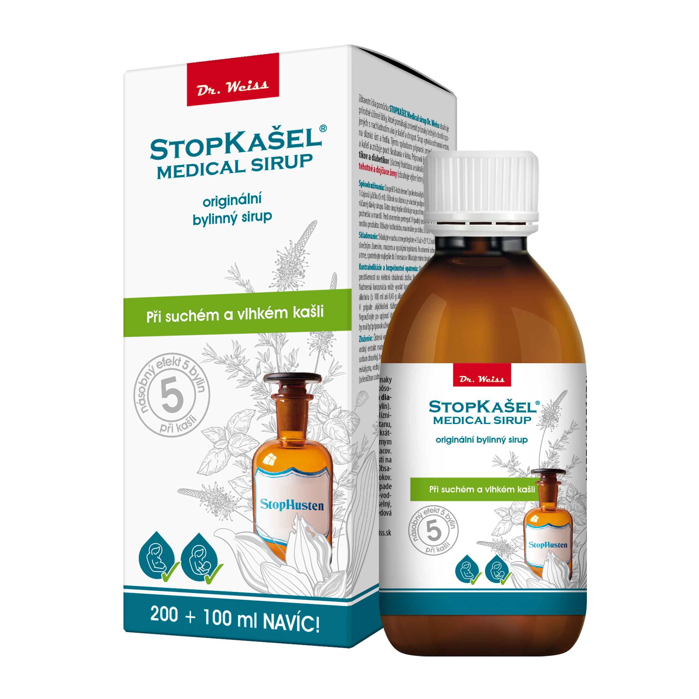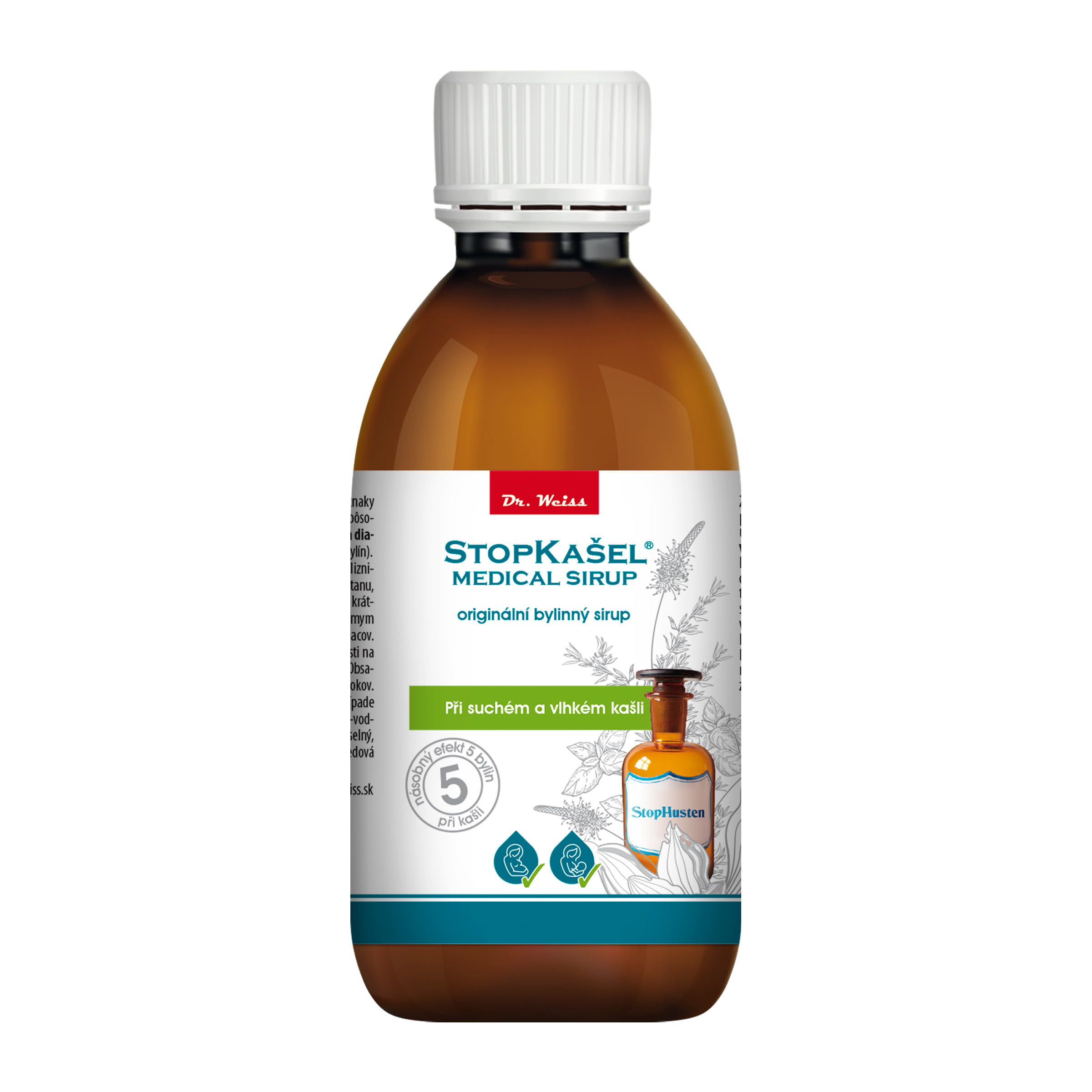 STOPKAŠEL Medical sirup Dr. Weiss je zdravotnický prostředek, který obsahuje unikátní směs 5 bylinných extraktů (jitrocel, boswellie, mateřídouška, bazalka, eukalyptus), které pomáhají při projevech suchého a vlhkého kašle.