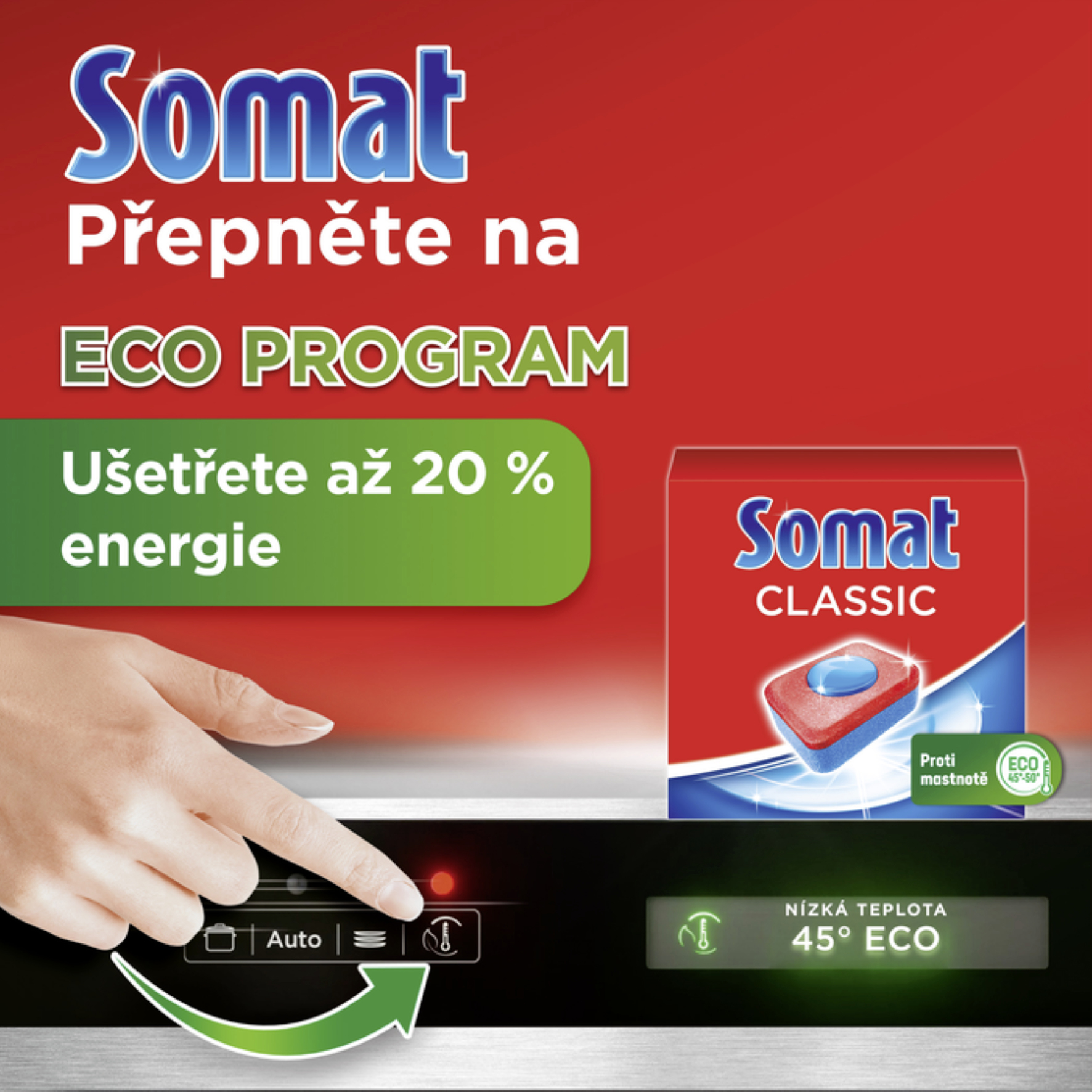 *Přechodem z normálního programu na krátký či eco program s nízkou teplotou můžete ušetřit vodu a až 20 % energie, přičemž dosáhnete vynikající čistoty a lesku. Pro méně špinavé nádobí zvolte krátký program s nízkou teplotou a pro běžně špinavé nádobí zvolte eco program s nízkou teplotou. Naše výrobky Somat jsou speciálně navrženy pro oba programy. Vyvarujte se používání intenzivního, extra sušícího nebo časově úsporného programu, jako je ""expresní/rychlý"", protože to by mohlo vést k vyšší spotřebě vody nebo energie.