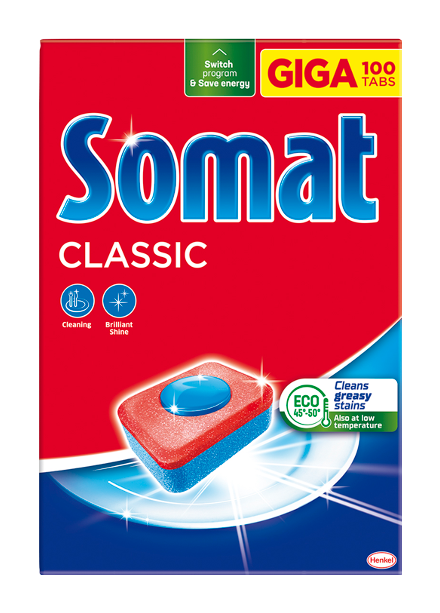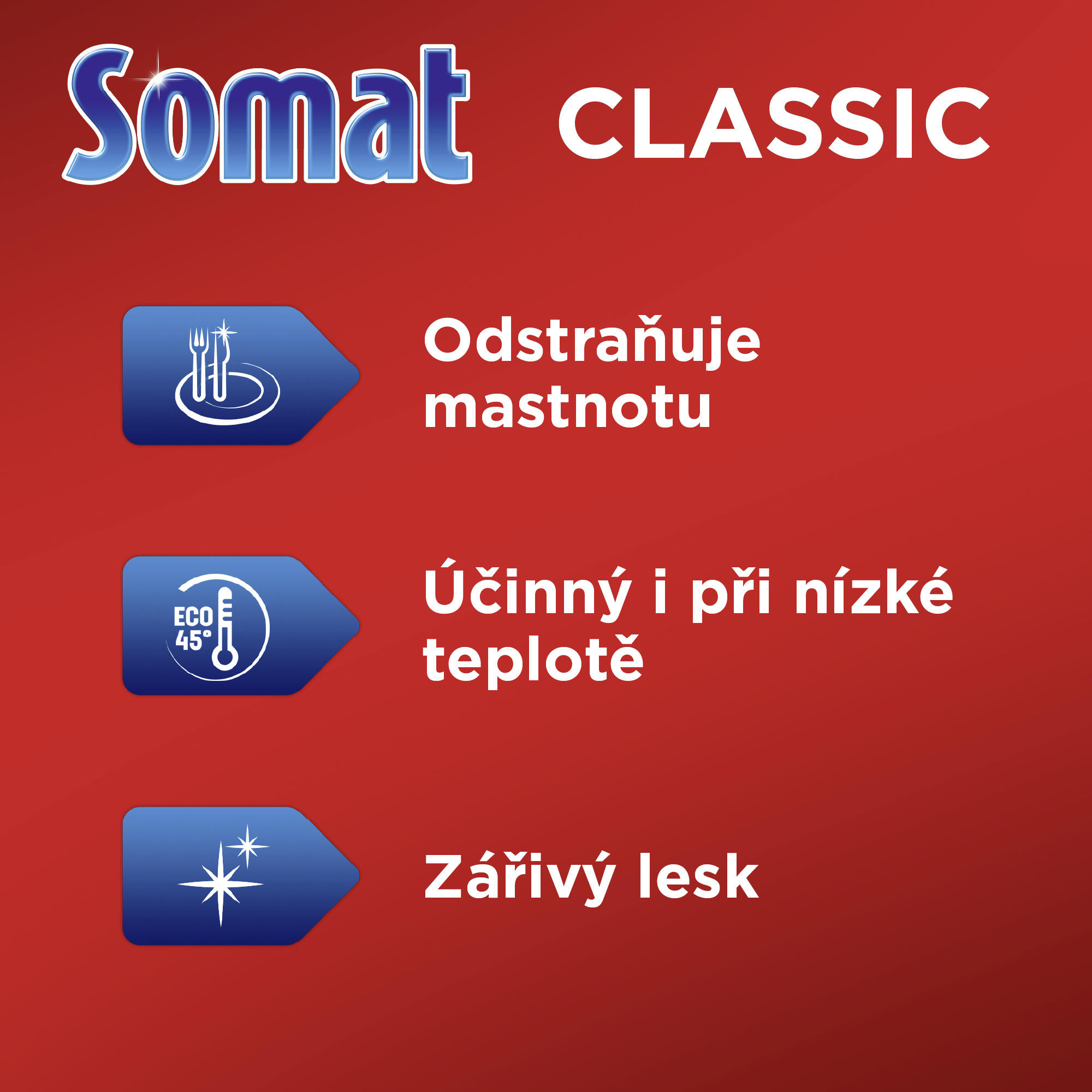 - RYCHLE A SNADNO: Jednoduše rozbalte tabletu mycího prostředku Somat Classic, vložte ji do dávkovací komory a zvolte eco program