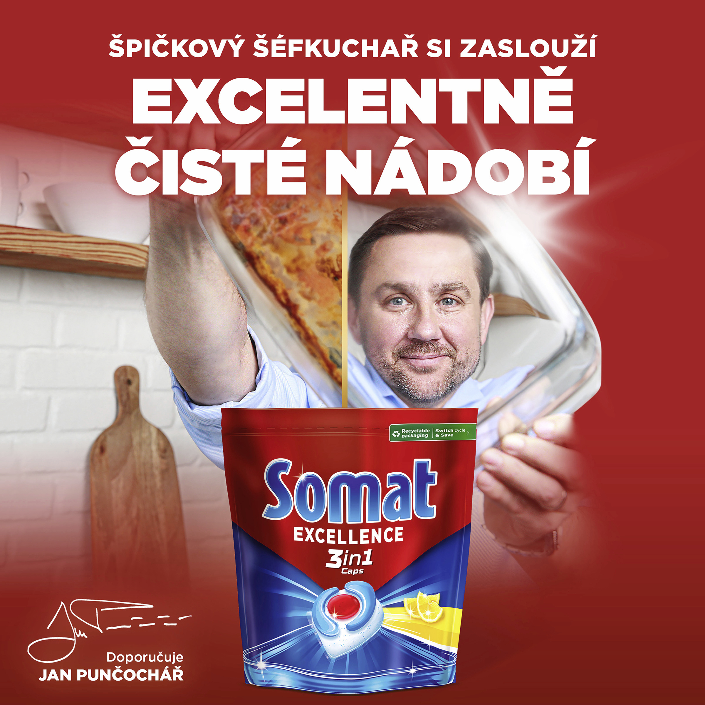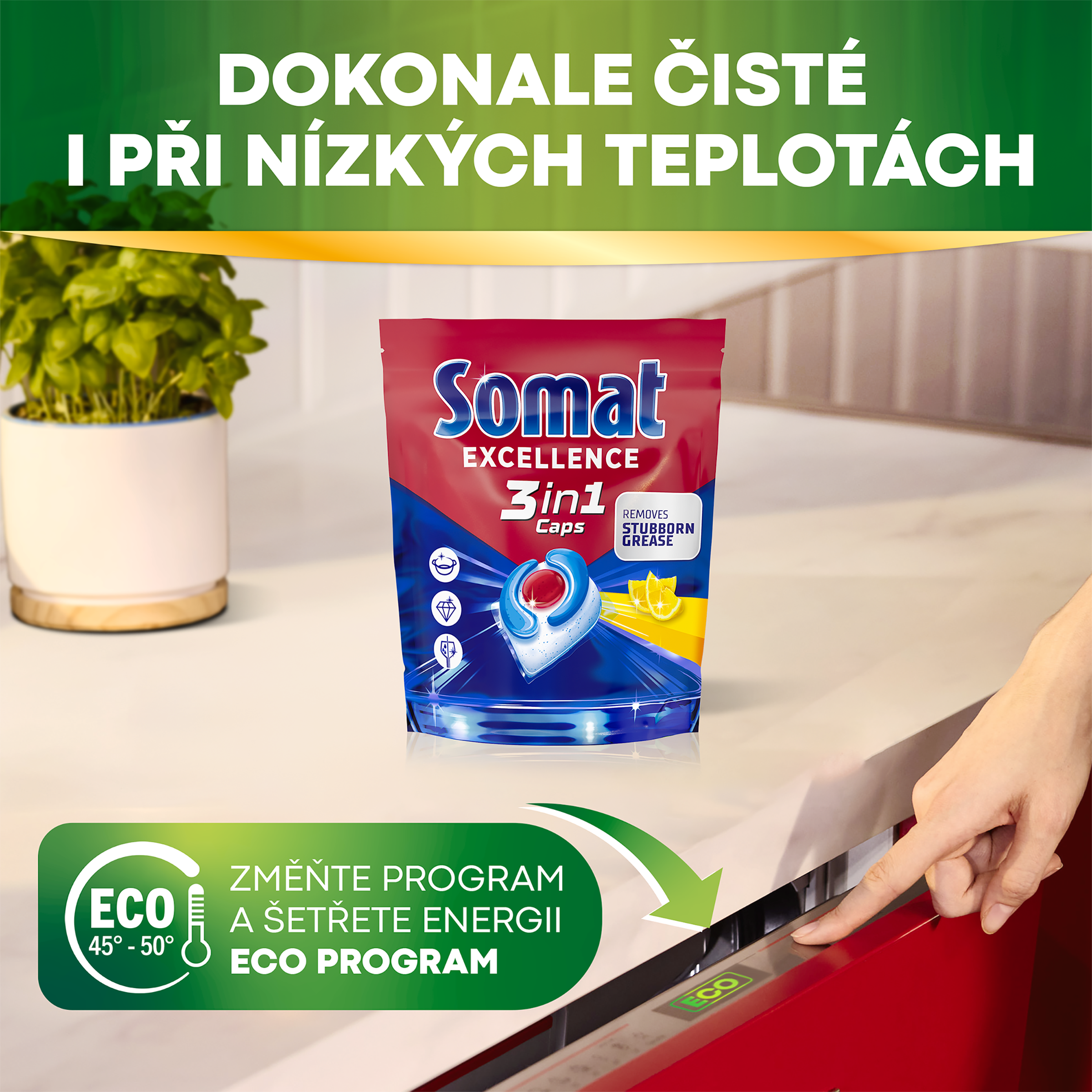 Somat zároveň pečuje o čistší planetu: kapsle má biologicky odbouratelnou a ve vodě rozpustnou fólii. Náš závod na výrobu kapslí funguje ze 100 % na obnovitelnou elektřinu.