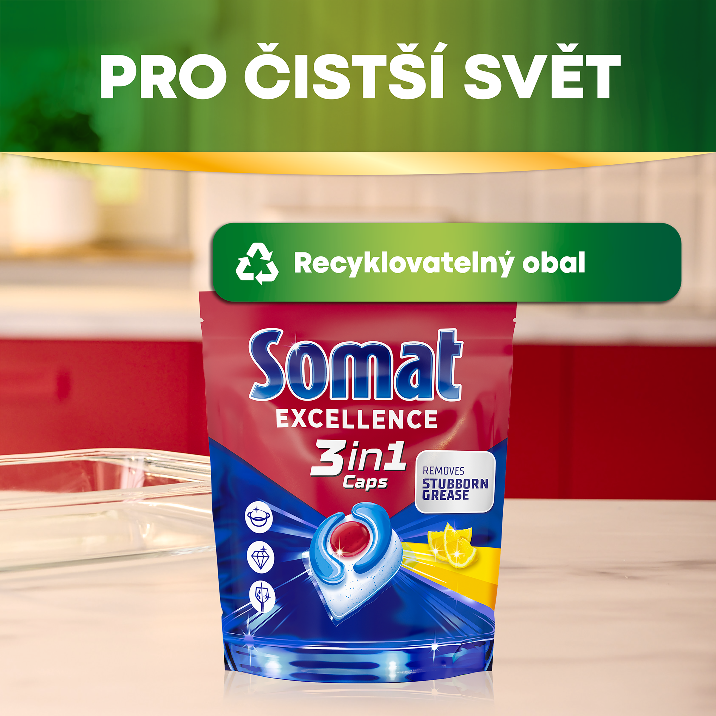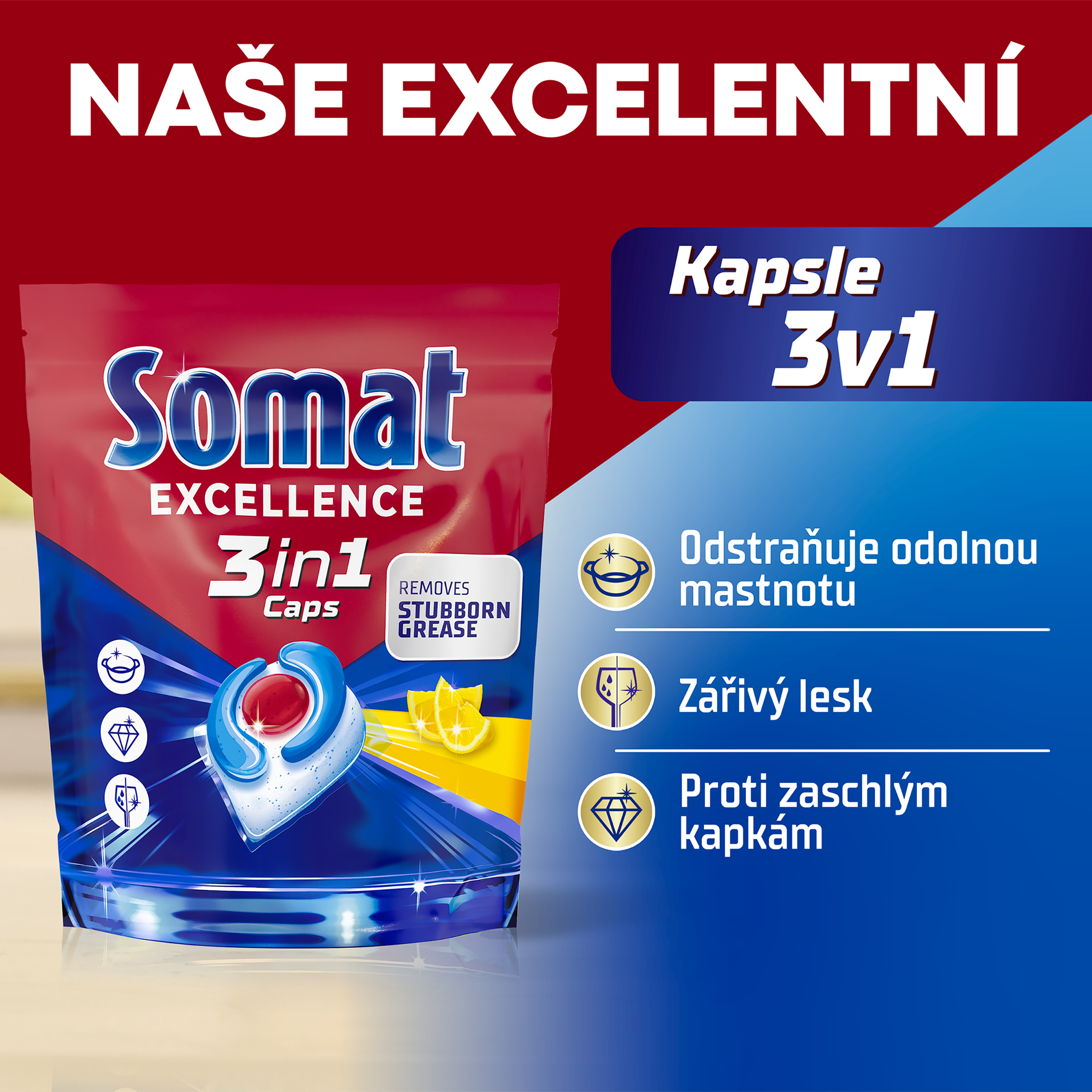 Somat 3v1 Lemon kapsle pro špičkové čisticí účinky, zářivý lesk a ochranu proti skvrnám od vody! (Vůně Lemon Fresh) Složení kapslí Somat Excellence 3v1 Lemon pro mytí nádobí kombinuje tři hlavní výhody: odstraňuje odolnou mastnotu, zabraňuje vzniku vodních skvrn pro zářivý lesk a chrání křehké nádobí před korozí. Rychle rozpustné prémiové kapsle obsahují prášek a tři komory s gelem v biologicky odbouratelném a 100% ve vodě rozpustném obalu. Kapsle Somat jsou vhodné pro všechny druhy nádobí určeného do myčky - talíře, sklenice, šálky, lahve, hrnce, příbory, plasty i pánve. Užijte si zářivě čisté nádobí po každém mycím cyklu - nyní s osvěžující vůní Lemon Fresh a špičkovým čisticím výkonem! Šetřete vodu a energii s produkty Somat do myčky! Pro běžně znečištěné nádobí zvolte ekologický program s nízkou teplotou - kapsle si poradí i s odolnými zbytky jídla a zanechá nádobí čisté a bez skvrn.
