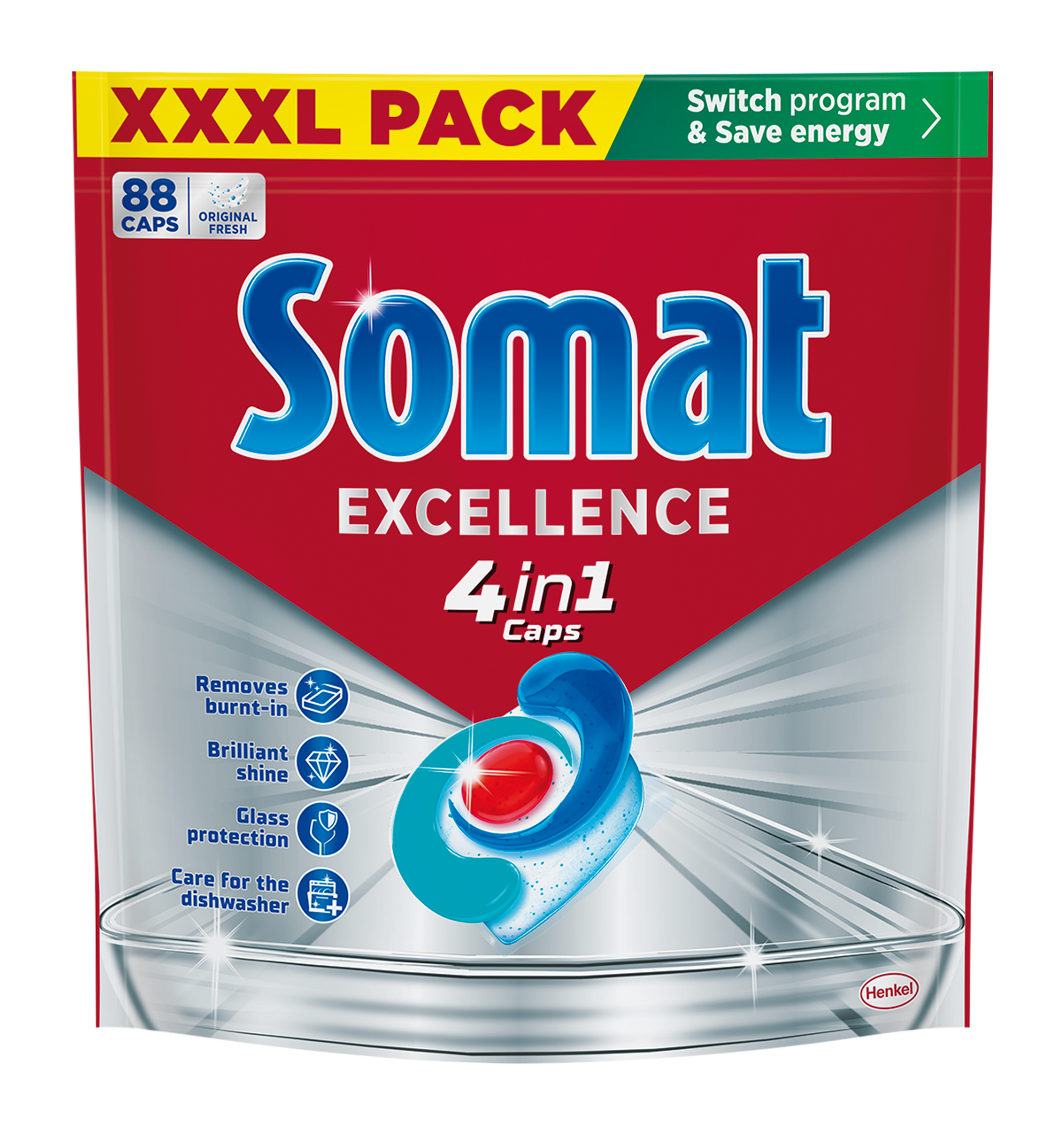 Kapsle na nádobí Somat Excellence 4v1 pro dokonalé čištění, zářivý lesk a šetrnou péči o nádobí i myčku! Složení kapslí do myčky Somat Excellence 4v1 kombinuje 4 síly: hloubkové čištění pro rozpouštění připálených zbytků jídla a usazené mastnoty, žádné zaschlé stopy po vodě pro dokonalý lesk, ochranu choulostivého nádobí před korozí a péči o myčku. Rychle se rozpouštějící prémiové kapsle kombinují práškový mycí prostředek a 3 pevné gelové komory v biologicky odbouratelné a ve vodě 100% rozpustné fólii. Kapsle Excellence 4v1 mají silné enzymatické složení, které rozpouští připálené zbytky jídla, usazenou mastnotu a odolné skvrny, a to i na eco program s nízkou teplotou. Kapsle Somat jsou vhodné pro všechny talíře, sklenice, hrnky, láhve, hrnce, plasty a pánve, které lze mýt v myčce. Prémiový prostředek na mytí nádobí 4v1 nezanechává žádné zbytky ani zaschlé skvrny od vody, což znamená, že po skončení programu v myčce není třeba nádobí znovu mýt ani leštit. Užijte si zářivě čisté nádobí po každém mycím programu! Kapsle do myčky Somat Excellence 4v1 jsou speciálně vyvinuty pro krátké a eco programy s nízkou teplotou. Přepněte program a ušetřete vodu a až 20 % energie* se Somatem! Výhody produktu: Hloubkové čištění připálených zbytků jídla a usazené mastnoty i na eco program s nízkou teplotou. Zanechává nádobí dokonale čisté a se zářivým leskem. Díky složení proti zápachu jsou nepříjemné pachy v myčce neutralizovány v momentu rozpuštení kapsle. Nabízí ochranu proti korozi choulostivého nádobí. Speciální složení pro péči o myčku nádobí. *Přechodem z normálního programu na krátký či eco program s nízkou teplotou můžete ušetřit vodu a až 20 % energie, přičemž dosáhnete vynikající čistoty a lesku.