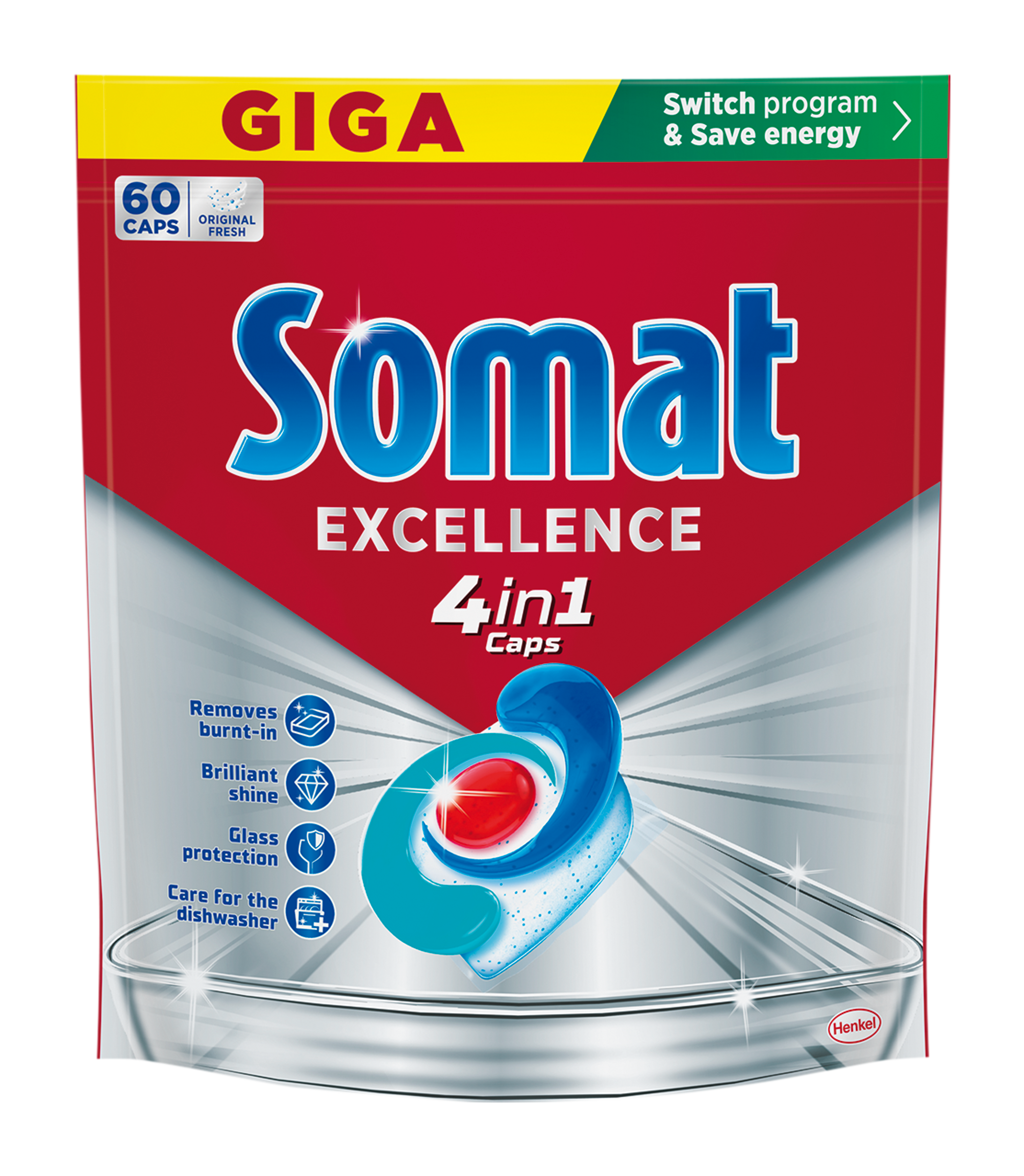 Kapsle na nádobí Somat Excellence 4v1 pro dokonalé čištění, zářivý lesk a šetrnou péči o nádobí i myčku! Složení kapslí do myčky Somat Excellence 4v1 kombinuje 4 síly: hloubkové čištění pro rozpouštění připálených zbytků jídla a usazené mastnoty, žádné zaschlé stopy po vodě pro dokonalý lesk, ochranu choulostivého nádobí před korozí a péči o myčku. Rychle se rozpouštějící prémiové kapsle kombinují práškový mycí prostředek a 3 pevné gelové komory v biologicky odbouratelné a ve vodě 100% rozpustné fólii. Kapsle Excellence 4v1 mají silné enzymatické složení, které rozpouští připálené zbytky jídla, usazenou mastnotu a odolné skvrny, a to i na eco program s nízkou teplotou.
