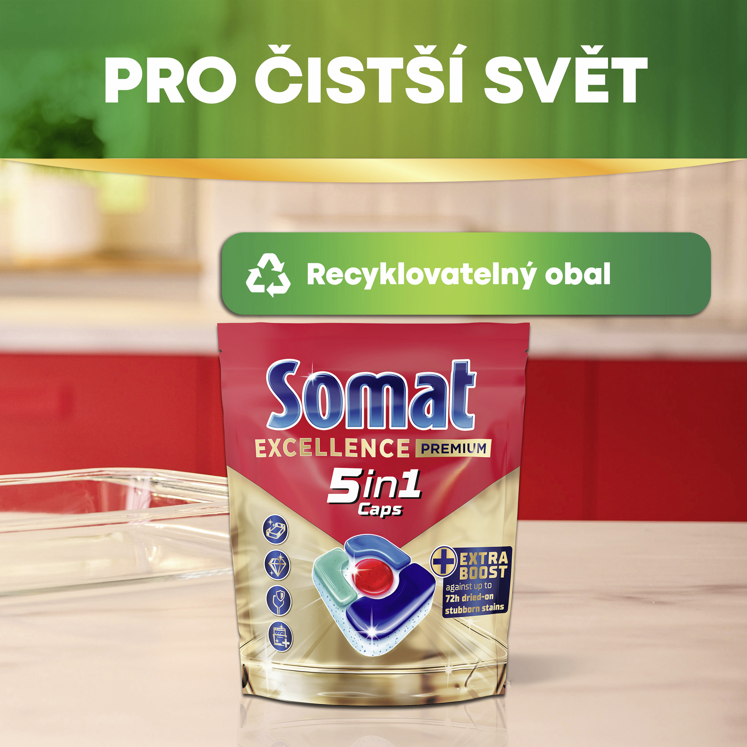 Somat Excellence 5v1 kapsle na nádobí - Navrženo tak, aby účinně odstraňovaly až 72 hodin zaschlé odolné skvrny a zajistily hloubkově čistý výsledek. S kapslemi Somat Excellence na automatické mytí nádobí se můžete spolehnout, že všechno vaše nádobí, které lze umýt v myčce; od talířů; sklenic; hrnků; lahví; hrnců; plastového nádobí; až po pánve; bude účinně vyčištěno a zůstane beze skrvn. Toto nové složení snižuje nutnost ručního čištění. Somat nejenže klade důraz na vynikající čisticí výkon, ale také pečuje o dlouhou životnost vaší myčky a vašeho nádobí. Kapsle do myčky Somat Excellence 5v1 jsou speciálně navrženy pro krátké mycí programy a také pro ekologické cykly při nízkých teplotách. Přepněte program a ušetřete vodu a až 20 % energie se Somat.