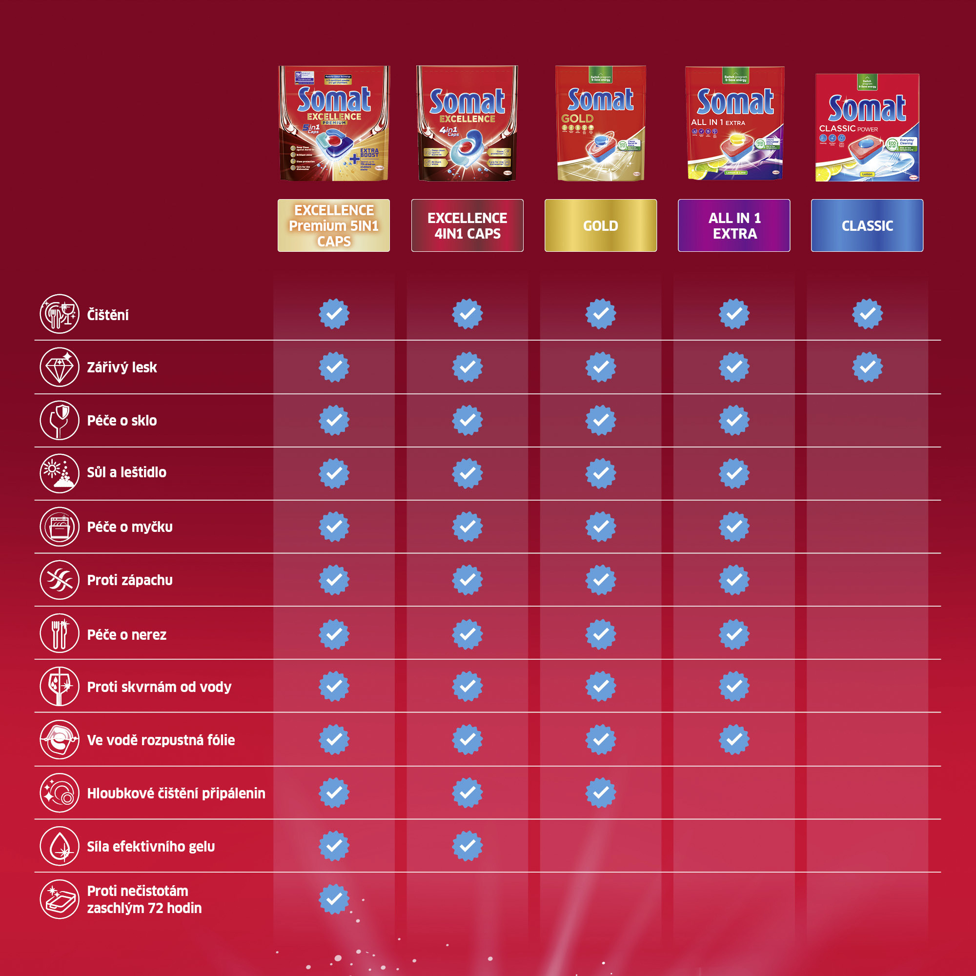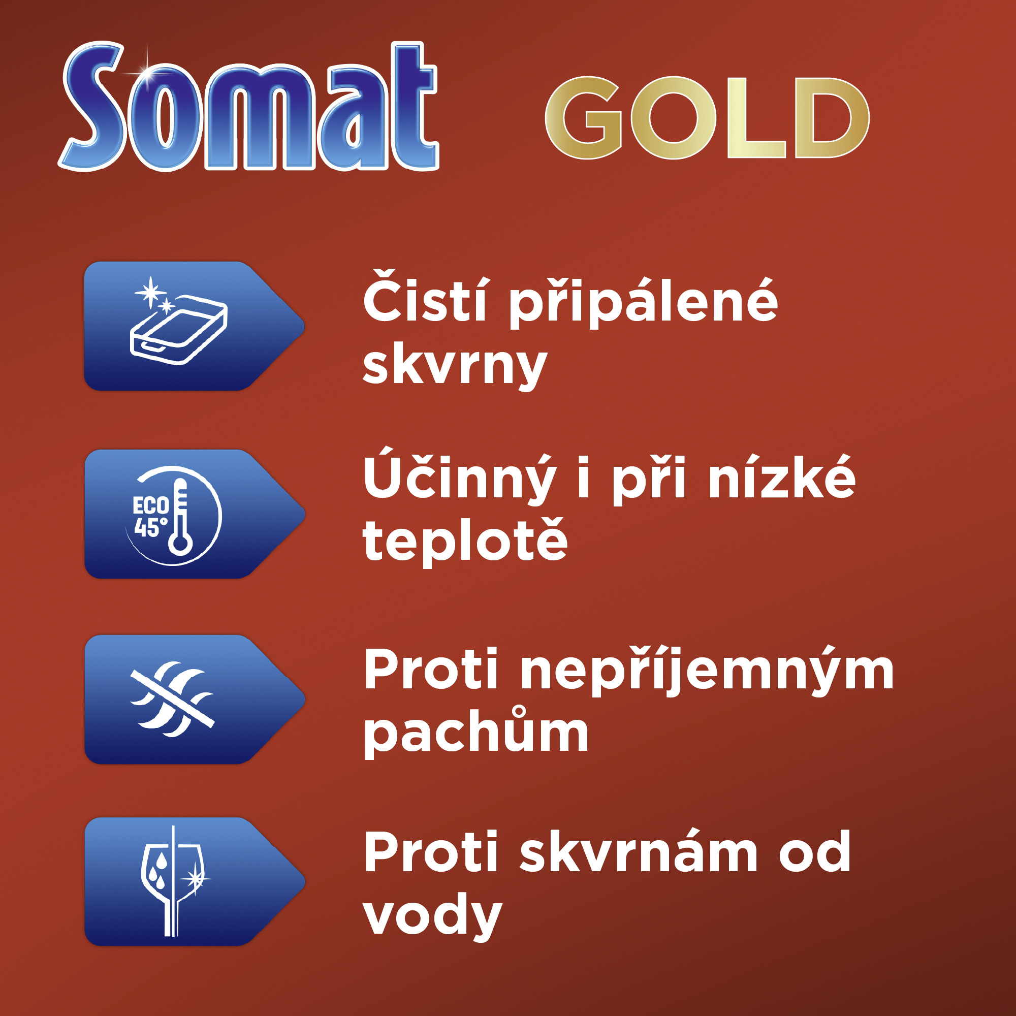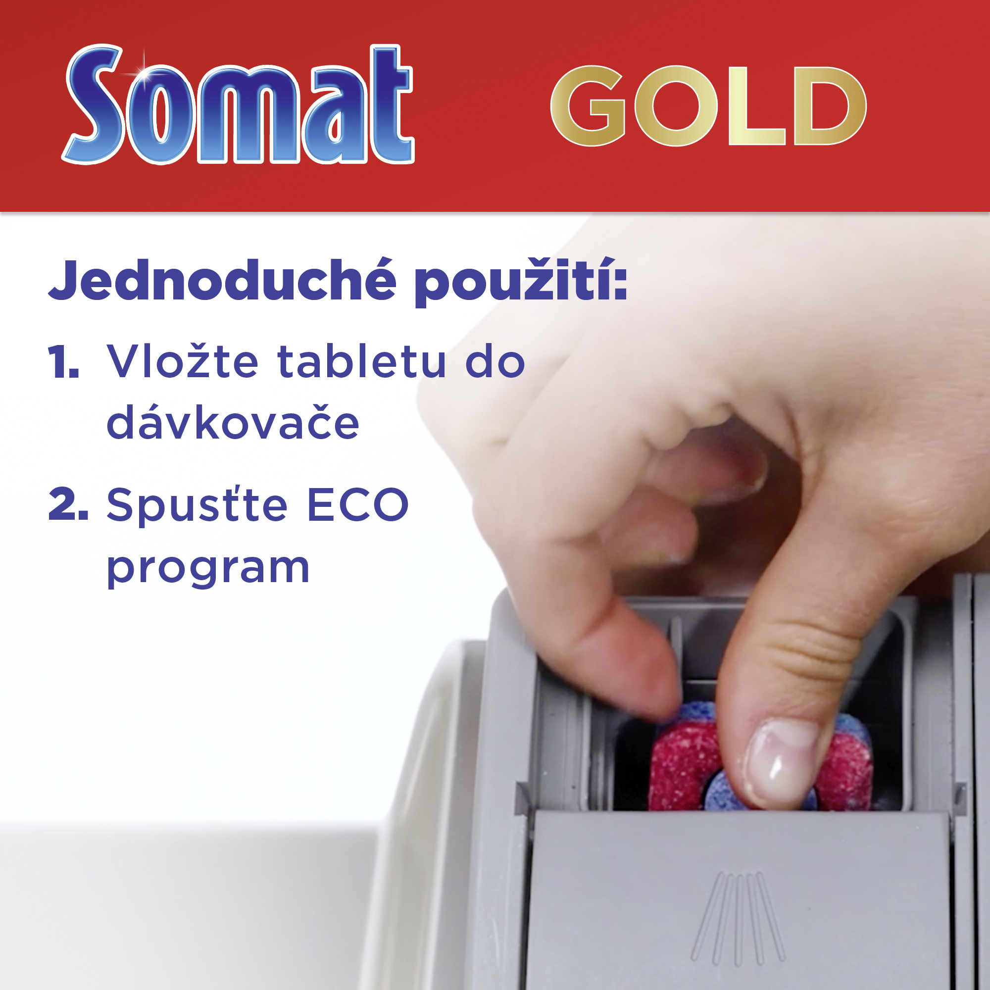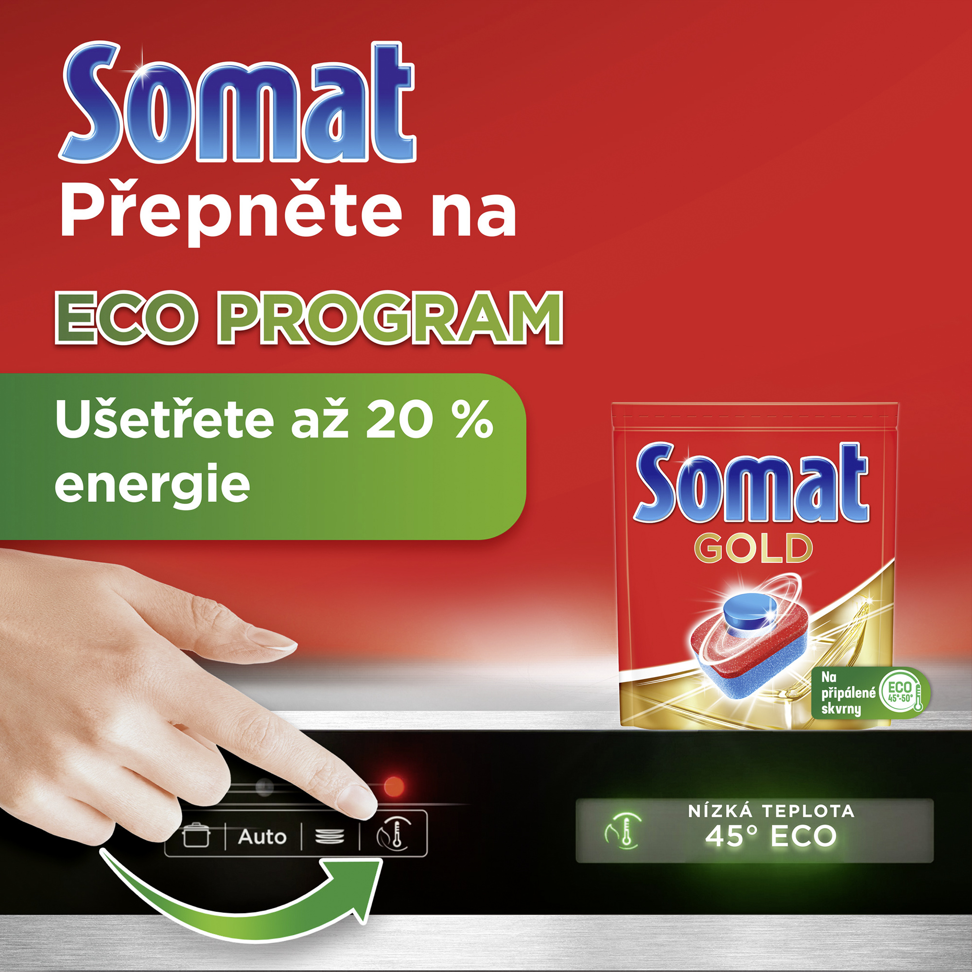 - PŘEPNĚTE PROGRAM A UŠETŘETE: Tablety na nádobí Somat Gold jsou určeny pro krátké a eco programy s nízkou teplotou. Vysoce aktivní složení efektivně myje nádobí i při nízkých teplotách a šetří energii až o 20 %*.