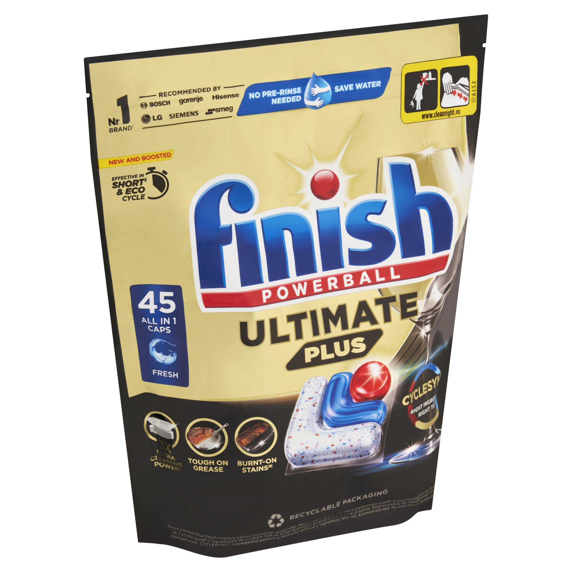 Tablety Finish Ultimate Plus All in 1 pro intenzivní čištění a diamantový lesk vždy hned napoprvé. Jedná se o vůbec první kapsli s technologií Cyclesyncᵀᴹ, která uvolňuje tu správnou složku*** ve správný čas. Pokročilé složení si poradí i s odolnými skvrnami bez nutnosti předmývat a přináší 4 akce v průběhu celého mycího cyklu. Kapsle chrání a pečují o skleněné nádobí a příbory a udržují jejich lesk s každým mytím. Náš revoluční výkon s o 15 % nižší hmotností chemikálií v porovnání s tabletami Finish Power All in 1. Obsahuje pečující látky, které pomáhají chránit vaše sklo před korozí a zakalením. Tento produkt nechrání před mechanickým poškozením ani neobnovuje již poškozené materiály.