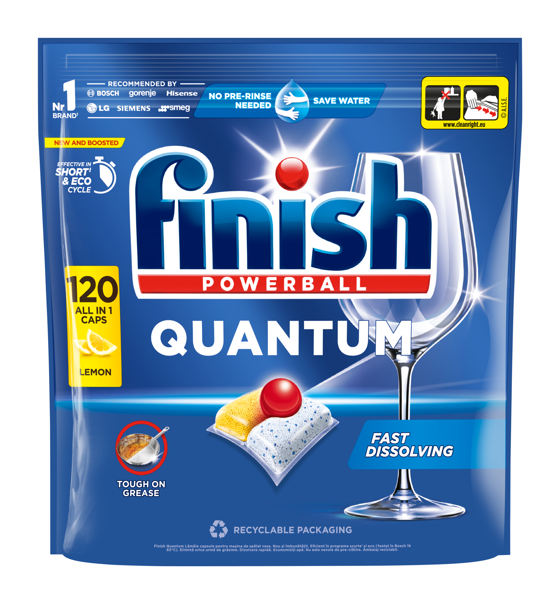Tablety do myčky Finish Quantum s ohromující silou gelu jsou ideálním pomocníkem při mytí nádobí v každé myčce. Chrání sklo před korozí, pečují o stříbro a zaručí vždy dokonale čistý výsledek. Mastnota a zaschlé jídlo jsou prakticky bez šance. Gelové tablety Finish Quantum zabraňují i usazování vodního kamene, který je postrachem všech myček, a v čistotě udržují i filtr samotné myčky. Pro zajištění nejlepších výsledků doporučujeme použít Finish sůl a leštidlo.