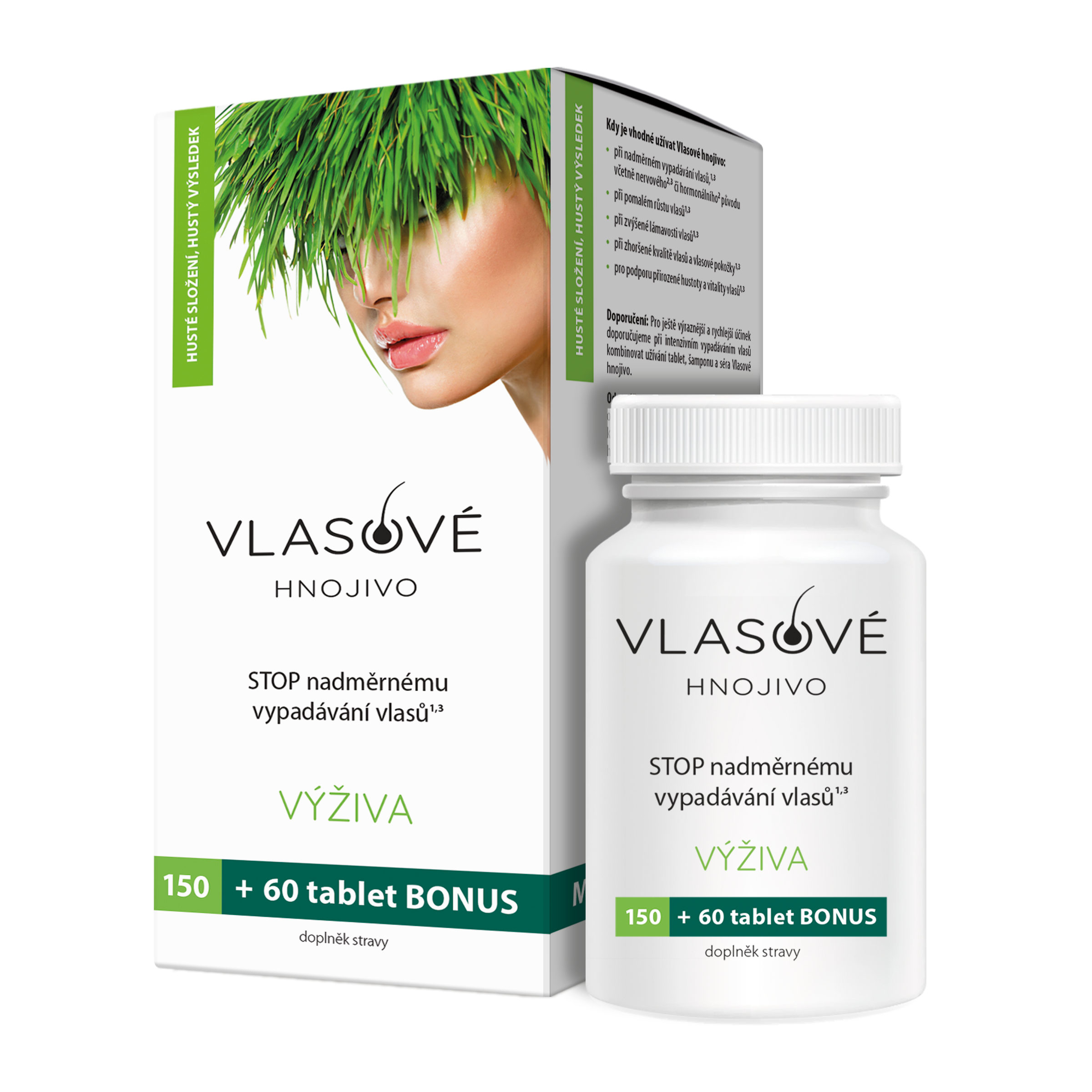 Vlasové hnojivo je unikátní doplněk stravy s aminokyselinami, MSM a biotinem přinášející účinnou pomoc v boji s nadměrným vypadáváním a ztrátou vlasů, jejich pomalým růstem a špatnou kvalitou. Vlasové hnojivo obsahuje pečlivě zvolenou kombinaci látek s komplexním účinkem na stav vlasů. Přípravek obsahuje aminokyseliny, zdroje keratinu představujícího základní stavební prvek vlasových buněk. Nejdůležitější jsou pro vlasy aminokyseliny jako je metionin a cystein, které jsou obsaženy ve Vlasovém hnojivu. Klíčový je také obsah methylsulfonylmethanu, zdroje síry, která je již tradičně označována za „minerál krásy“. Přípravek obsahuje rovněž vitaminy skupiny B, jako je kyselina pantothenová a biotin, důležitý pro růst a kvalitu vlasových buněk a jejich návrat k přirozenému stavu. Ve Vlasovém hnojivu jsou obsaženy zvýšené dávky minerálu křemíku a zinek pro přirozenou kvalitu vlasů a vlasové pokožky zodpovědné za pevné uchycení vlasových cibulek.