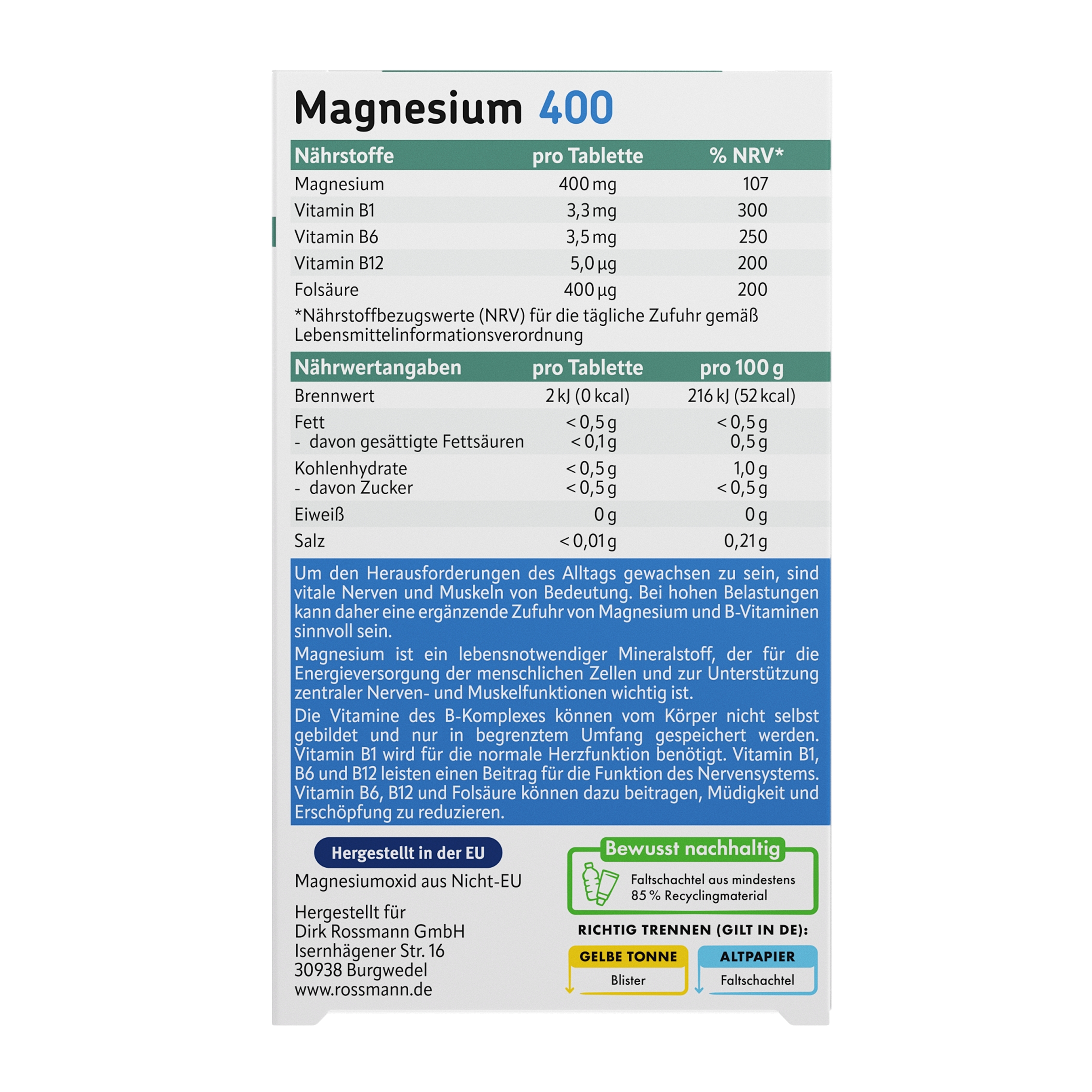oxid hořečnatý, plnidlo: celulóza, maltodextrin, pyridoxin-hydrochlorid (vitamin B6), thiamin-hydrochlorid (vitamin B1), protispékavá látka: hořečnaté soli mastných kyselin, kyselina pteroylmonoglutamová (kyselina listová), kyanokobalamin (vitamin B12).