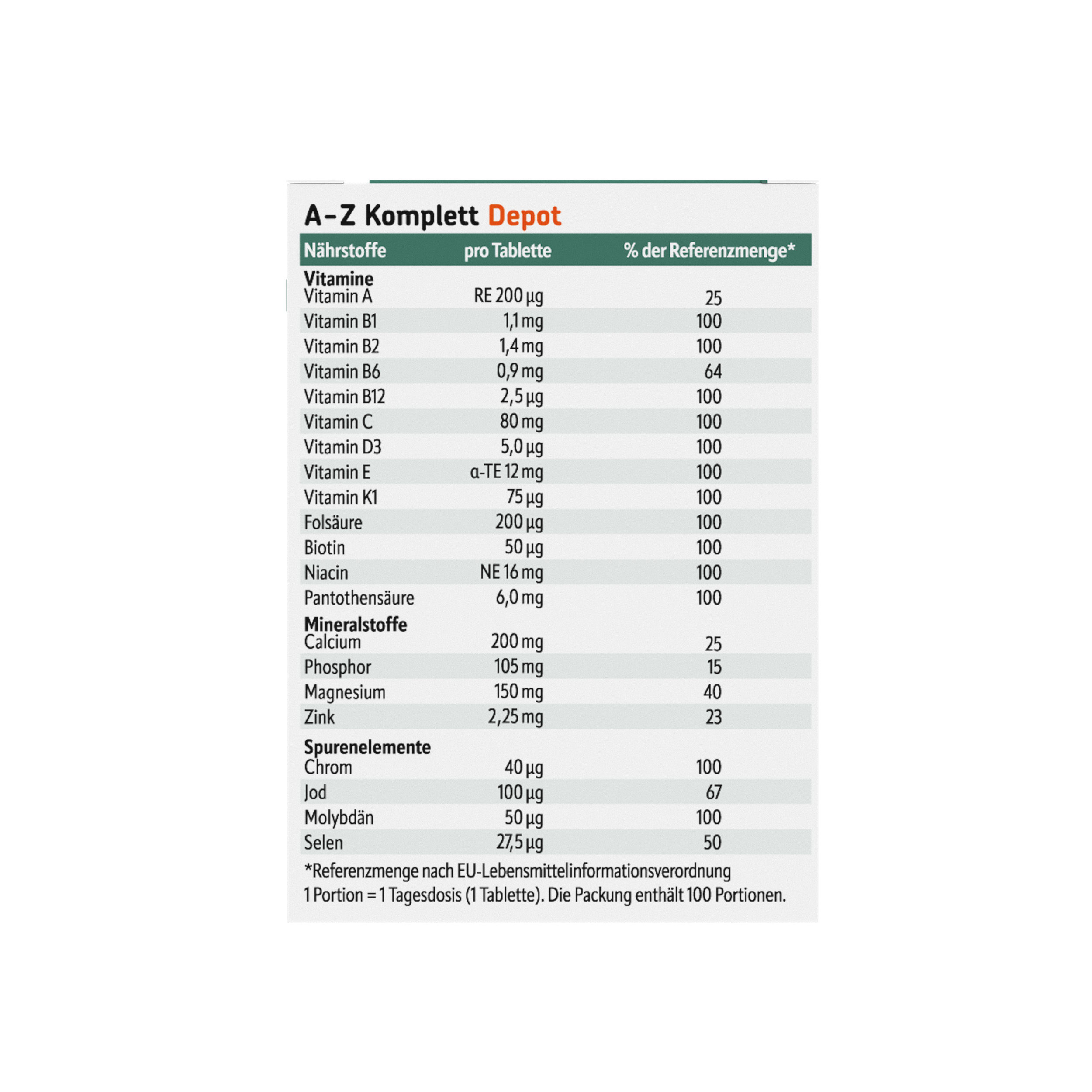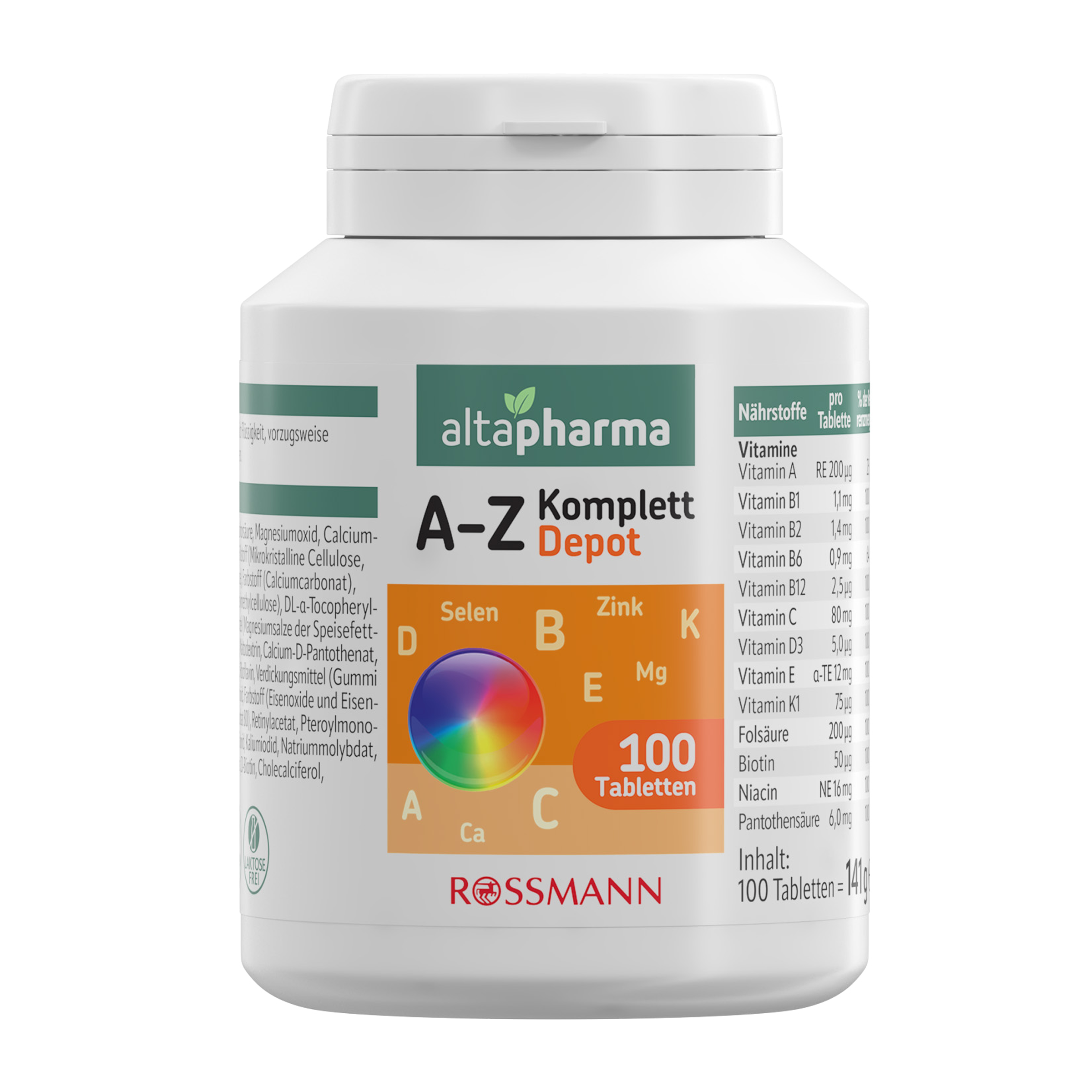 Vápenaté soli kyseliny fosforečné, oxid hořečnatý, uhličitan vápenatý, plnidlo: celulosa, kyselina L-askorbová, maltodextrin, nikotinamid, DL-α-tokoferyl-acetát, protispékavé látky: hořečnaté soli mastných kyselin, talek; D-pantothenát vápenatý, oxid zinečnatý, pyridoxin-hydrochlorid, riboflavin, thiamin-hydrochlorid, retinyl-acetát, kyselina pteroylmonoglutamová, leštící látka: hydroxypropylcelulosa; chlorid chromitý, jodid draselný, molybdenan sodný, selenan sodný, biotin, emulgátor: polysorbát 80; fytomenadion, cholekalciferol, barviva: oxid titaničitý, oxidy a hydroxidy železa; kyanokobalamin.