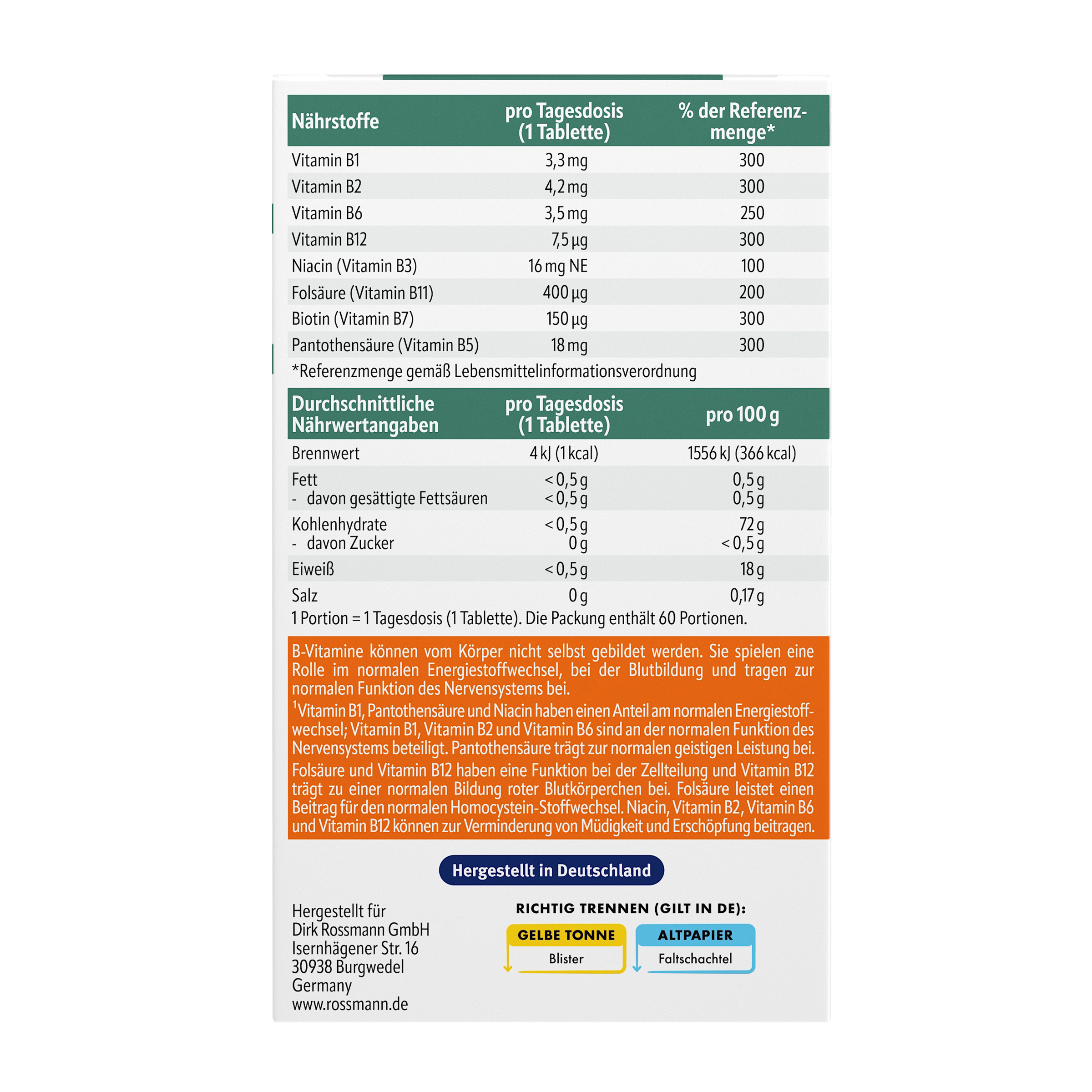 Tabletky obsahují velké množství vitamínů, které mají pro naše tělo různé blahodárné účinky. Vitamín B1, kyselina pantothenová a niacin přispívají k normálnímu fungování metabolismu; vitamin B1, vitamin B2 a vitamin B6 se podílejí na normální činnosti nervového systému. Kyselina pantothenová přispívá k duševní rovnováze. Kyselina listová a vitamin B12 hrají roli při normální tvorbě krve a jsou důležité pro vývoj genetického materiálu a dělení buněk, a tedy i pro proces nepřetržité regenerace organismu. Kyselina listová také přispívá k růstu mateřské buněčné tkáně během těhotenství. Normální metabolismus homocysteinu doplňují vitamin B6, vitamin B12 a kyselina listová. Homocystein se vyskytuje v metabolismu bílkovin. Niacin, vitamin B2, vitamin B6 a vitamin B12 mohou pomoci snížit únavu a vyčerpání.