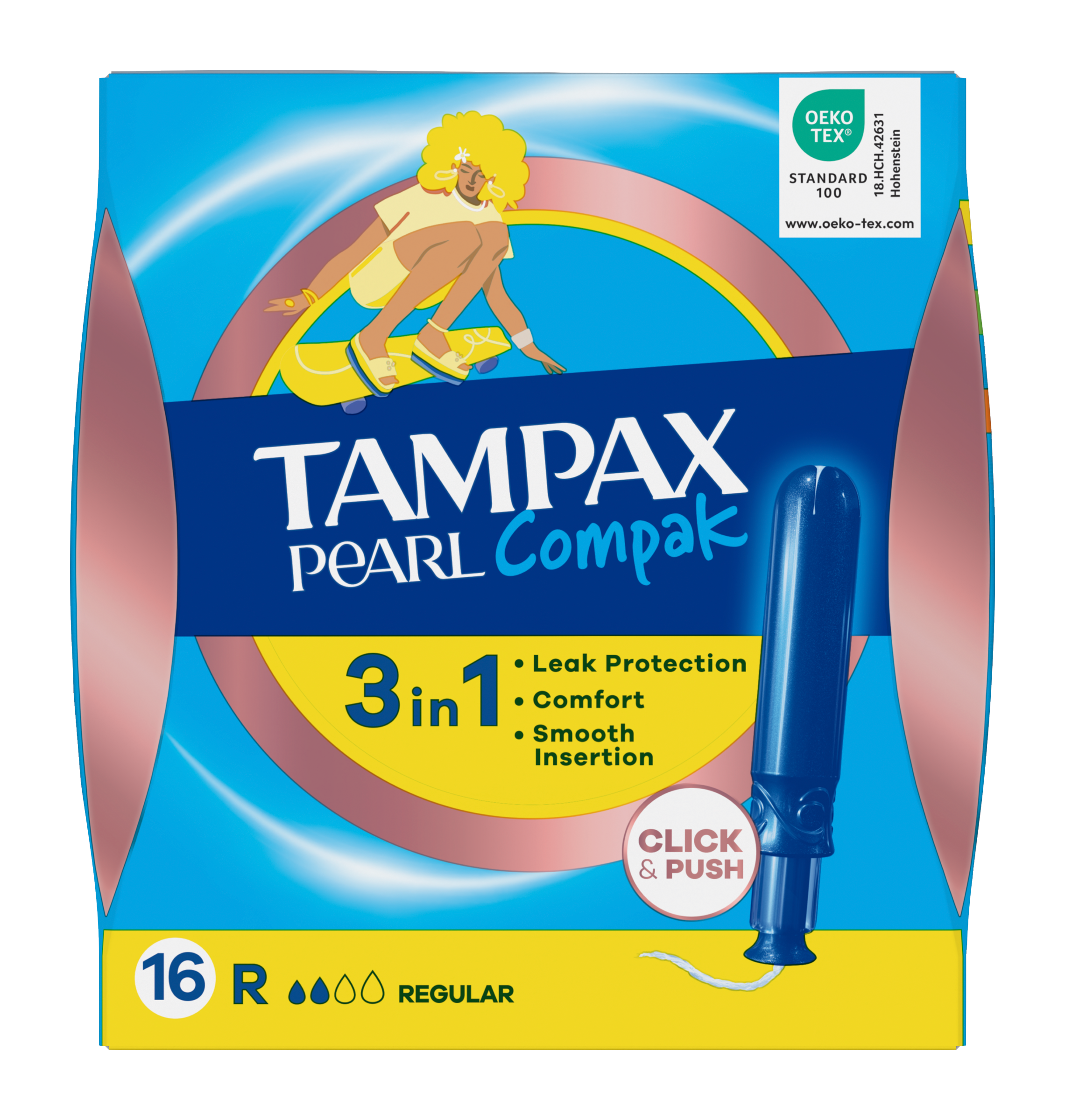 Tampony Tampax Pearl Compak jsou nejlepší tampony Tampax pro komfort, ochranu a diskrétnost. Jsou neparfemované. Tampony Tampax Pearl Compak mají kompaktní a diskrétní hladký plastový aplikátor se zaoblenou špičkou, který umožňuje pohodlné zavádění. Protiskluzová úprava usnadňuje držení aplikátoru a zavedení tamponu na místo. Tampony Tampax Pearl Compak obsahují technologii MotionFit, takže se uvnitř šetrně roztáhnou, aby se přizpůsobily jedinečnému tvaru těla. Navíc mají šňůrku se speciálním výpletem, která pomáhá zabraňovat protečení ještě předtím, než k němu dojde. Každý tampon Tampax Pearl Compak má výrazný barevný obal, který vydrží nošení v kabelce a snadno a potichu se otevírá, takže zaručuje naprostou diskrétnost. Tampax Pearl Compak Regular je nejlepší tampon Tampax pro dny se lehké až středně silné intenzitou krvácení během menstruace. Tampony Tampax Pearl Compak jsou gynekologicky testovány. Asociace Oeko-Tex také provedla jejich nezávislé testování na přítomnost škodlivých látek. Více informací o našich výrobcích najdete na našich webových stránkách.