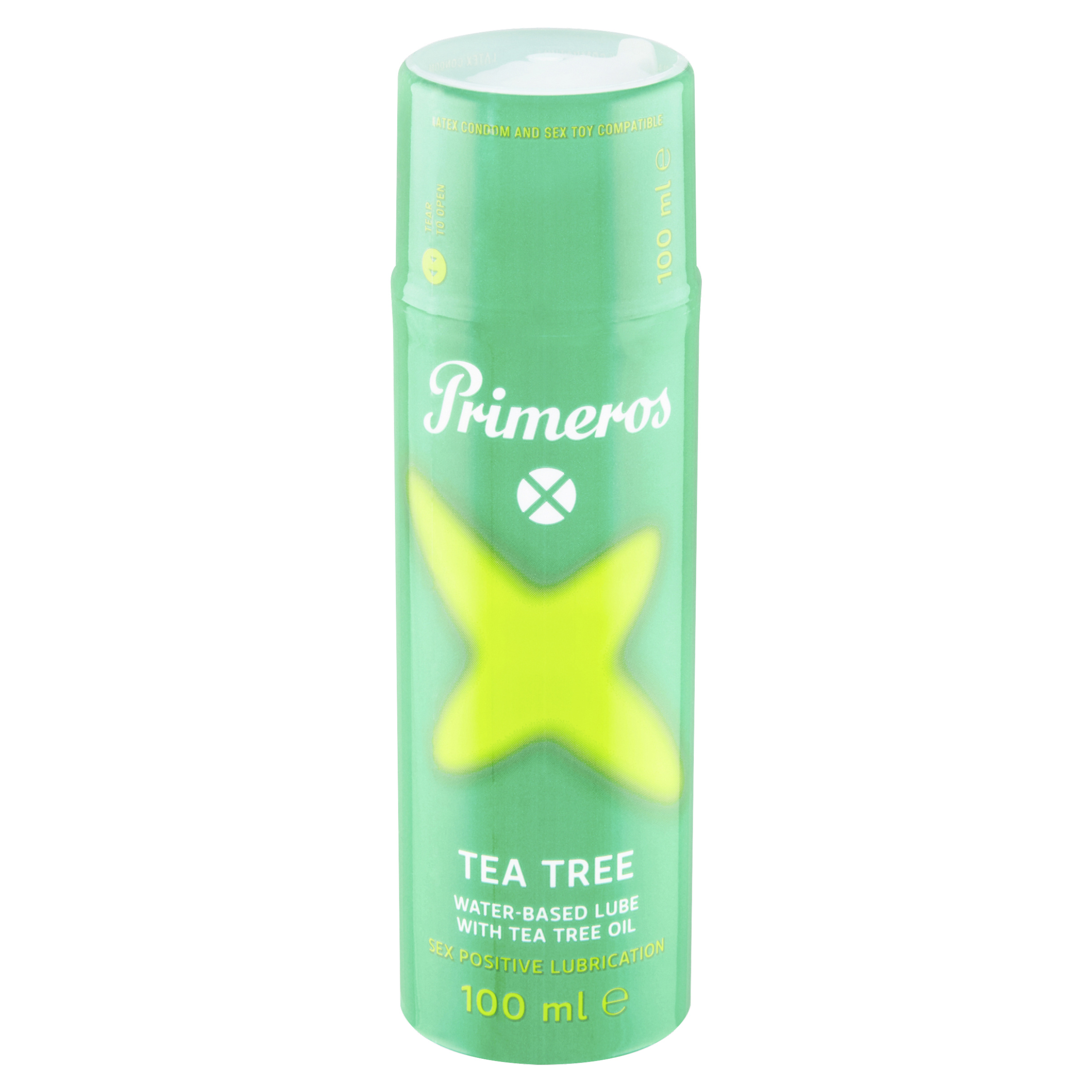 Primeros Tea Tree lubrikační gel na vodní bázi s výtažkem z čajovníku australského, vhodný pro vegany.